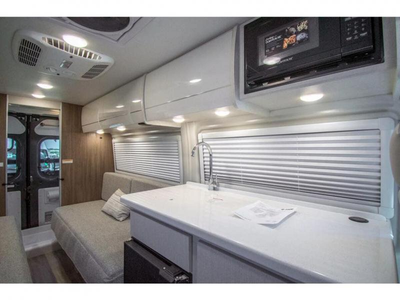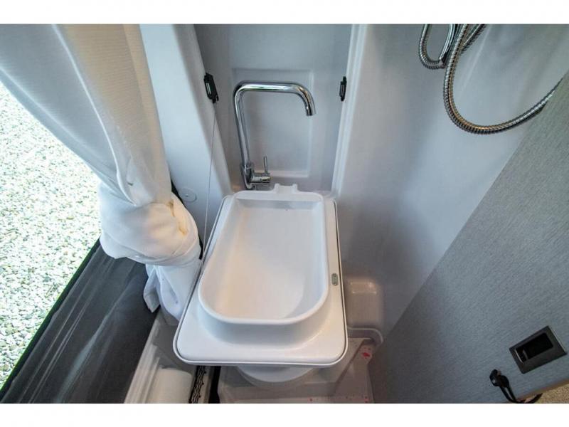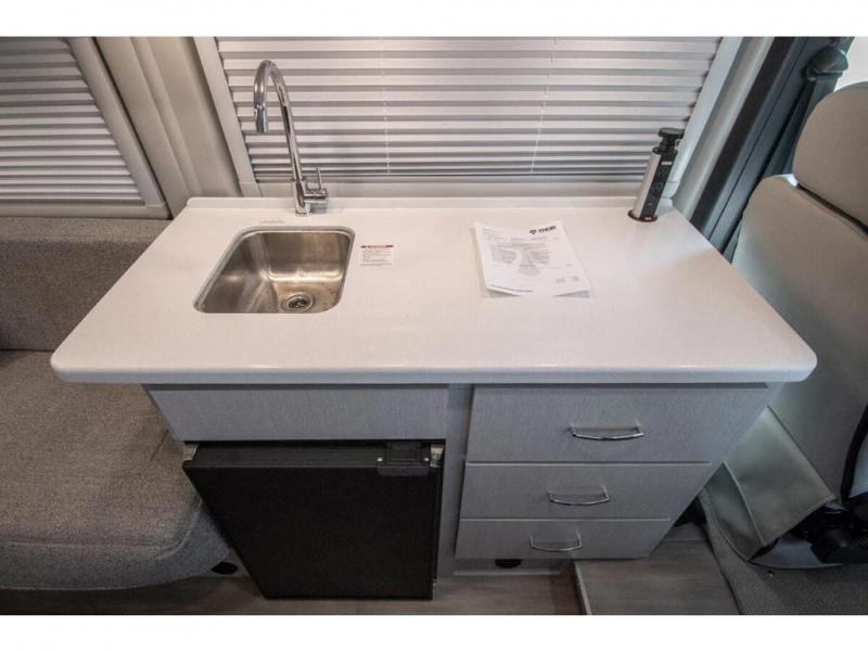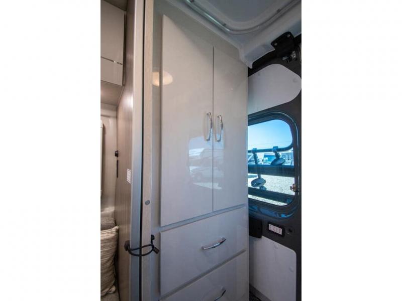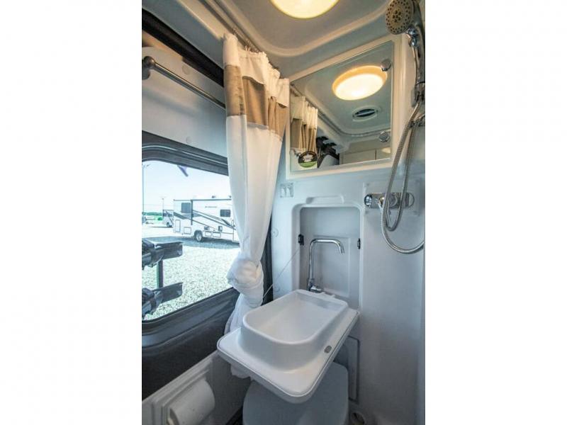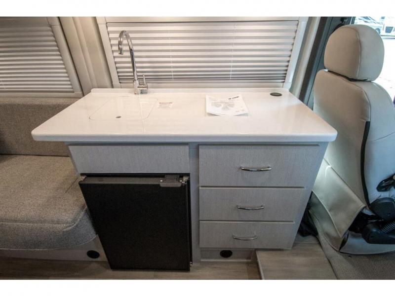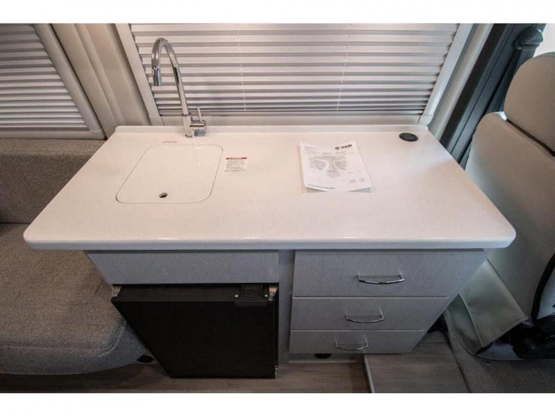 This Tellaro Class B gas motorhome has a very helpful kitchen with a pop-out outlet, a flip-up countertop, and a microwave oven! There is a removable sofa table so that you can combine the two twin-size beds together to create one large 74" x 80" expanding sleeper sofa bed. There are pocket doors at the wet bath's entrance to utilize space well, and inside the bathroom you will find a wardrobe and drawers to keep your linens and toiletries safely tucked away.