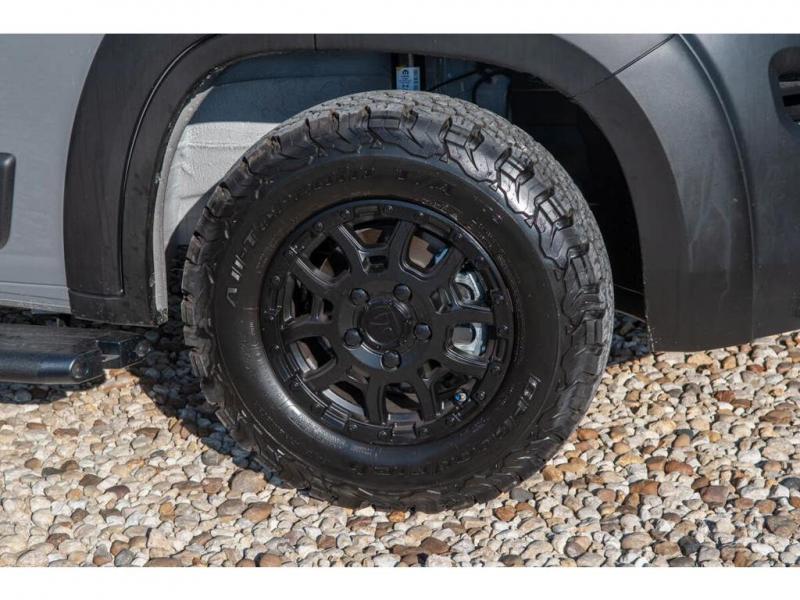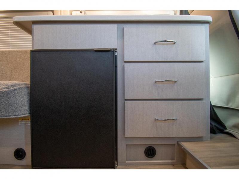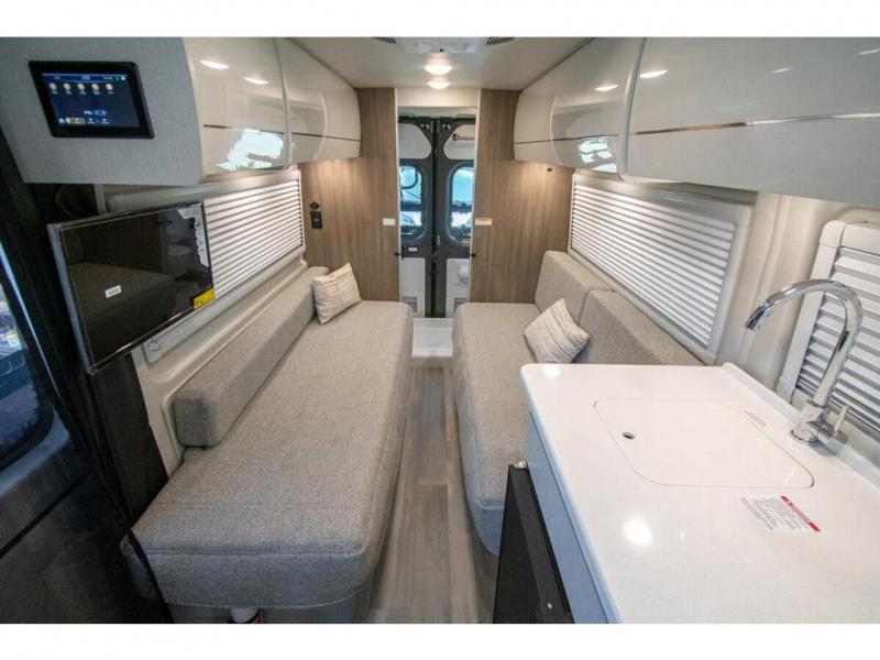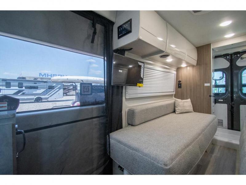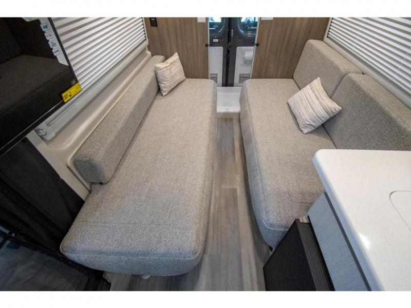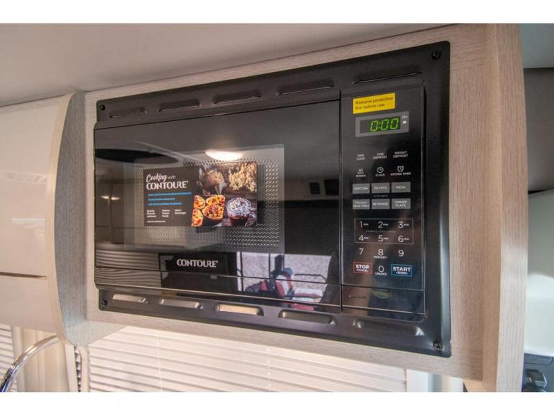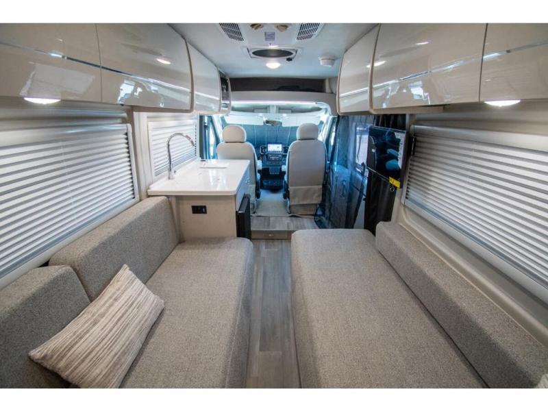 This Tellaro Class B gas motorhome has a very helpful kitchen with a pop-out outlet, a flip-up countertop, and a microwave oven! There is a removable sofa table so that you can combine the two twin-size beds together to create one large 74" x 80" expanding sleeper sofa bed. There are pocket doors at the wet bath's entrance to utilize space well, and inside the bathroom you will find a wardrobe and drawers to keep your linens and toiletries safely tucked away.
