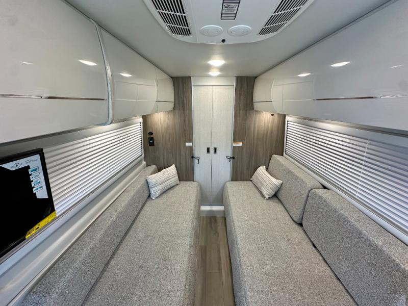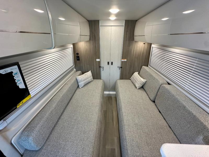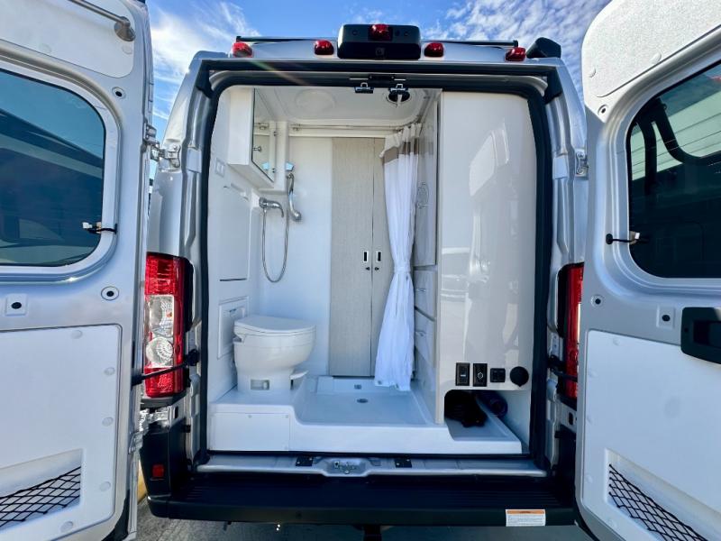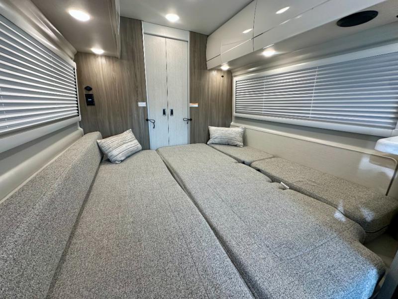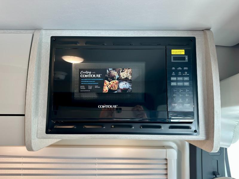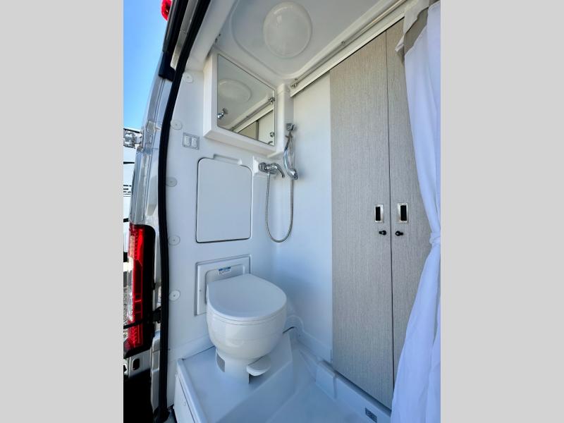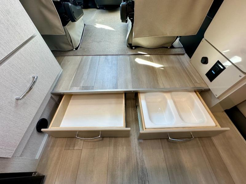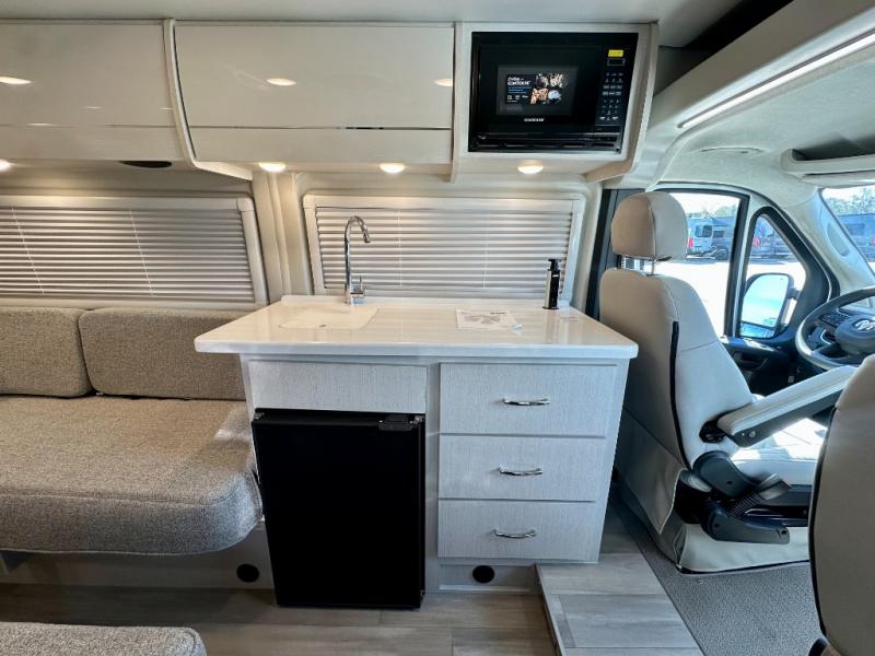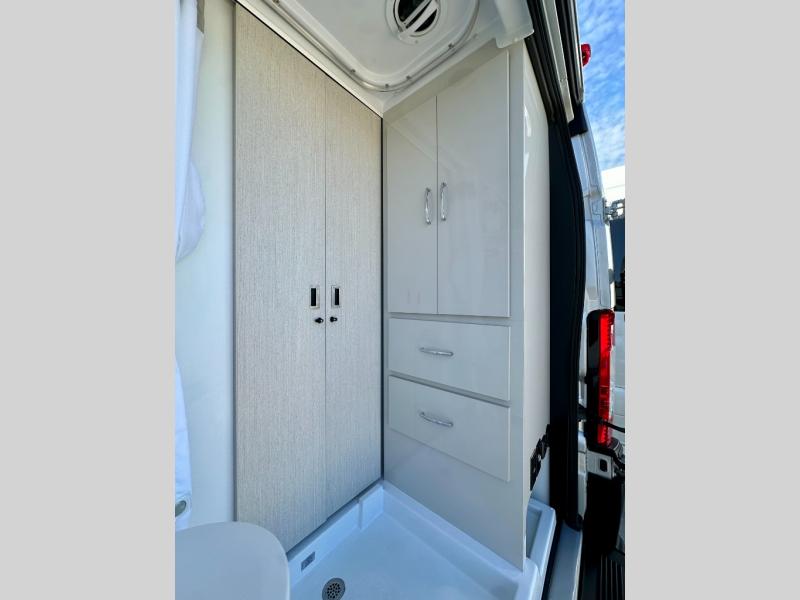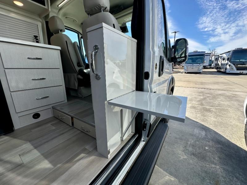 This Tellaro Class B gas motorhome has a very helpful kitchen with a pop-out outlet, a flip-up countertop, and a microwave oven! There is a removable sofa table so that you can combine the two twin-size beds together to create one large 74" x 80" expanding sleeper sofa bed. There are pocket doors at the wet bath's entrance to utilize space well, and inside the bathroom you will find a wardrobe and drawers to keep your linens and toiletries safely tucked away.