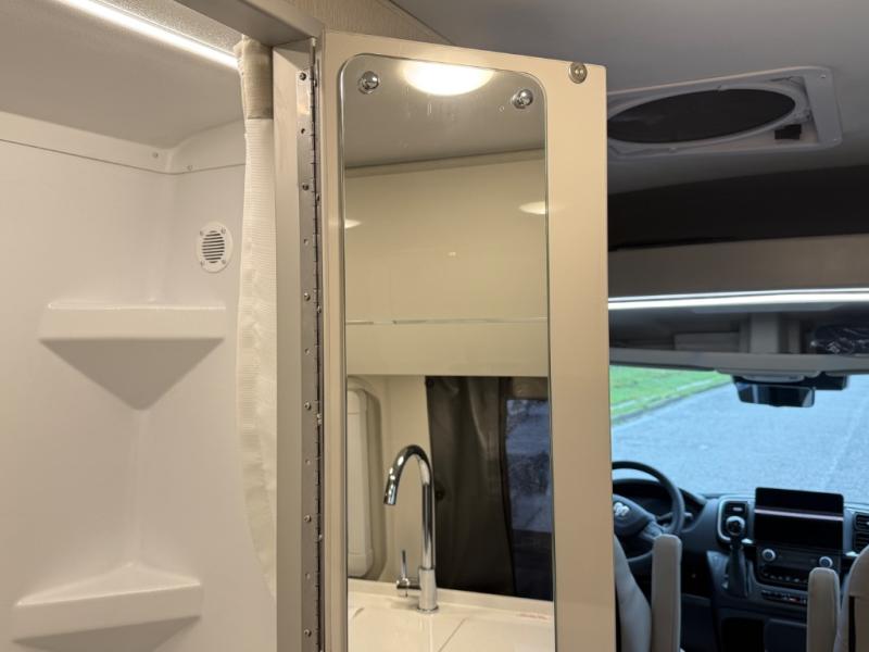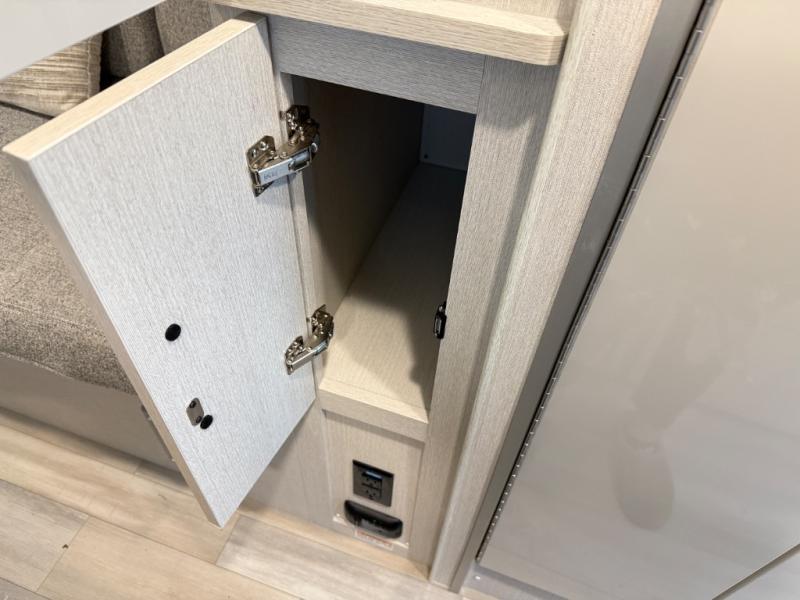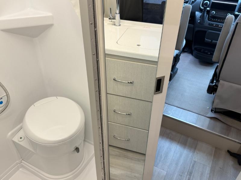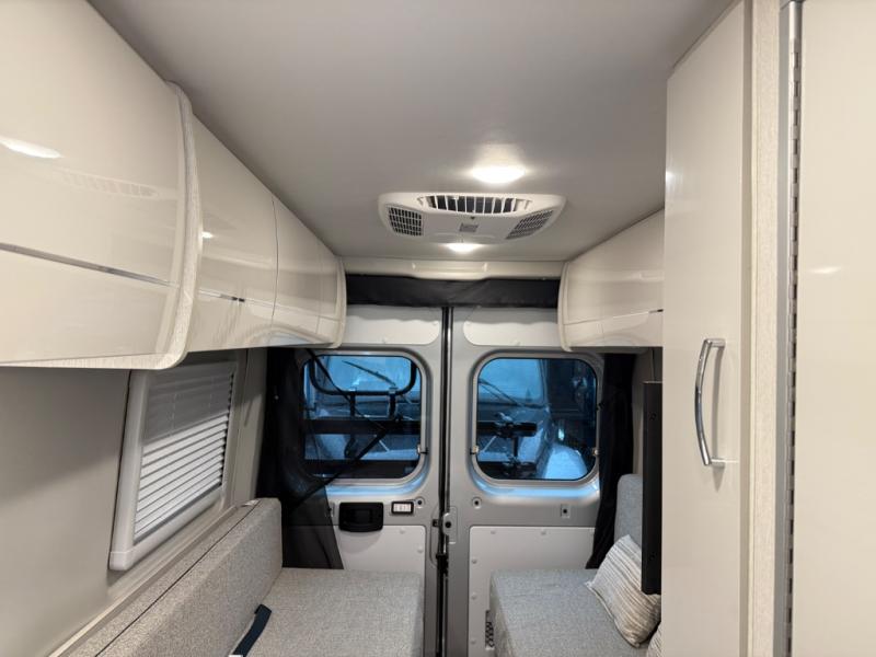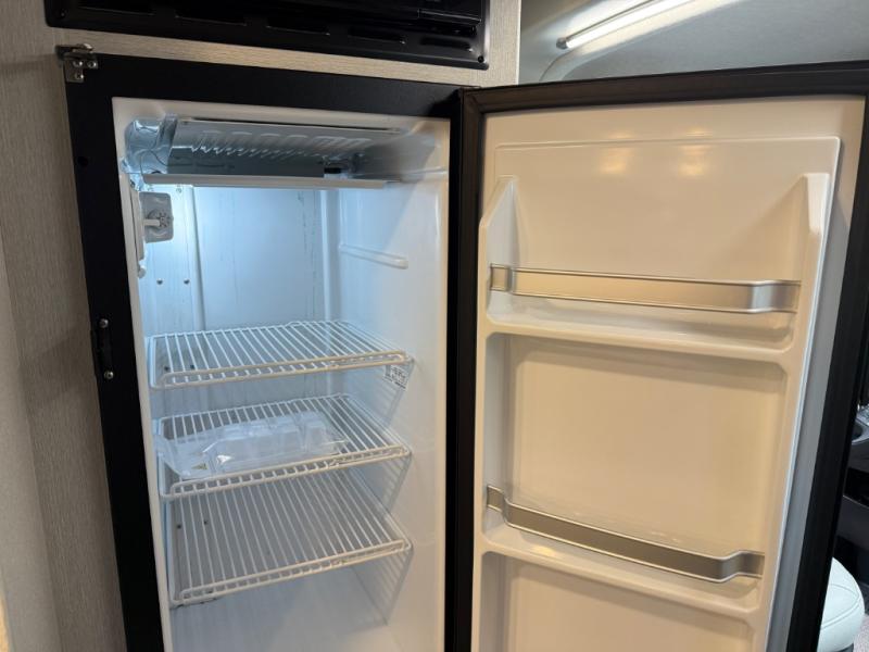 You'll love traveling in this cozy coach for two! The rear sofas convert to a full-width bed when you're ready, and an optional retractable roof rack with Sky Bunk can be added if you're needing additional sleeping space. You can whip up your best breakfast on the single burner induction cooktop or in the microwave oven, and there is a double door refrigerator to keep food fresh. The wet bath includes a cassette toilet, power bath vent with a wall switch and a deluxe shower curtain so you can freshen up each day.