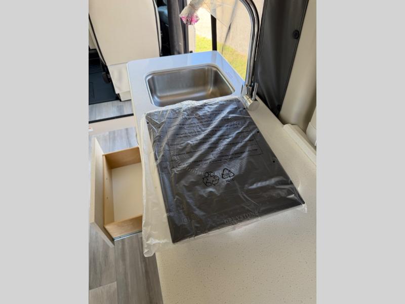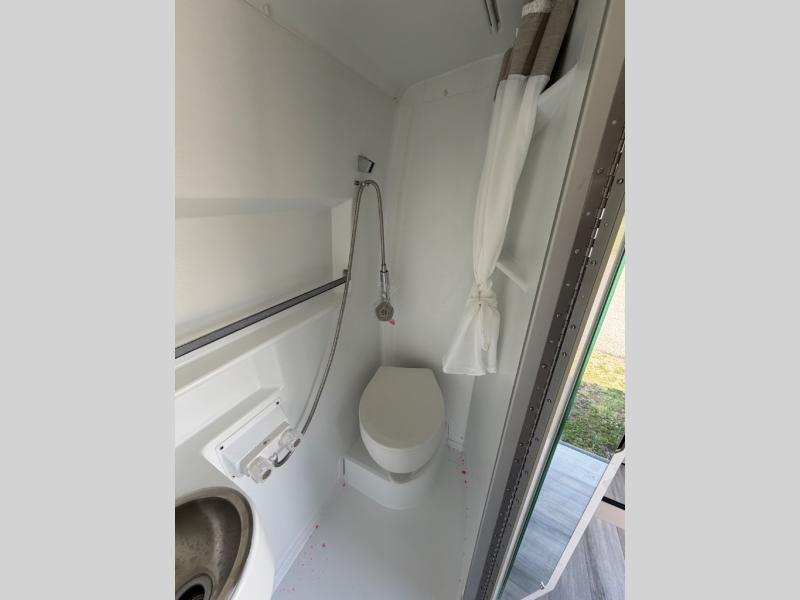 Enjoy trips across the state or country in this coach! There is a rear sofa/bed system that gives you a place to relax plus a 74" x 71" sleeping area. The 48" x 26" wet bath with a power bath vent lets you freshen up before starting your day, then you can make breakfast on the single burner induction cooktop or in the microwave oven. There is also a double door refrigerator to store your food, and a removable table in front of the sofa provides a place to dine together.