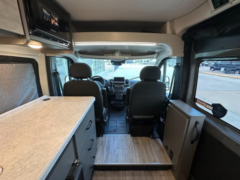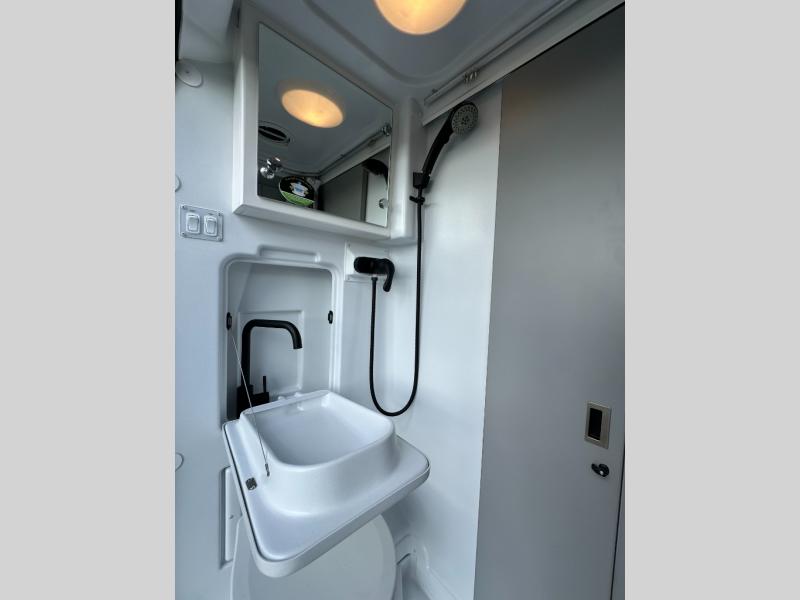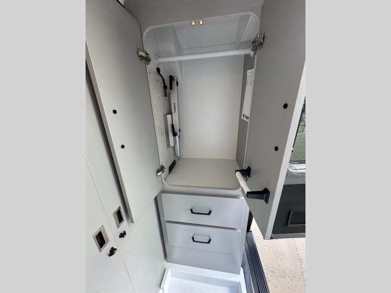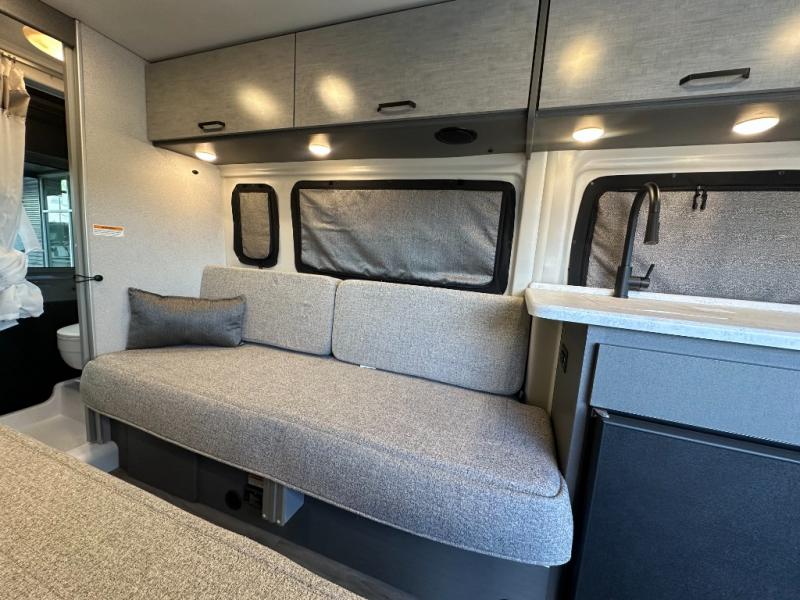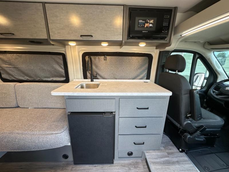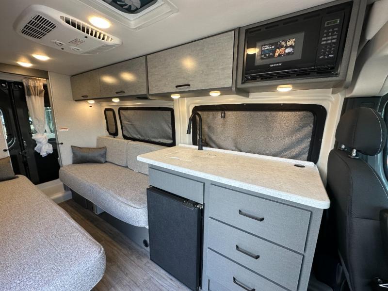 This Tellaro Sport Class B gas motorhome has a very helpful kitchen with a pop-out outlet, a flip-up countertop, and a microwave oven! There is a removable sofa table so that you can combine the two twin-size beds together to create one large 74" x 80" expanding sleeper sofa bed. There are pocket doors at the wet bath's entrance to utilize space well, and inside the bathroom you will find a wardrobe and drawers to keep your linens and toiletries safely tucked away.