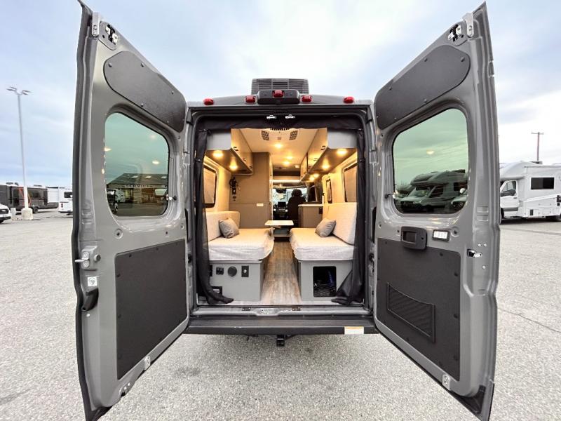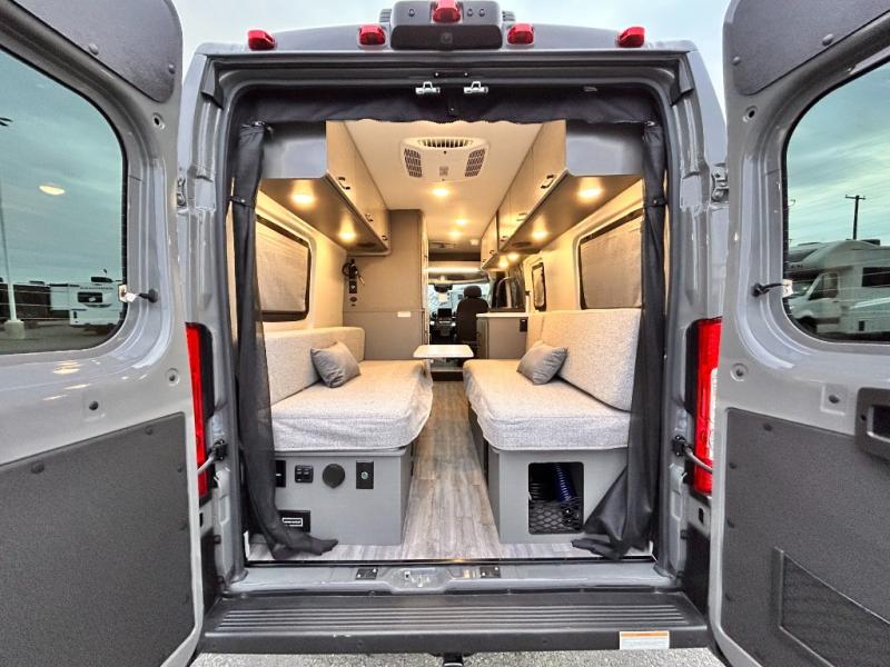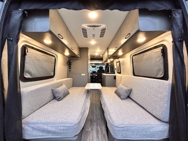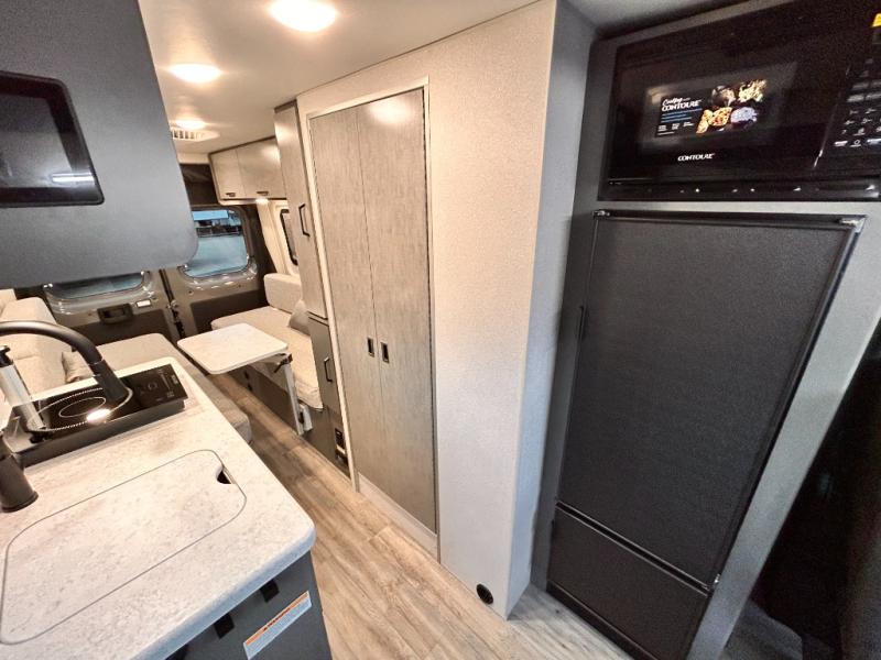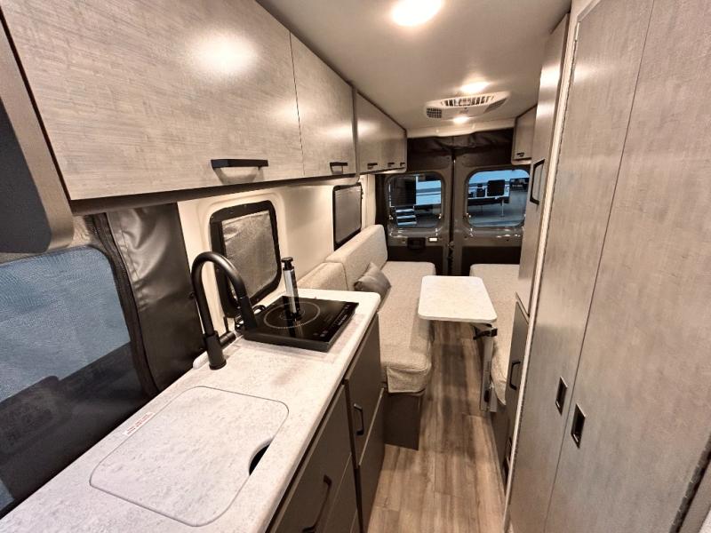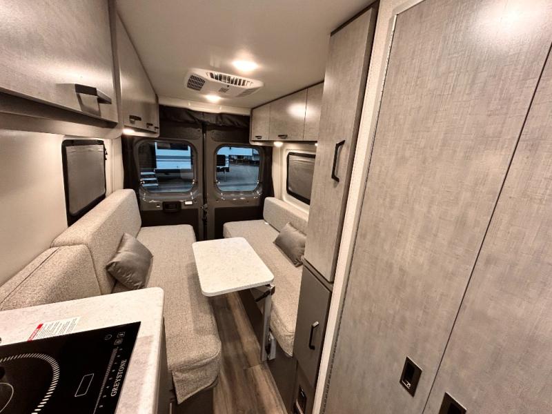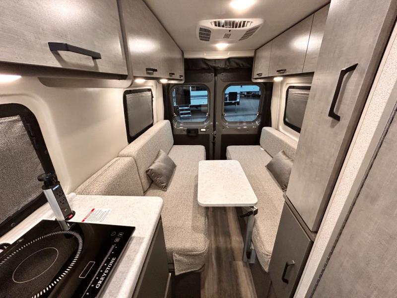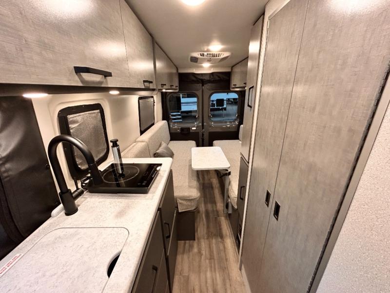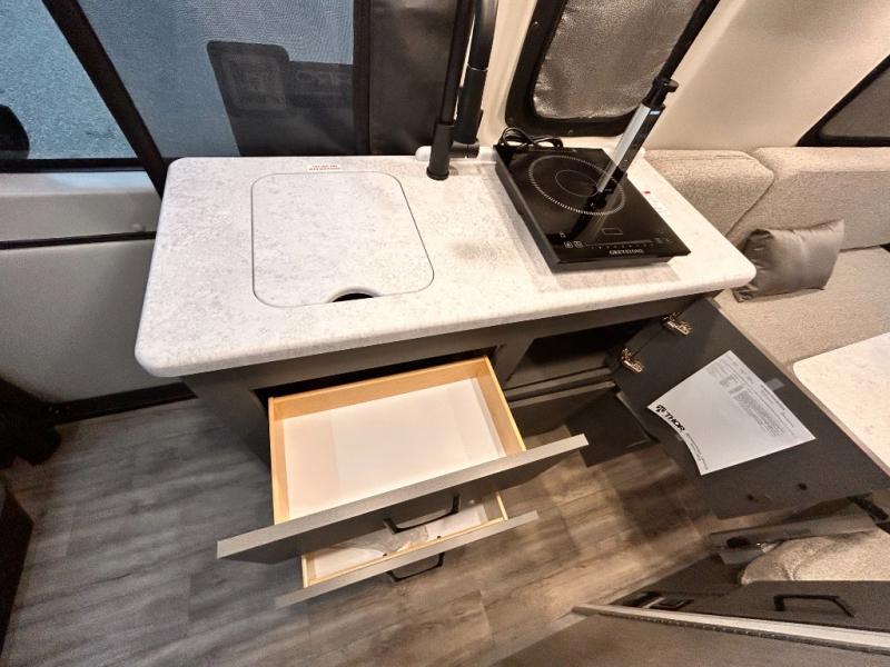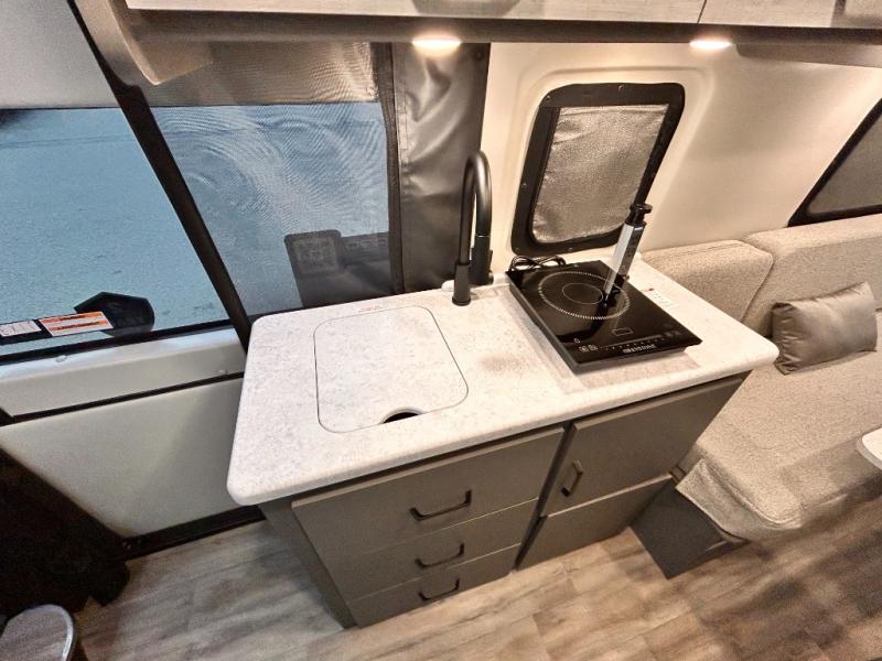 You'll love traveling in this cozy coach for two! The rear sofas convert to a full-width bed when you're ready, and an optional retractable roof rack with Sky Bunk can be added if you're needing additional sleeping space. You can whip up your best breakfast on the single burner induction cooktop or in the microwave oven, and there is a double door refrigerator to keep food fresh. The wet bath includes a cassette toilet, power bath vent with a wall switch and a deluxe shower curtain so you can freshen up each day.