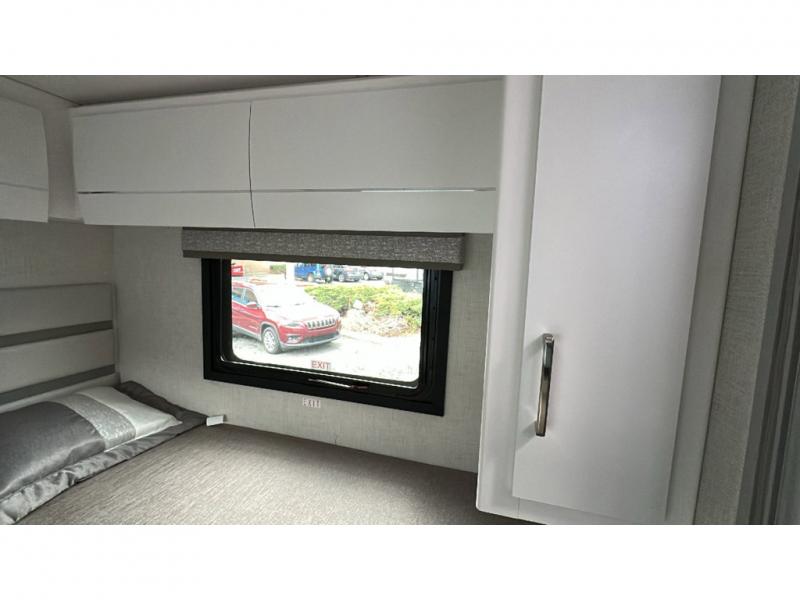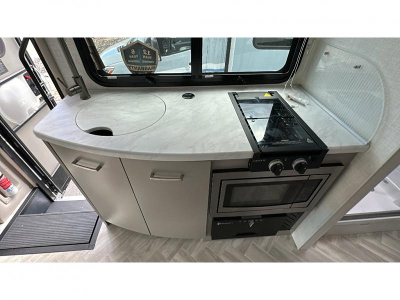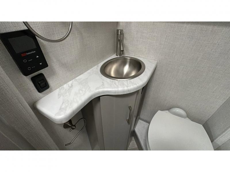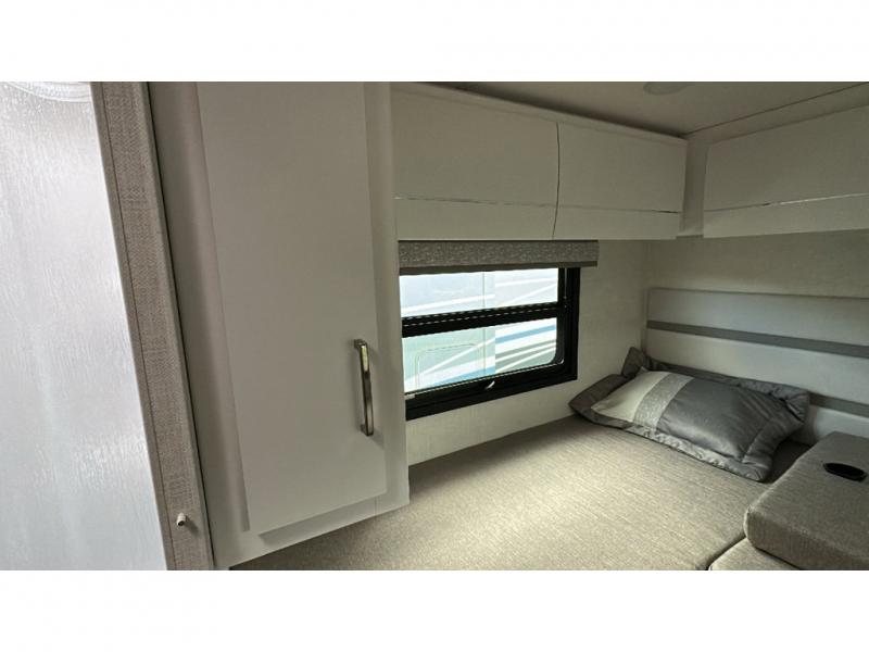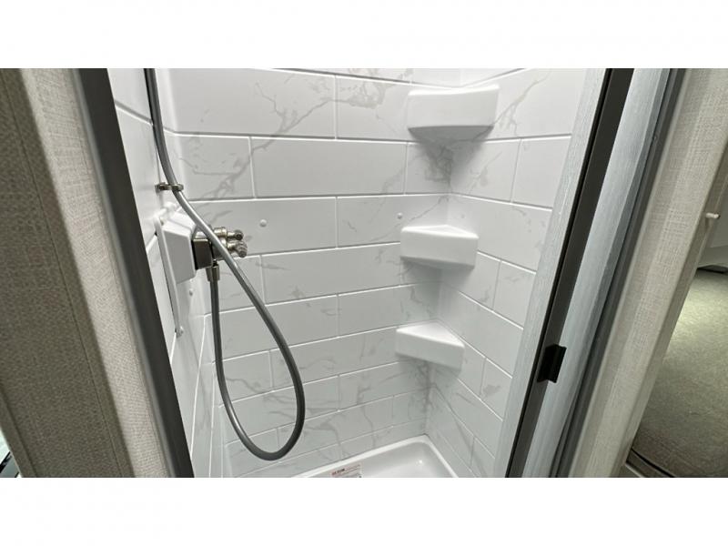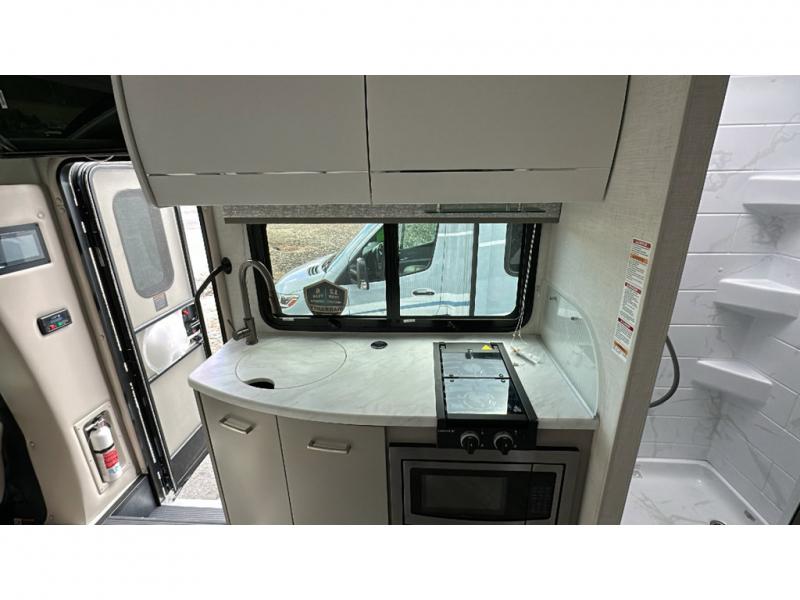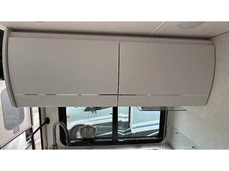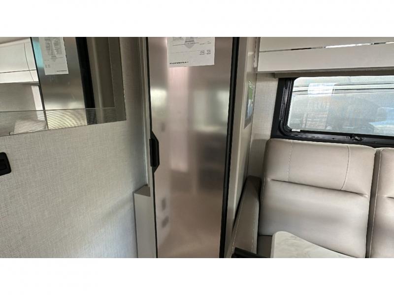 Enjoy a relaxing road trip in this motorhome! There are lots of conveniences in the kitchen. You'll find a 12V refrigerator with auto generator start, pressed laminate countertops with an under-mounted sink that has a sink cover, a two-burner gas cooktop with a glass cover and electric start, a convection microwave with an air fryer, and a large stainless steel single-bowl sink and faucet with pull-down sprayer. The separated bathroom is also accommodating, and it features a skylight above the 24" x 32" shower with curved anti-microbial shower curtain across from a private foot-flush toilet and sink. The rear 31" x 76" twin beds can convert into a king bed with closets at the foot of the beds and a privacy curtain to draw for a comfortable night's rest!