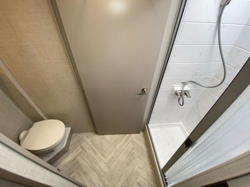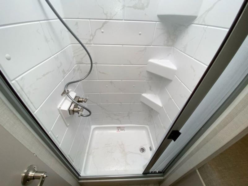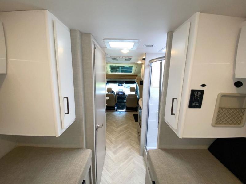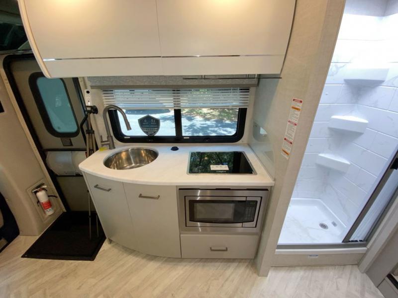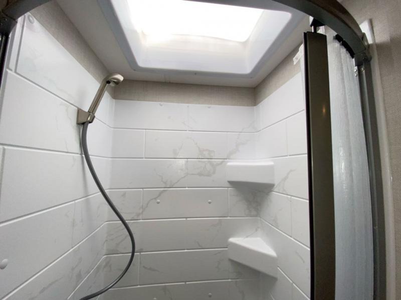 Enjoy a relaxing road trip in this motorhome! There are lots of conveniences in the kitchen. You'll find a 12V refrigerator with auto generator start, pressed laminate countertops with an under-mounted sink that has a sink cover, a two-burner gas cooktop with a glass cover and electric start, a convection microwave with an air fryer, and a large stainless steel single-bowl sink and faucet with pull-down sprayer. The separated bathroom is also accommodating, and it features a skylight above the 24" x 32" shower with curved anti-microbial shower curtain across from a private foot-flush toilet and sink. The rear 31" x 76" twin beds can convert into a king bed with closets at the foot of the beds and a privacy curtain to draw for a comfortable night's rest!