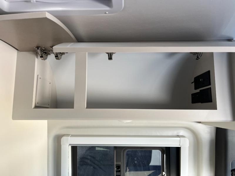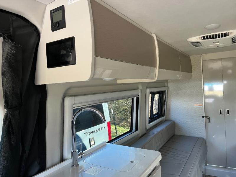 Inside, the Tranquility is thoughtfully designed to maximize comfort and efficiency in a compact space. The rear sleeping area provides a comfortable bed where you can relax after a day of exploring. Overhead cabinetry and smart storage compartments help keep your gear organized while still maintaining a clean and open interior.