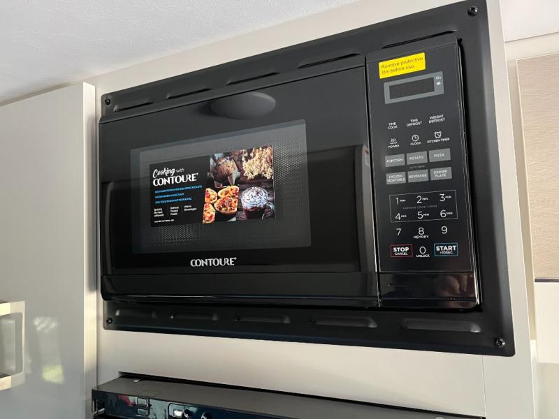 The kitchen area includes a refrigerator, portable cooktop, sink, and microwave, giving you the ability to prepare meals wherever your journey takes you. The layout makes it easy to cook simple meals whether you're parked at a campground or enjoying a remote scenic stop.