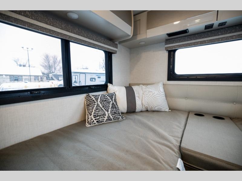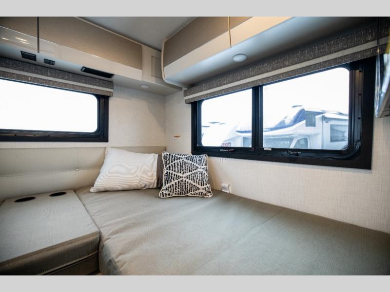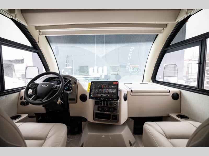 The front cab of this Vegas Class A gas motorhome is excellently appointed with a stow-away coffee table, reclining/swivel leatherette captain's chairs, and a 14" touchscreen dash radio with Bluetooth, Android Auto, and Apple CarPlay! A single slide holds the 68" sofa bed so that it isn't in your way as you walk back to the semi-private bedroom. The kitchen offers you a two burner cooktop to sauté veggies, and there are two Smart TVs to provide you with all the entertainment you could need. Within the full bath you'll find a 27" x 27" radius shower with a skylight, a stainless steel bath sink, and a 12V power bath vent to keep this space fresh.