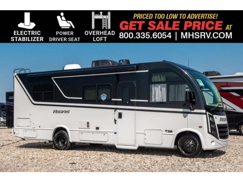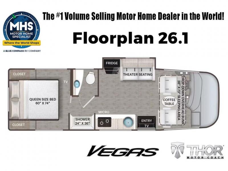 MSRP $188,259. New 2026 Thor Motor Coach Vegas RUV Model 26.1. This RV measures approximately 27 feet 2 inches in length and features a drop-down overhead loft, slide-out and a bedroom TV. The Vegas also features the new Ford E-Series chassis with a 7.3L V-8 engine and a six speed automatic transmission. This beautiful RV features the optional Electric Stabilizing system, exterior pull-out tray w/griddle, paint, power drop down overhead loft and power drivers seat. The Vegas also boasts an impressive list of standard features including the Winegard Connect 2.0 WiFi, rotary battery disconnect switch, adjustable shelving bracketry, BM Pro Multiplex system, power privacy shade on windshield, tankless water heater, touchscreen radio that features navigation and back-up monitor, frameless windows, heated remote exterior mirrors with integrated sideview cameras, lateral power patio awning with integrated LED lighting and much more. Shop hundreds of class A motorhomes all at 1 location! Choose from Thor A.C.E. – Resonate – Hurricane – Windsport – Luminate – Indigo – Vegas – Axis – Challenger – Miramar Fleetwood Flair – Fortis – Flex – Bounder - Forest River Georgetown - FR3 – Entegra Coach Vision – Vision XL – Emblem – Holiday Rambler Admiral – Eclipse – Invicta – Vacationer - and much more. We also sell quality pre-owned models such as Jayco Alante SE – Alante – Precept – Precept Prestige – Tiffin Allegro Open Road – Newmar Canyon Star – Bay Star – Winnebago Vista – Sunstar – Adventurer – Coachmen Mirada – Pursuit - Encore and much more. Visit MHSRV.com for our complete line-up and the sale prices that have made us the #1 volume selling motor home dealership in the world 12 years in a row! For additional details on this unit and our entire inventory including brochures, window sticker, videos, photos, reviews & testimonials as well as additional information about Motor Home Specialist and our manufacturers please visit us at MHSRV.com or call 800-335-6054. At Motor Home Specialist, we DO NOT charge any prep or orientation fees like you will find at other dealerships. All sale prices include a 200-point inspection, interior & exterior wash, detail service and a fully automated high-pressure rain booth test and coach wash that is a standout service unlike that of any other in the industry. You will also receive a thorough coach orientation with an MHSRV technician, a night stay in our delivery park featuring landscaped and covered pads with full hook-ups and much more! Read Thousands upon Thousands of 5-Star Reviews at MHSRV.com and See What They Had to Say About Their Experience at Motor Home Specialist. WHY PAY MORE? WHY SETTLE FOR LESS?