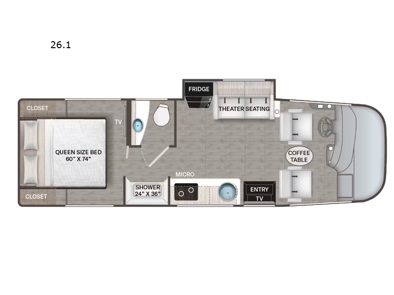 You're going to love the interior and exterior amenities found with this coach! The 73.7 cu. ft. of exterior storage will allow you to bring along hiking and fishing gear, and you can add an optional slide out griddle if you enjoy cooking outdoors. Once you unpack and head inside, you can relax on the theater seating. And a 32" Smart TV is across from the sofa for easy viewing! It will be so easy to prepare meals each day in the kitchen with its two burner gas cooktop and convection microwave with an air fryer, and the 12V double door refrigerator can keep food fresh. You'll appreciate the rear bedroom with a privacy curtain, an RV queen bed, plus dual closets to keep your clothes wrinkle free. This model also includes an independent shower across from the private toilet and sink, allowing two people to freshen up at once!