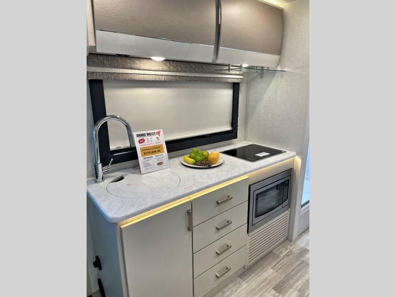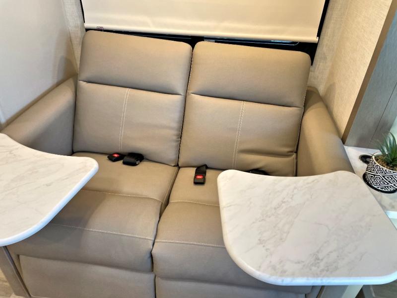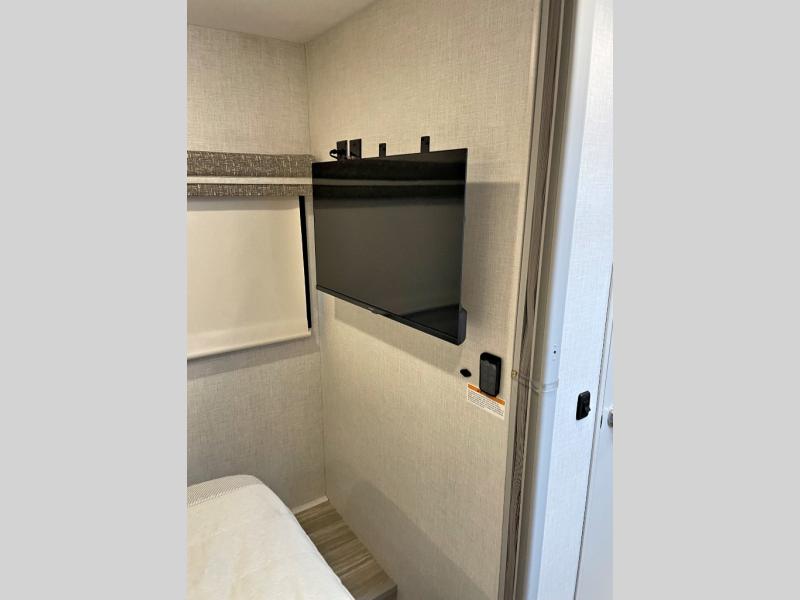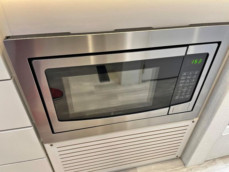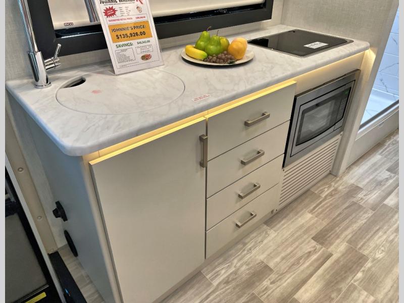 You're going to love the interior and exterior amenities found with this coach! The 73.7 cu. ft. of exterior storage will allow you to bring along hiking and fishing gear, and you can add an optional slide out griddle if you enjoy cooking outdoors. Once you unpack and head inside, you can relax on the theater seating. And a 32" Smart TV is across from the sofa for easy viewing! It will be so easy to prepare meals each day in the kitchen with its two burner gas cooktop and convection microwave with an air fryer, and the 12V double door refrigerator can keep food fresh. You'll appreciate the rear bedroom with a privacy curtain, an RV queen bed, plus dual closets to keep your clothes wrinkle free. This model also includes an independent shower across from the private toilet and sink, allowing two people to freshen up at once!