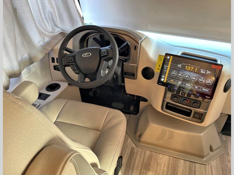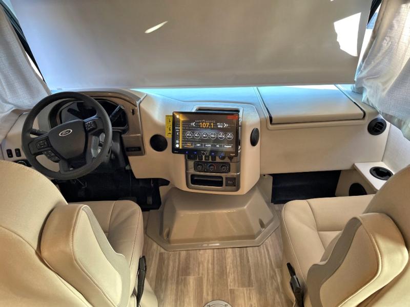 You'll find excellent drivability with the Thor Motor Coach Vegas Class A gas motorhome thanks to the Ford E-Series chassis and 7.3L V8 engine! They allow you to set up camp with ease thanks to the Rapid Camp+ multiplex system which is your all-in-one control center. You won't even have to get up while you're outside relaxing when you want the power patio awning to extend because you can open it with the click of a button on your phone. If you hook up a grill to the exterior LP connection, you'll also have a place to cook while you're outdoors, and the 100W solar panel with a controller helps you get away from the crowds. The HD-MAX exterior with graphics package will catch everyone's eye at the campground, and the premium one-piece domed roof will last through years of use.