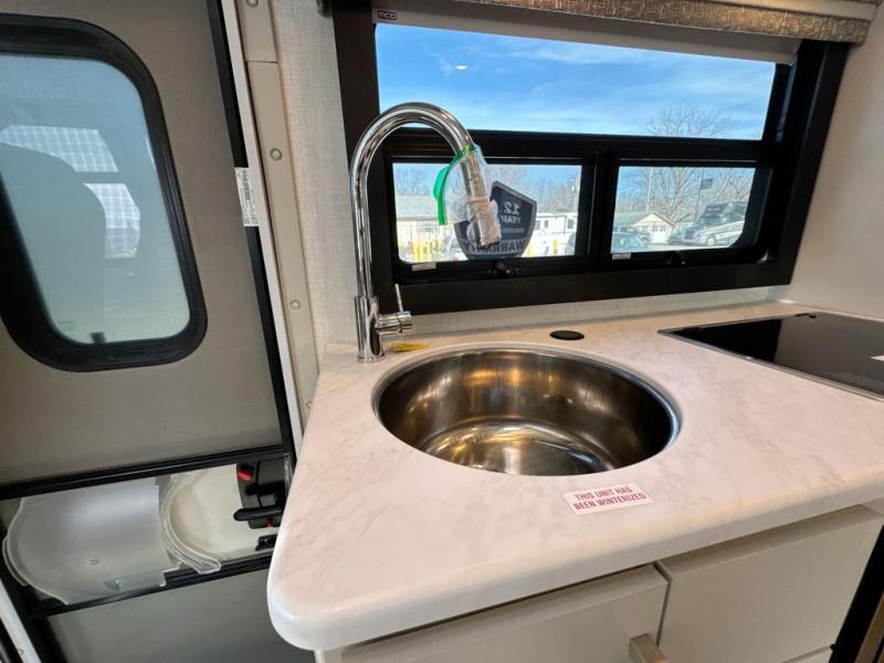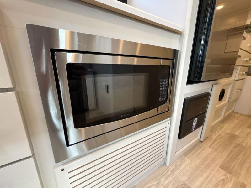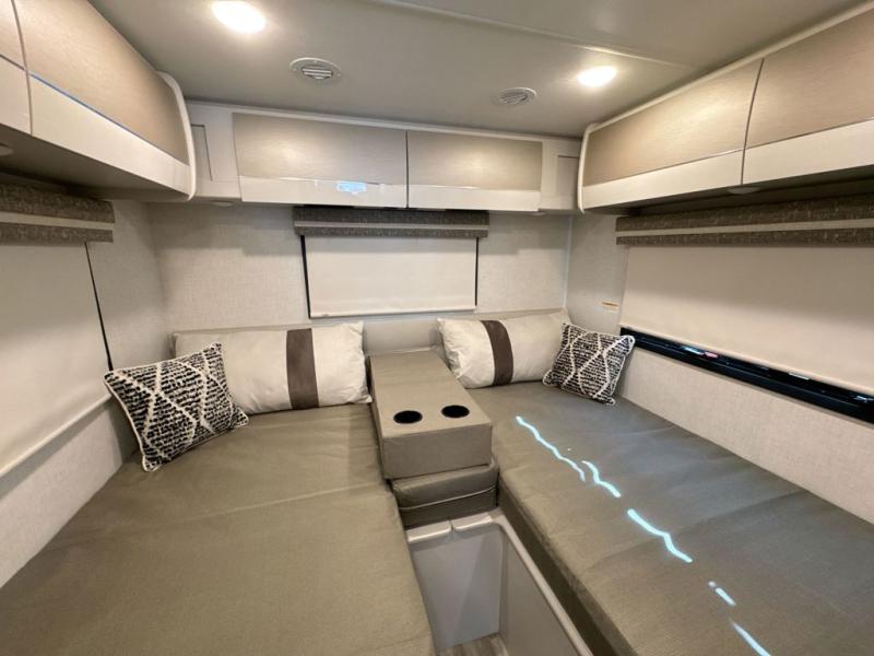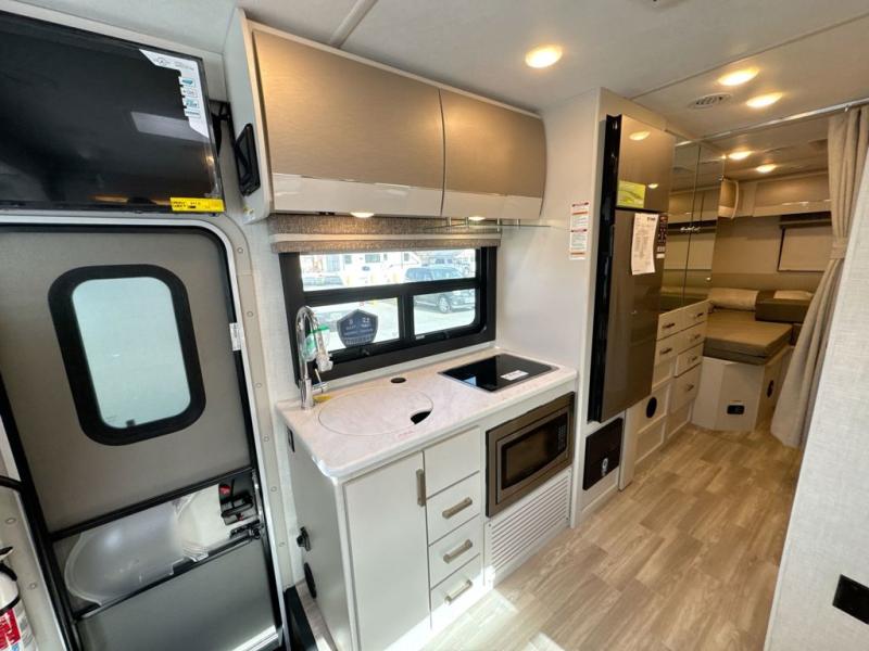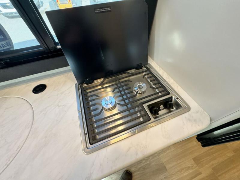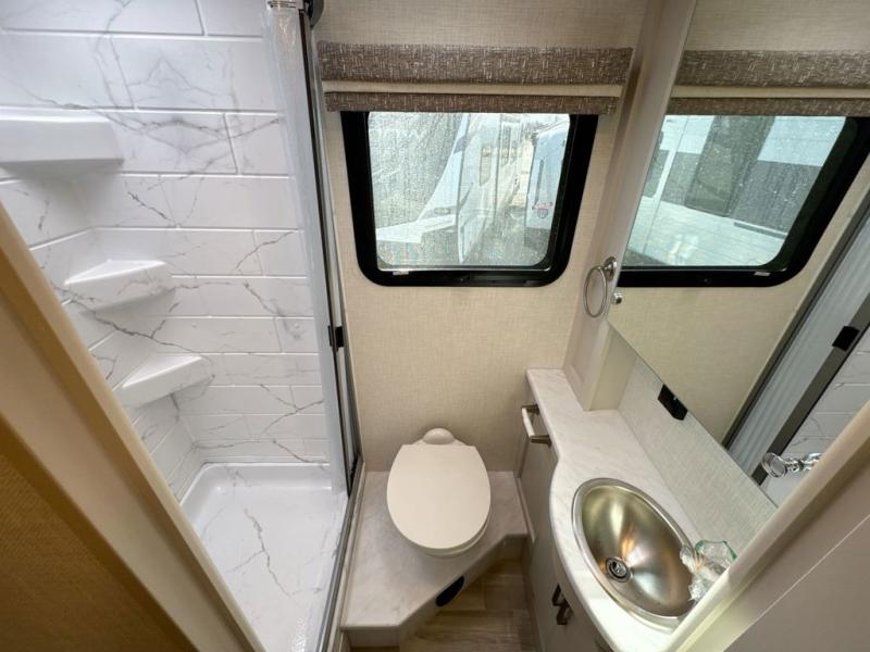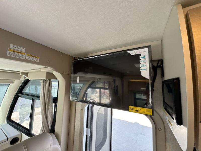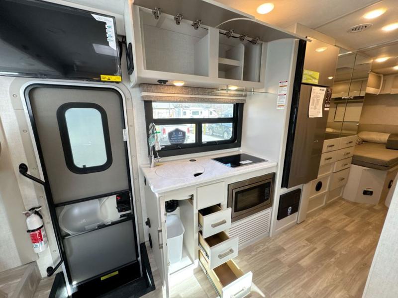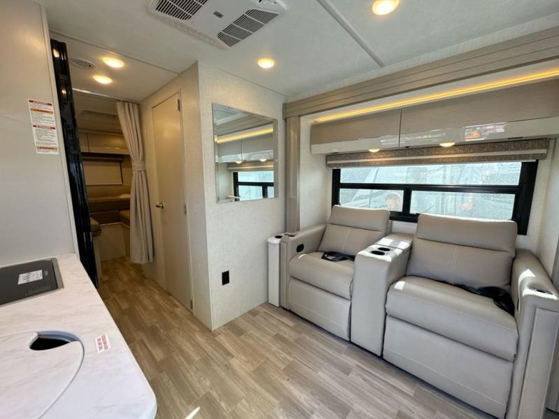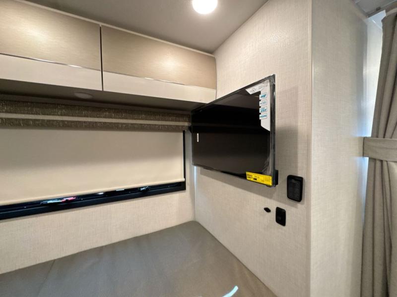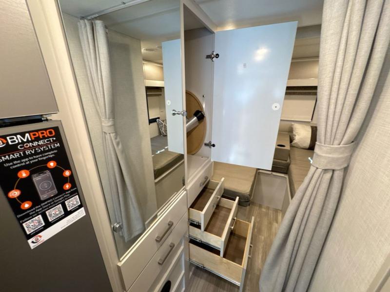 This coach has a similar layout to 24.1, but you'll enjoy theater seating in this model, two closets instead of one, and a larger exterior length for more space! The twin beds with king conversion make it possible to travel as friends or a couple, and there is even a bedroom TV so you can watch movies in bed. In the morning, you can make breakfast on the two burner gas cooktop or in the convection microwave with an air fryer. There is a 12V double door refrigerator to keep your perishables fresh, and you can dine at the theater seating with a removable pedestal table. This coach also includes a drop-down overhead bunk for more sleeping space; how convenient!