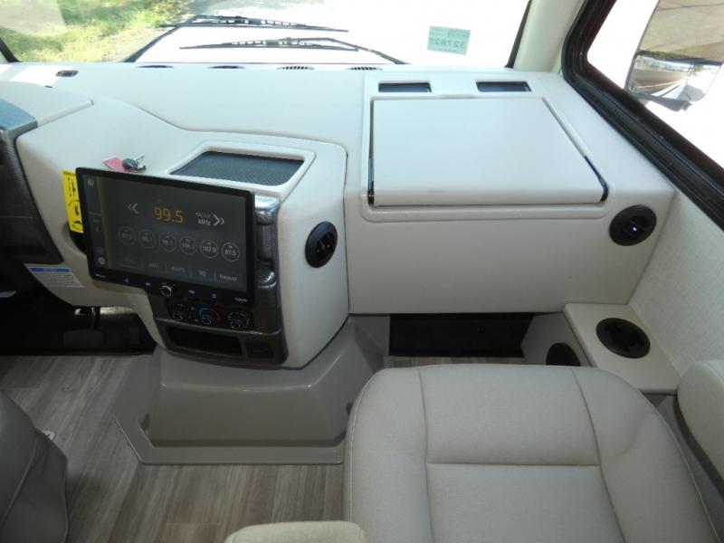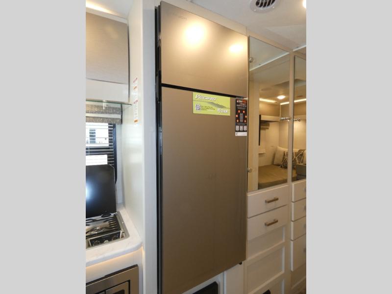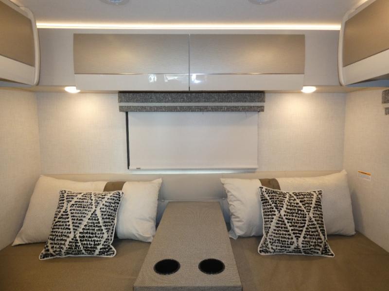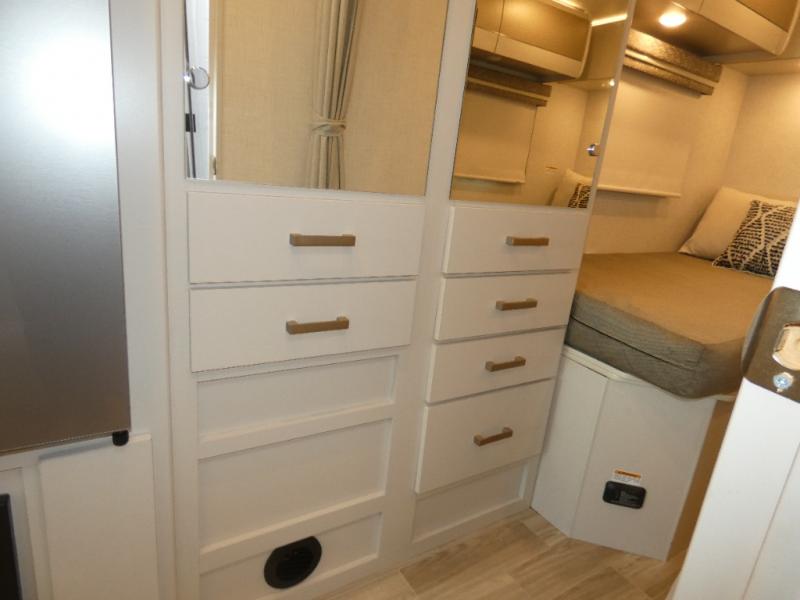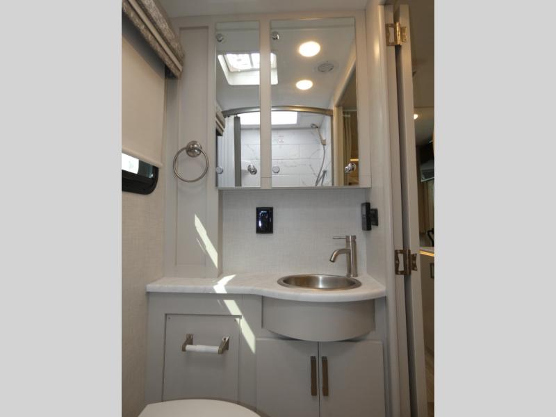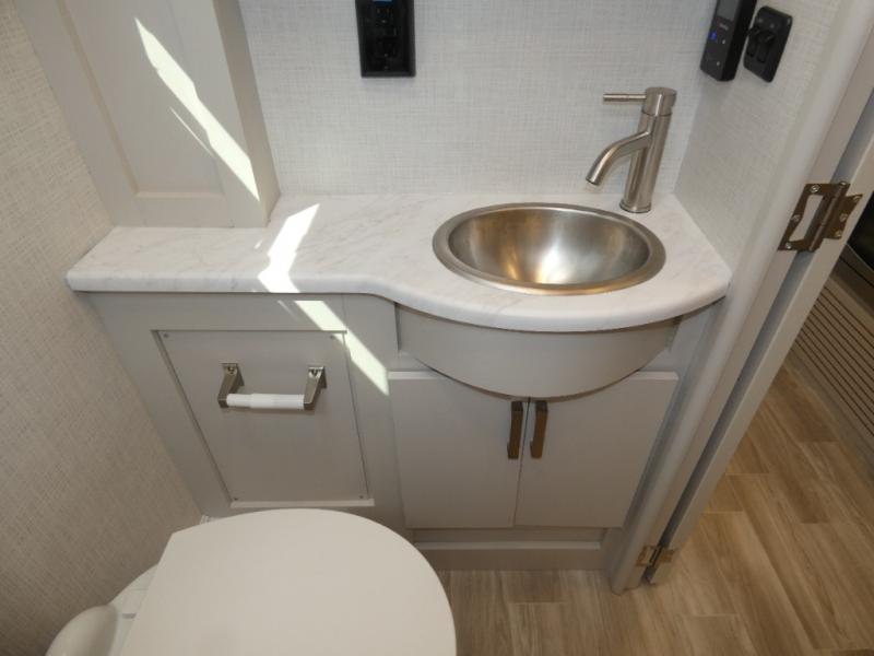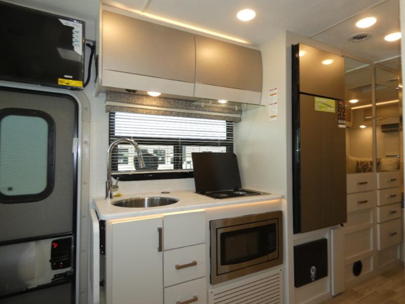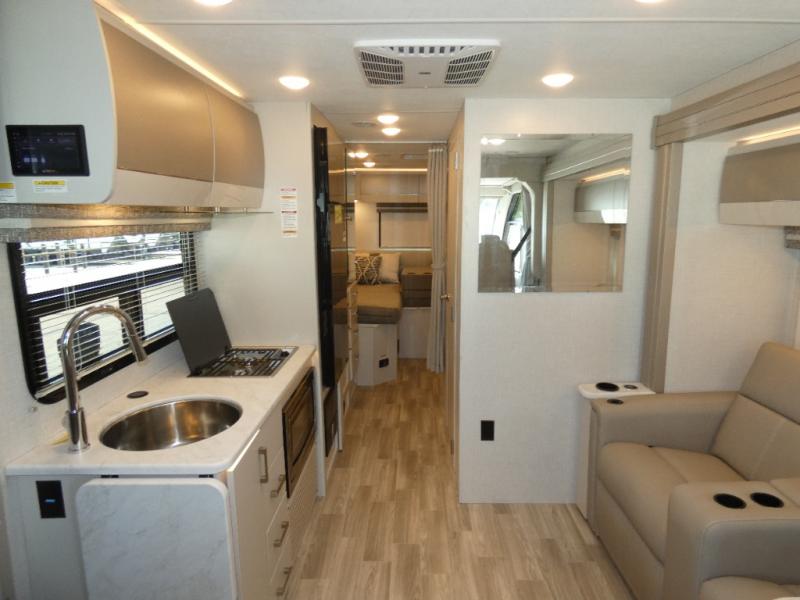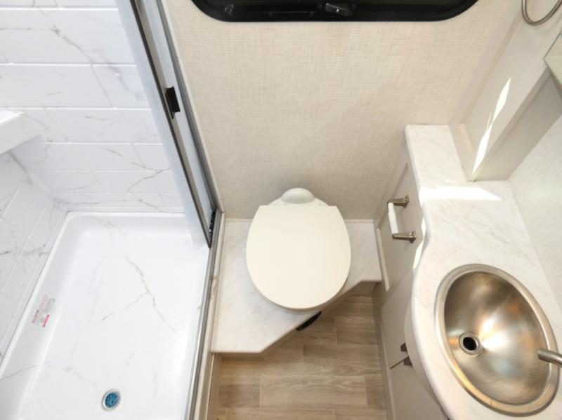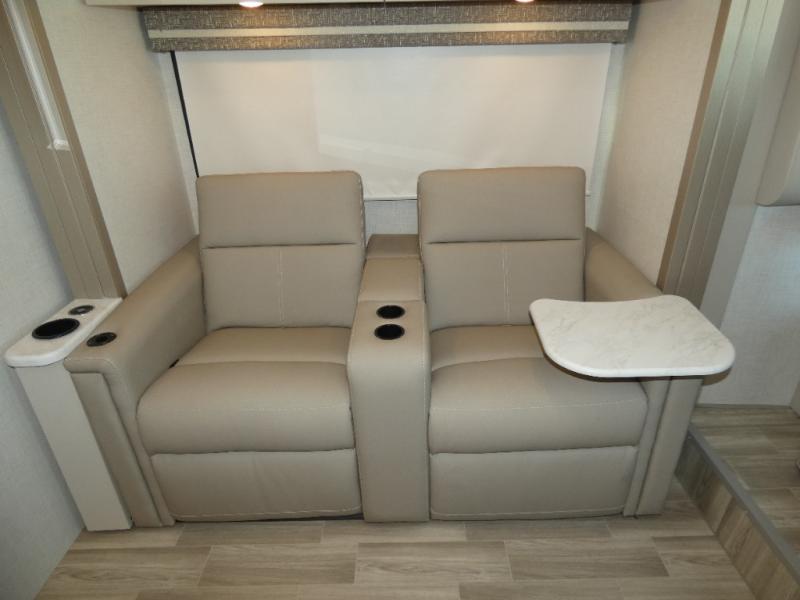 This coach has a similar layout to 24.1, but you'll enjoy theater seating in this model, two closets instead of one, and a larger exterior length for more space! The twin beds with king conversion make it possible to travel as friends or a couple, and there is even a bedroom TV so you can watch movies in bed. In the morning, you can make breakfast on the two burner gas cooktop or in the convection microwave with an air fryer. There is a 12V double door refrigerator to keep your perishables fresh, and you can dine at the theater seating.