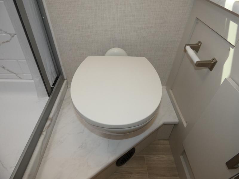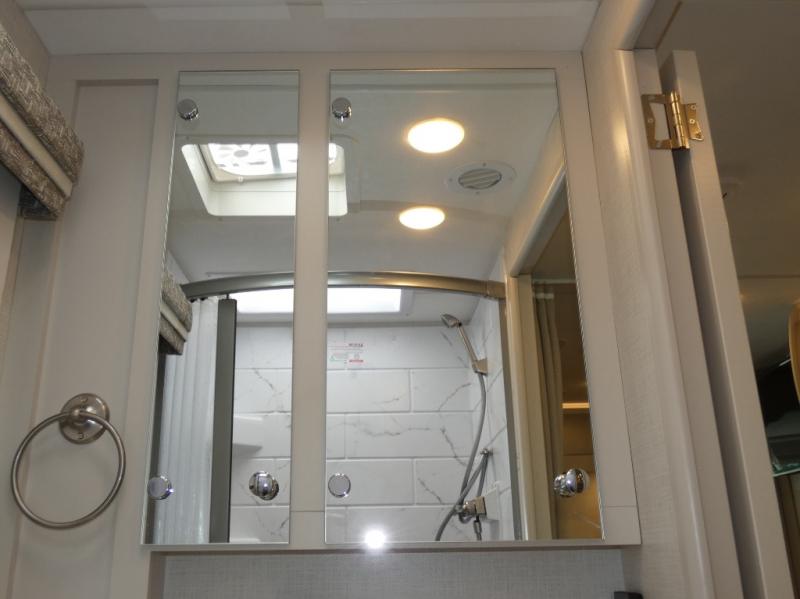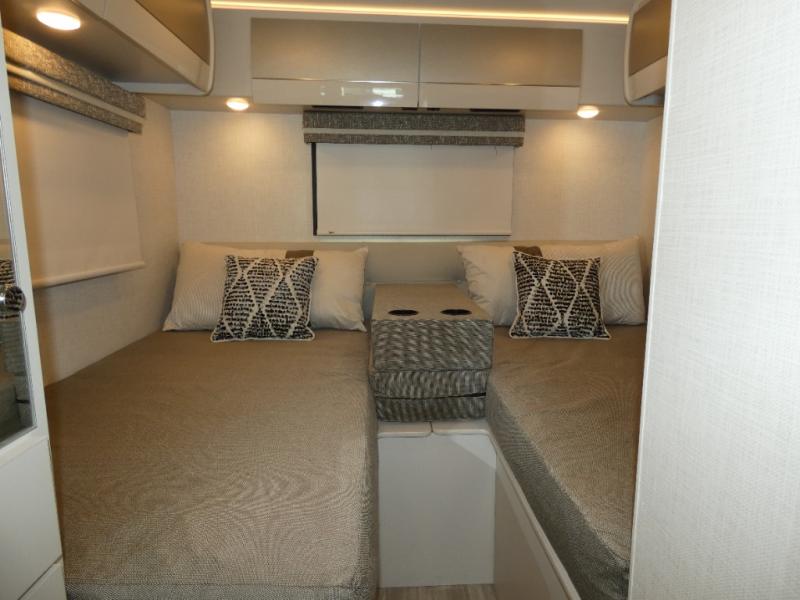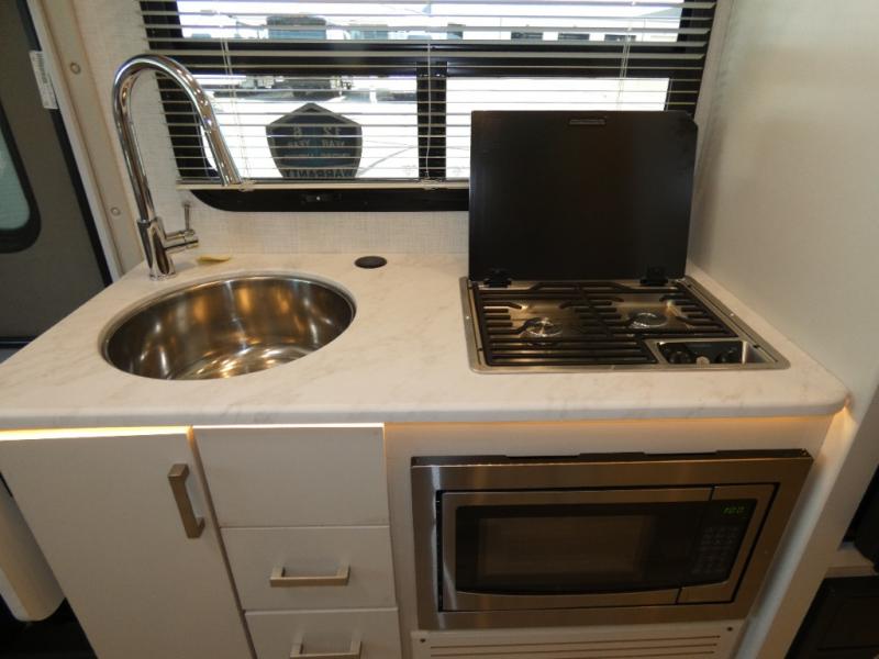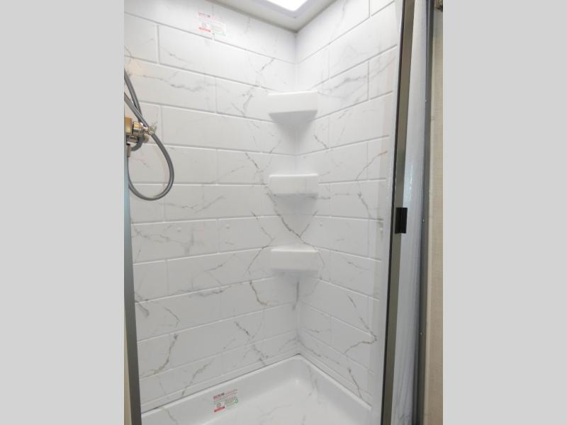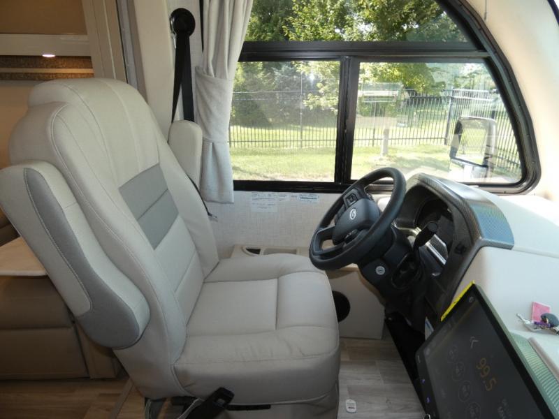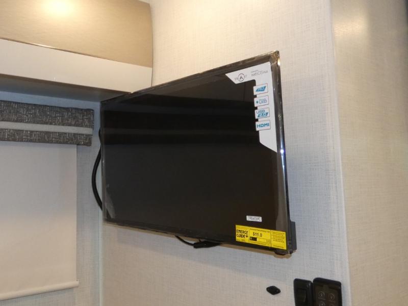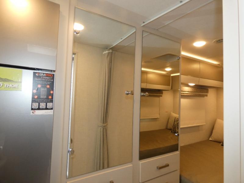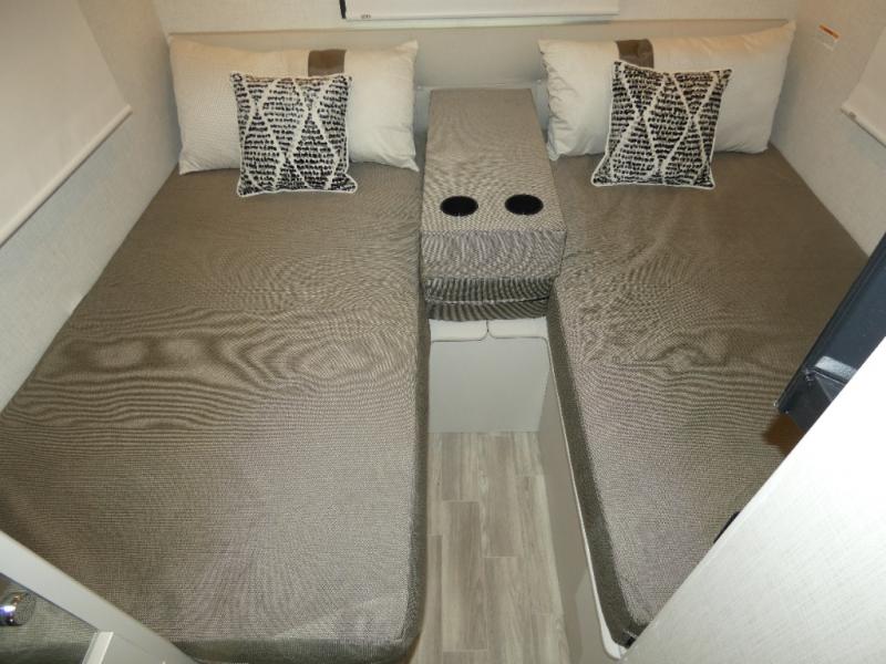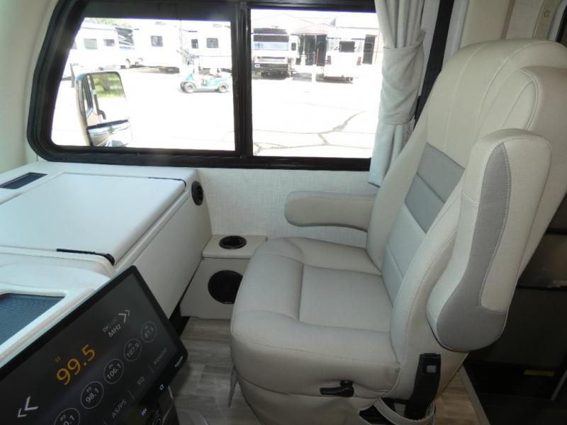 This coach has a similar layout to 24.1, but you'll enjoy theater seating in this model, two closets instead of one, and a larger exterior length for more space! The twin beds with king conversion make it possible to travel as friends or a couple, and there is even a bedroom TV so you can watch movies in bed. In the morning, you can make breakfast on the two burner gas cooktop or in the convection microwave with an air fryer. There is a 12V double door refrigerator to keep your perishables fresh, and you can dine at the theater seating.