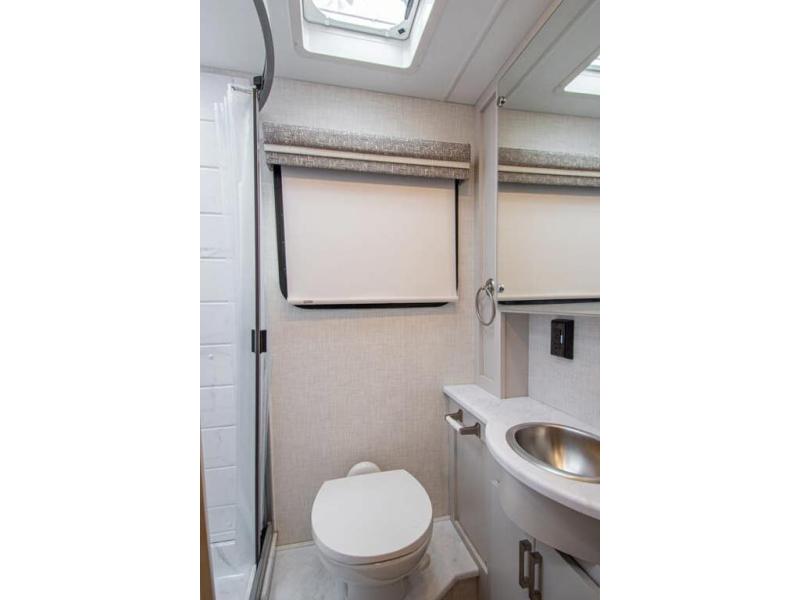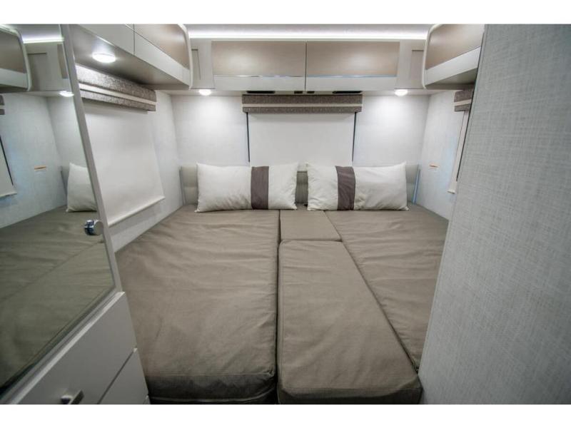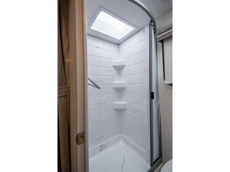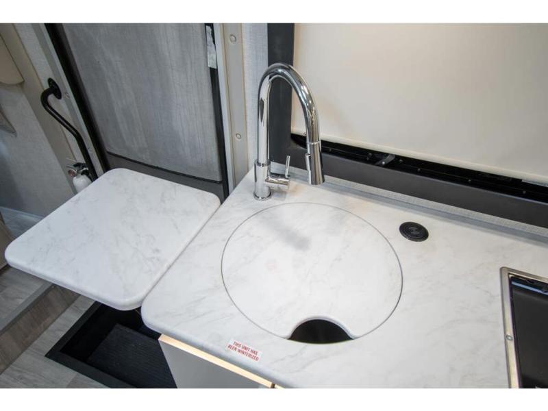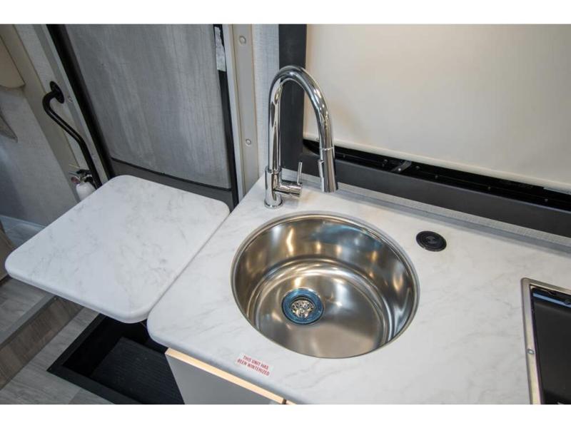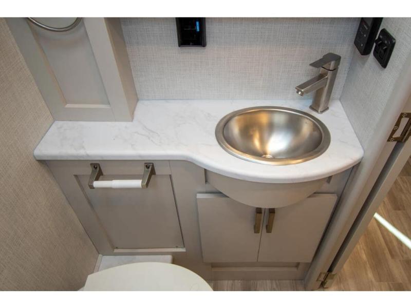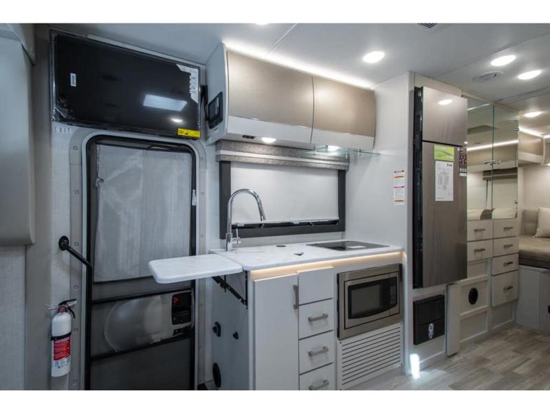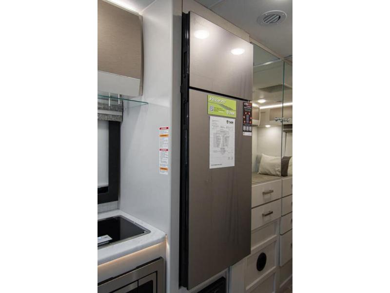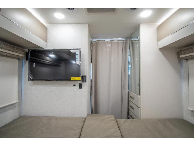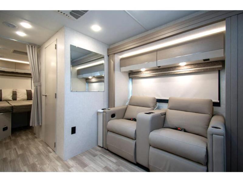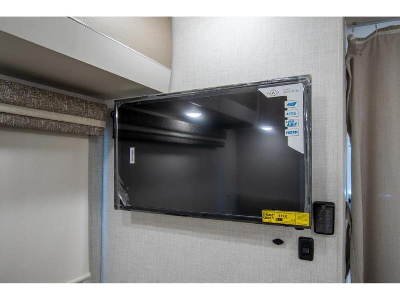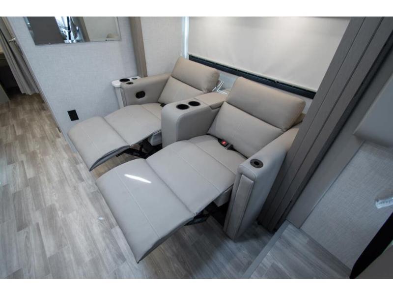 This coach has a similar layout to 24.1, but you'll enjoy theater seating in this model, two closets instead of one, and a larger exterior length for more space! The twin beds with king conversion make it possible to travel as friends or a couple, and there is even a bedroom TV so you can watch movies in bed. In the morning, you can make breakfast on the two burner gas cooktop or in the convection microwave with an air fryer. There is a 12V double door refrigerator to keep your perishables fresh, and you can dine at the theater seating.