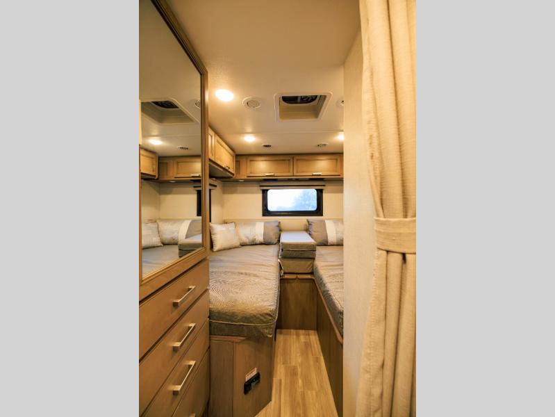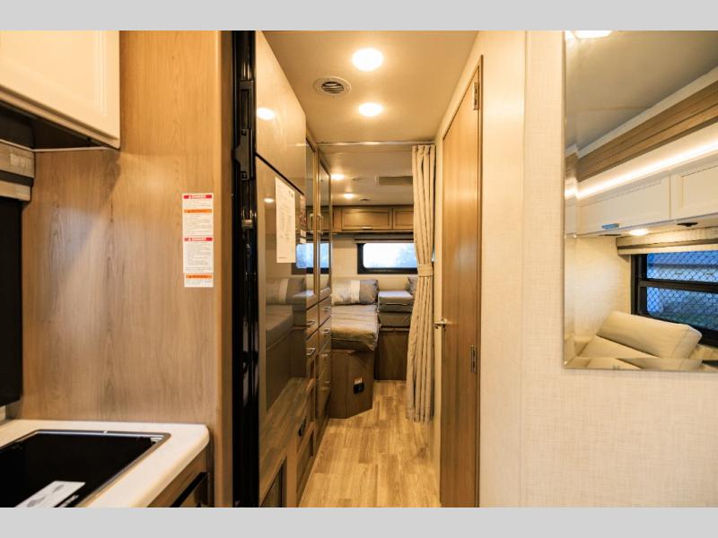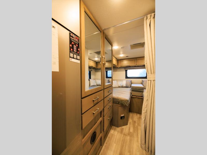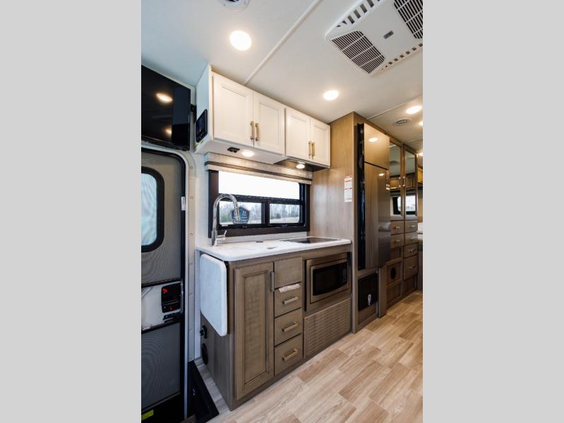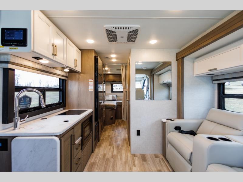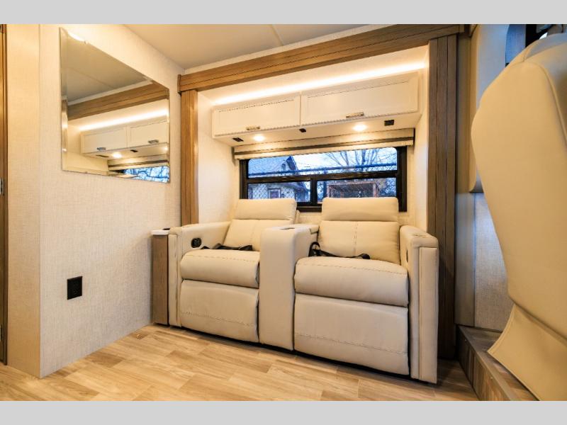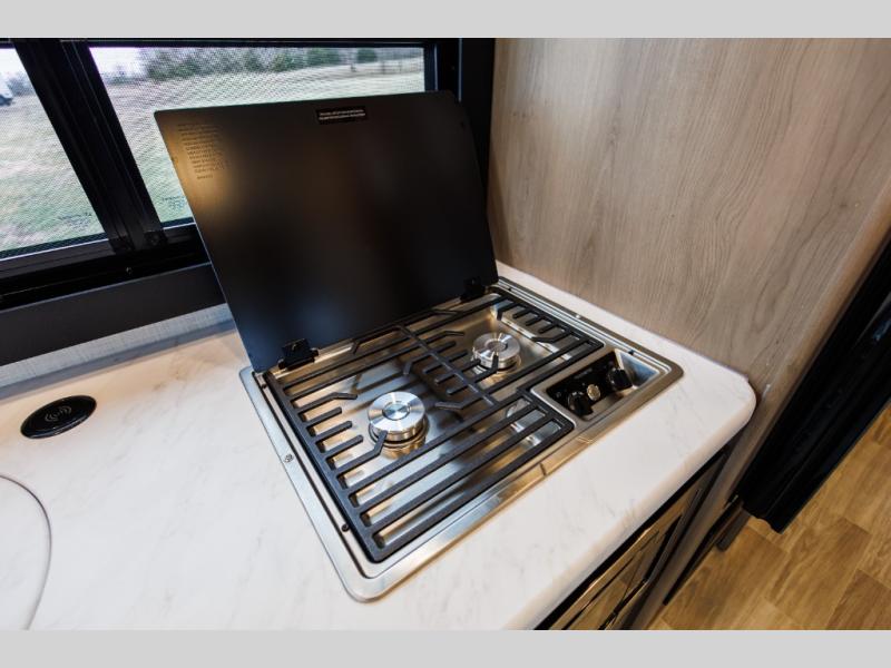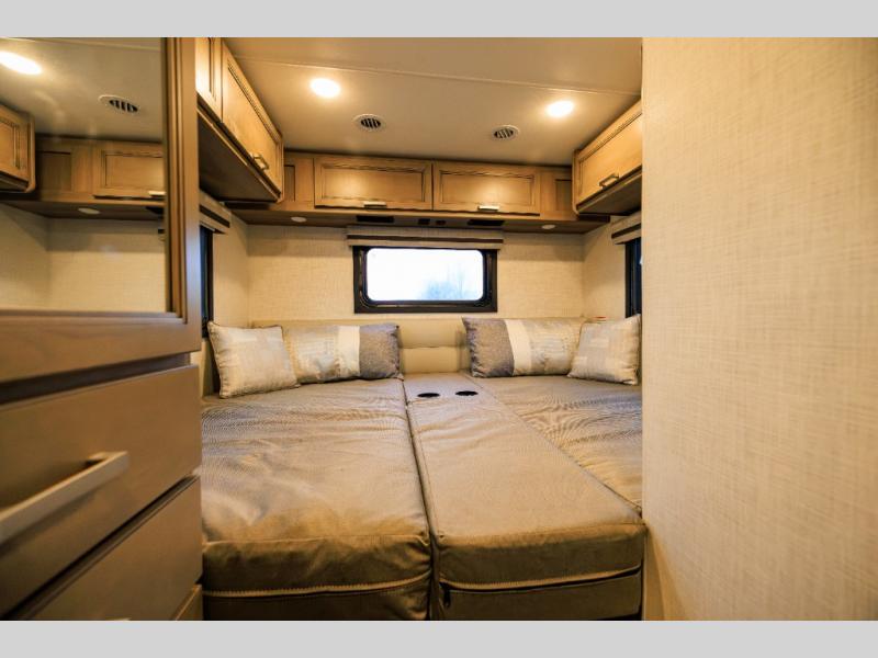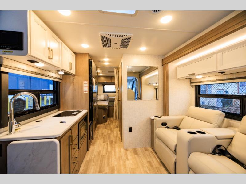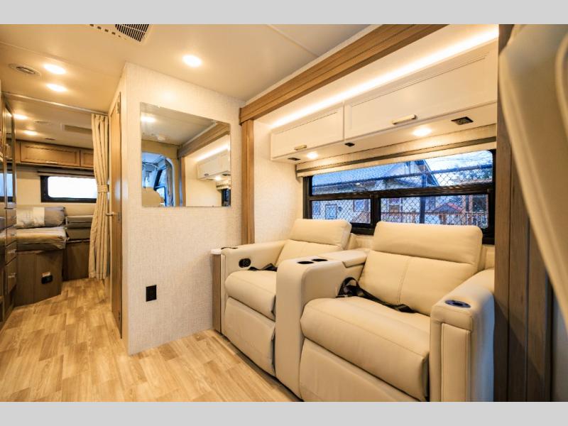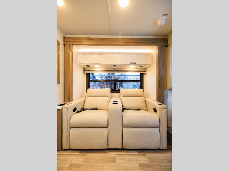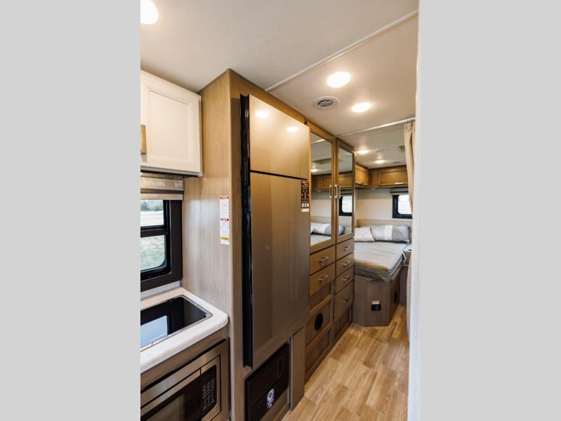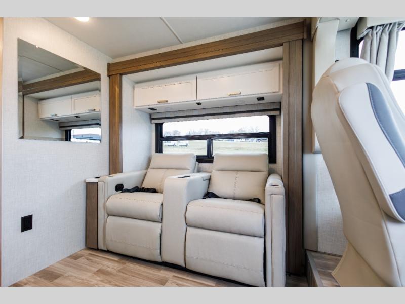 This coach has a similar layout to 24.1, but you'll enjoy theater seating in this model, two closets instead of one, and a larger exterior length for more space! The twin beds with king conversion make it possible to travel as friends or a couple, and there is even a bedroom TV so you can watch movies in bed. In the morning, you can make breakfast on the two burner gas cooktop or in the convection microwave with an air fryer. There is a 12V double door refrigerator to keep your perishables fresh, and you can dine at the theater seating.