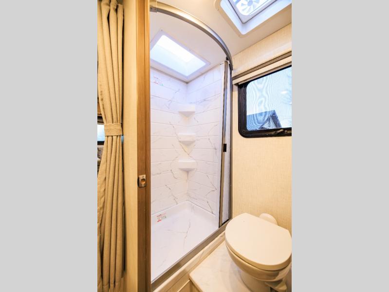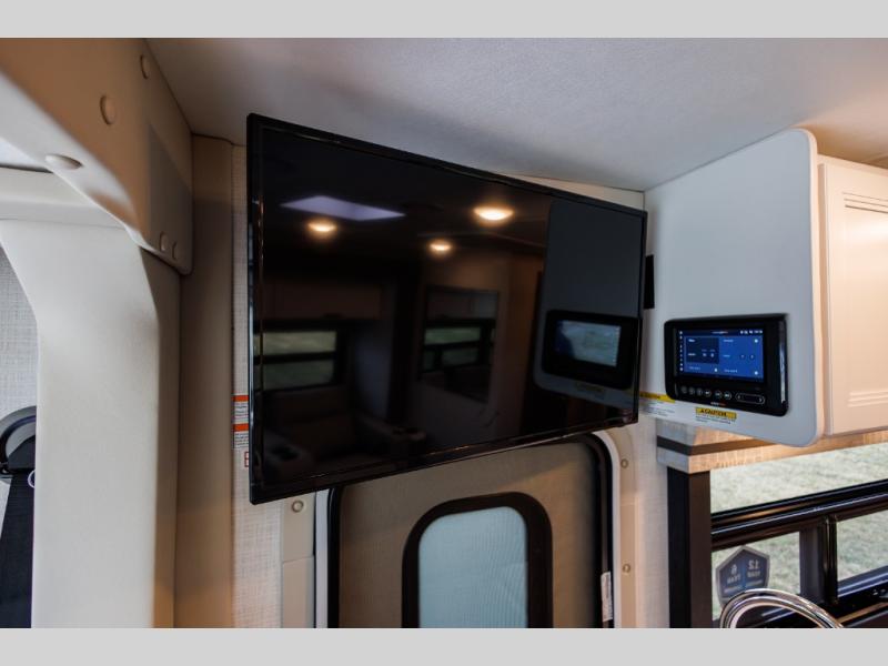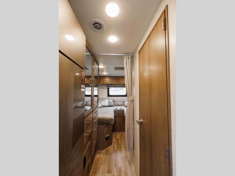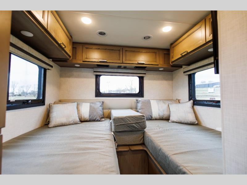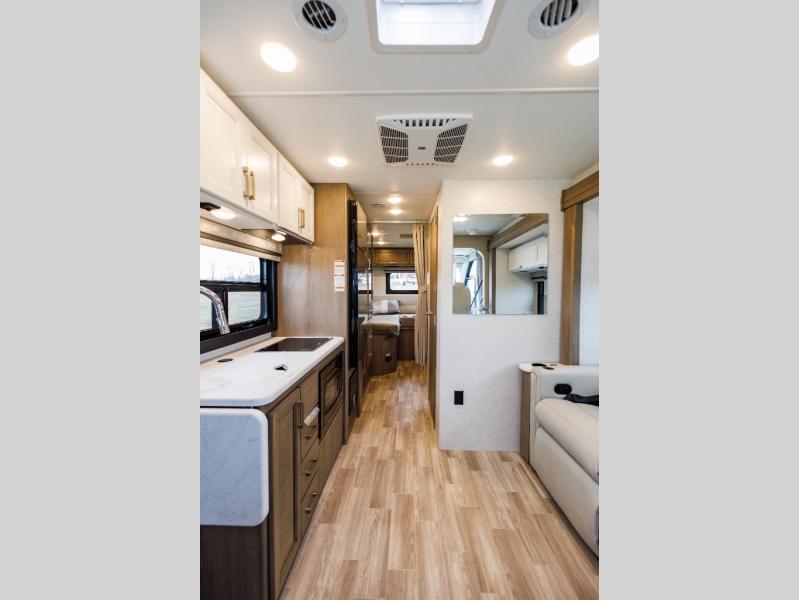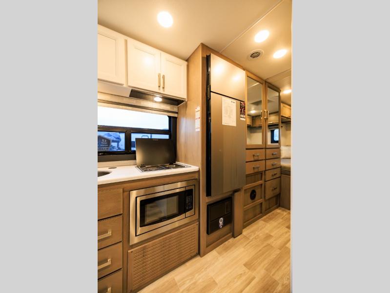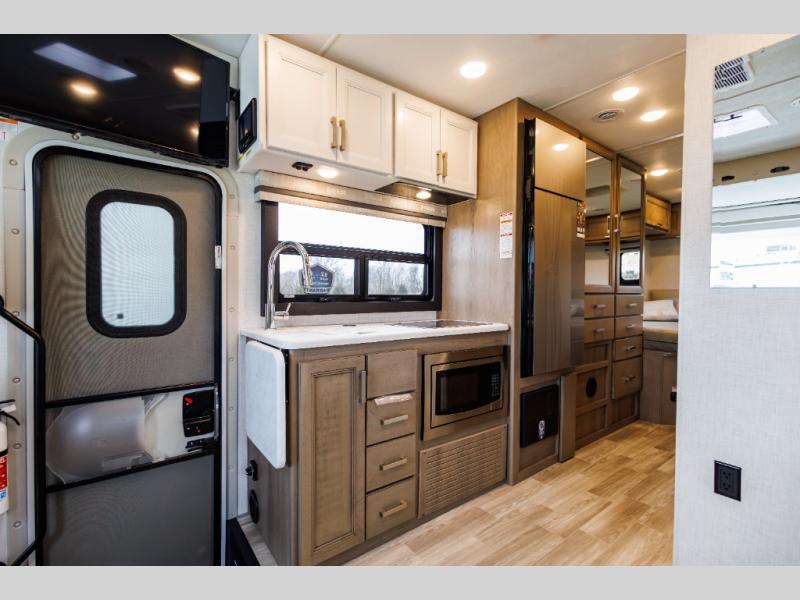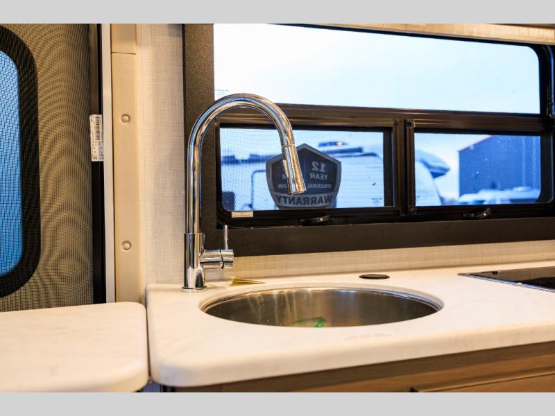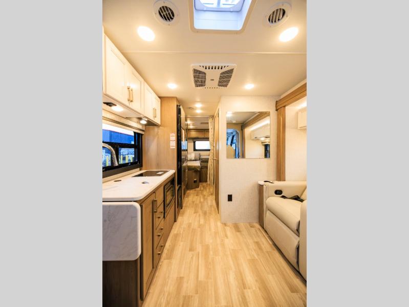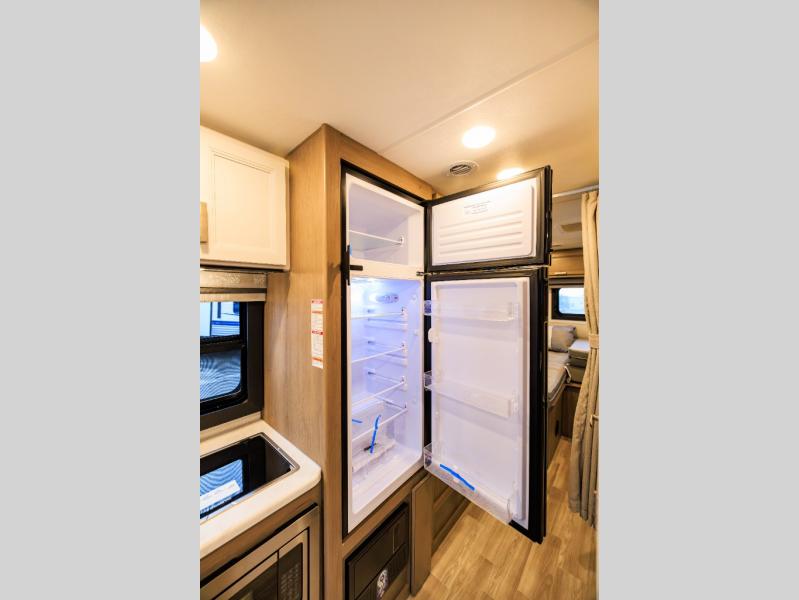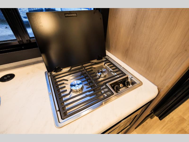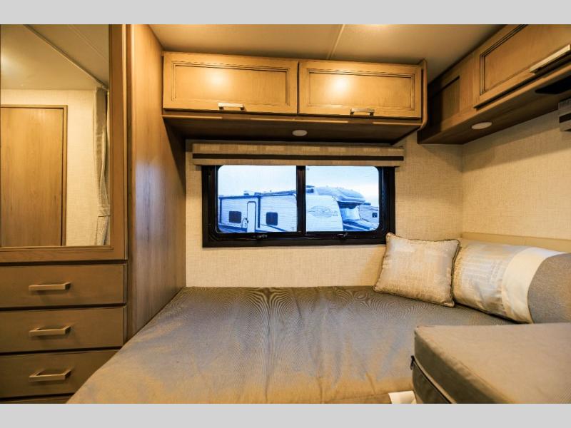 This coach has a similar layout to 24.1, but you'll enjoy theater seating in this model, two closets instead of one, and a larger exterior length for more space! The twin beds with king conversion make it possible to travel as friends or a couple, and there is even a bedroom TV so you can watch movies in bed. In the morning, you can make breakfast on the two burner gas cooktop or in the convection microwave with an air fryer. There is a 12V double door refrigerator to keep your perishables fresh, and you can dine at the theater seating.