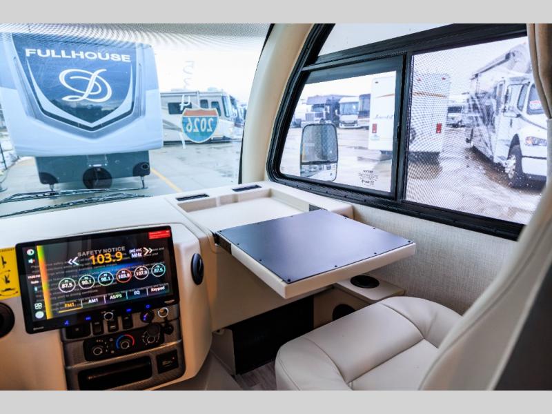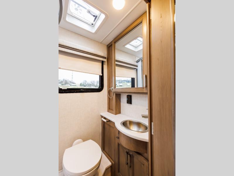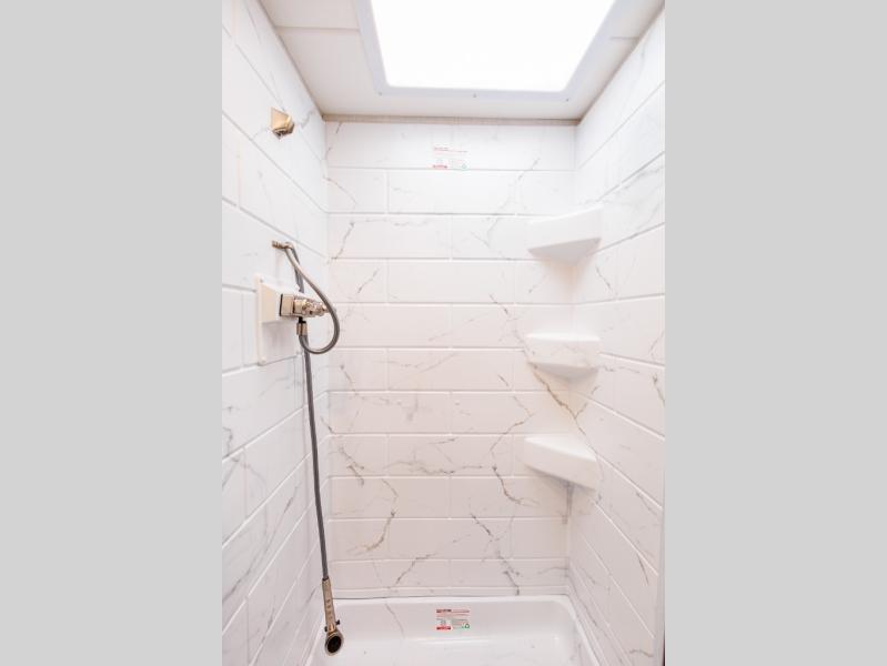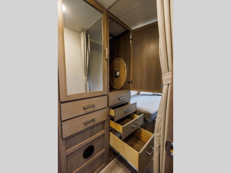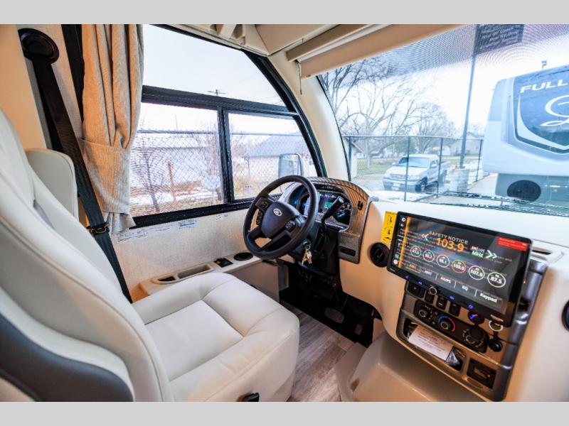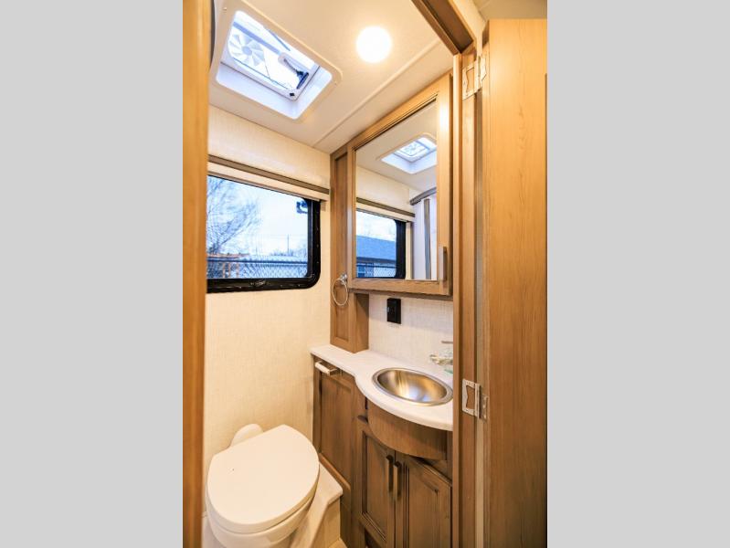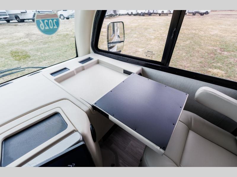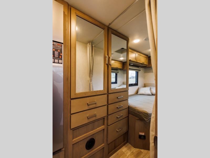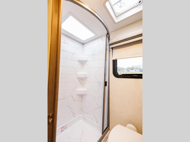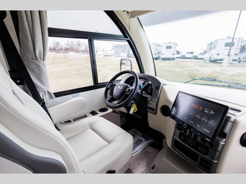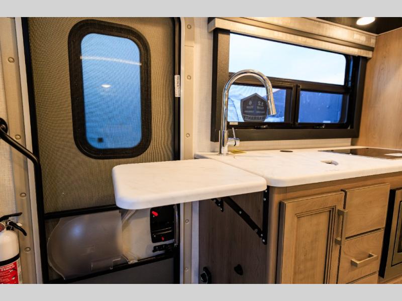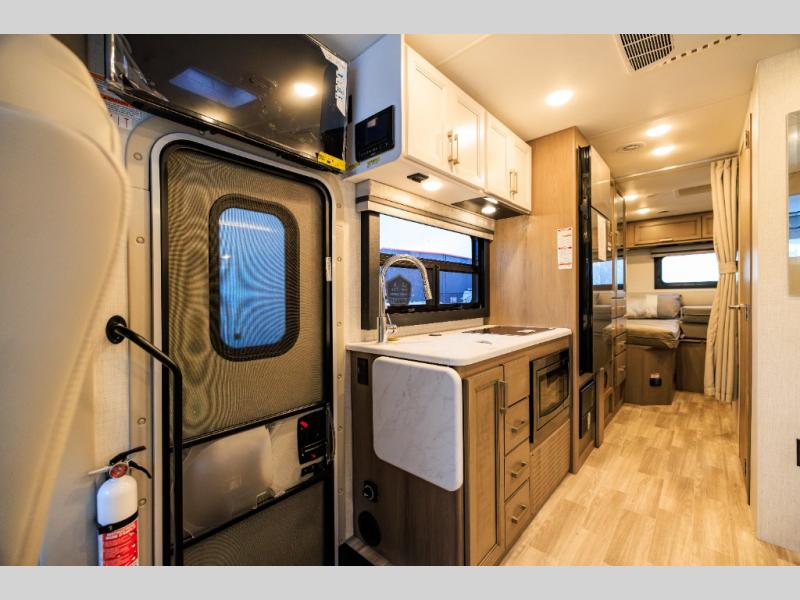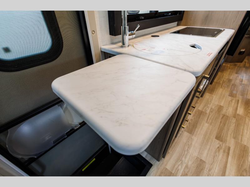 This coach has a similar layout to 24.1, but you'll enjoy theater seating in this model, two closets instead of one, and a larger exterior length for more space! The twin beds with king conversion make it possible to travel as friends or a couple, and there is even a bedroom TV so you can watch movies in bed. In the morning, you can make breakfast on the two burner gas cooktop or in the convection microwave with an air fryer. There is a 12V double door refrigerator to keep your perishables fresh, and you can dine at the theater seating.