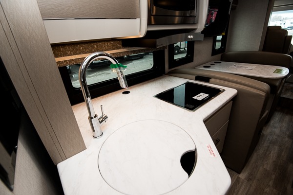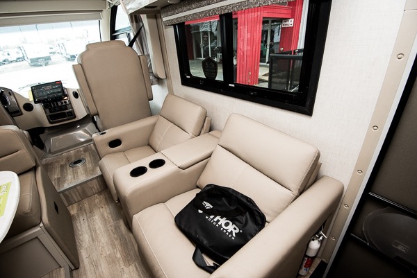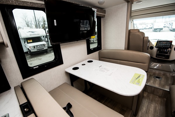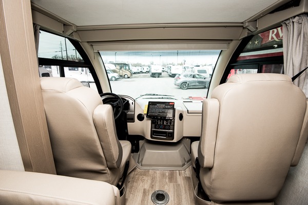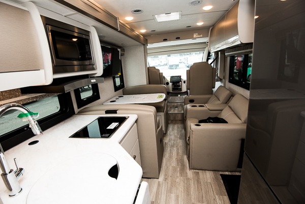 This stunning Class A motorhome combines luxury, comfort, and functionality for experiencing life on your terms. The rear bedroom is a peaceful retreat for sleeping comfortably on the queen-size bed and storing your clothes in the two spacious closets. The full bathroom is a refreshing oasis that will help you to get ready for the day or unwind after a big adventure. The kitchen keeps drinks cold in the fridge, whips up quick bites in the microwave, and cooks up a storm on the two-burner cooktop. Need extra space? The flip-up countertop gives you the room you need, plus you can wash up at the convenient sink. Further, the 70” dream dinette is perfect for meals and hangs perfectly for gathering around for breakfast, lunch, or dinner. The theater seating is a comfy spot to chill and enjoy some entertainment, and the side tables are perfect for setting drinks or snacks.