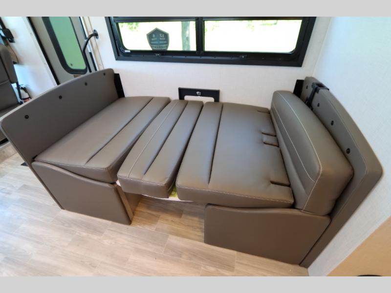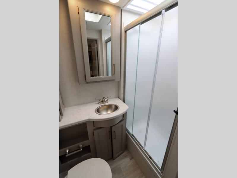 This Windsport Class A gas motorhome is the perfect choice for vacation. You will be living in comfort in the rear private bedroom because of the king bed and 32" LED Smart TV, and you have exceptional convenience with the exterior 32" TV and exterior kitchen when relaxing outside or sharing a meal with family or friends in the woods, also you can have a movie night out under the stars with the snacks being prepared right there with you. Back inside, you'll love the 68" sofa bed to relax on, a three-burner stove to cook like a chef, and a coffee table between the cab seats to set your drinks on while you continue exploring the road. The bathroom contains a 24" x 36" shower with a skylight to help you stay fresh, and there is a glass shower door included for added luxury, plus you can connect with nature under the shade of the 18' awning.