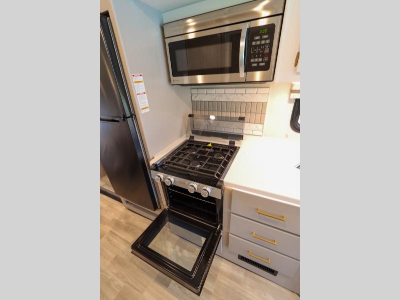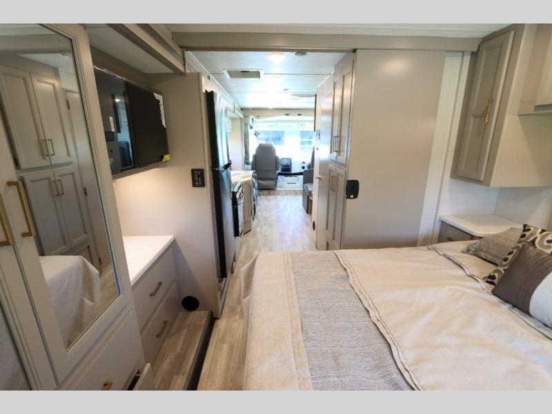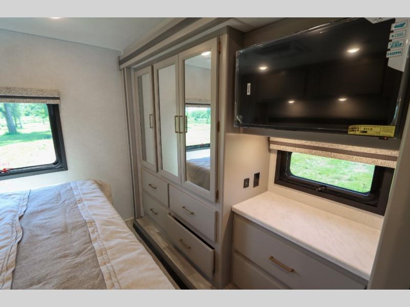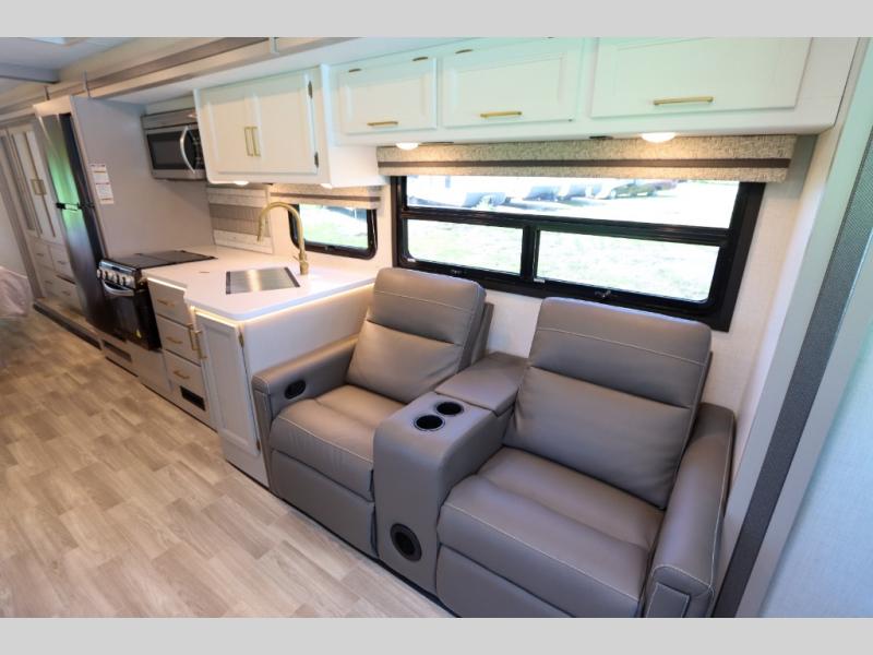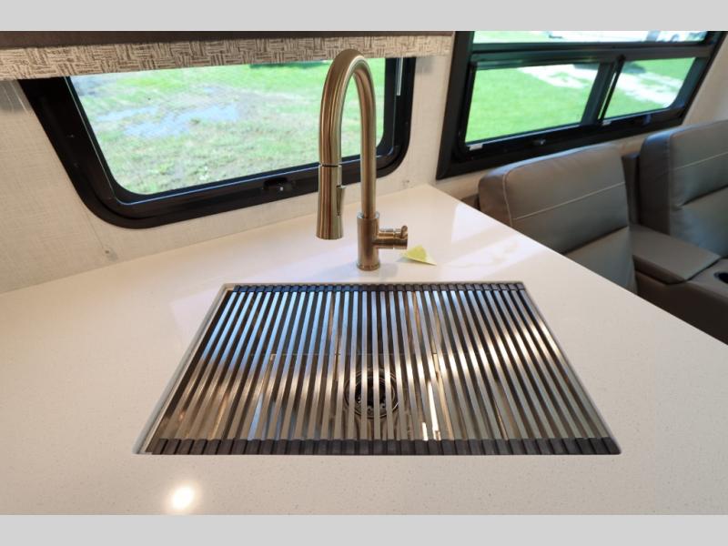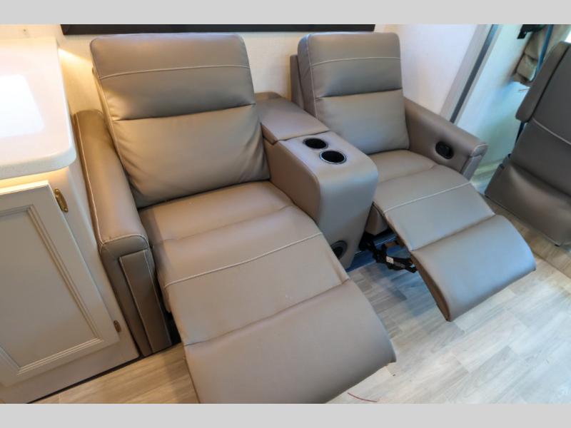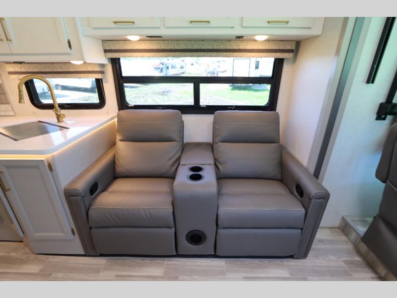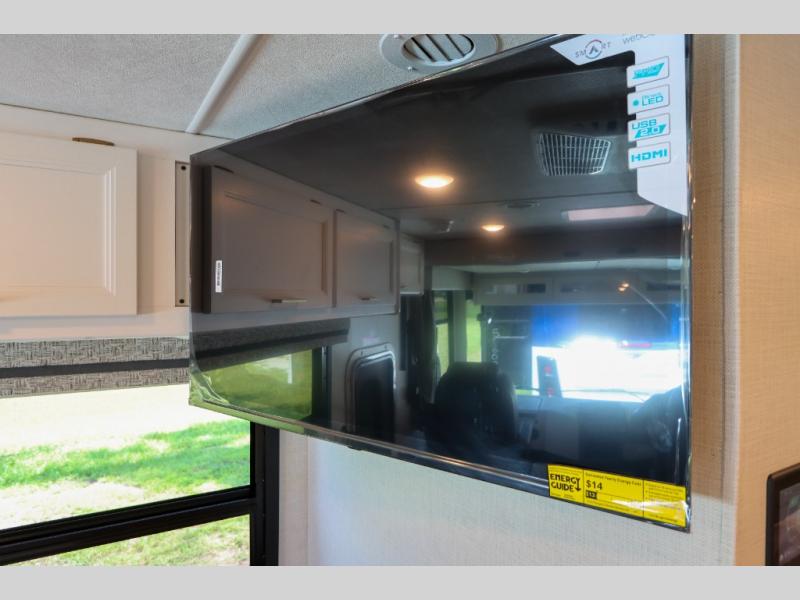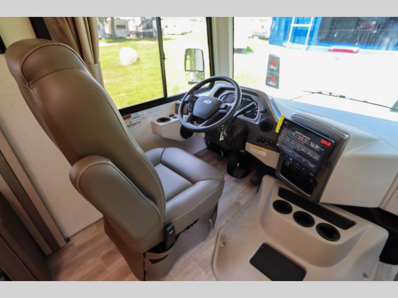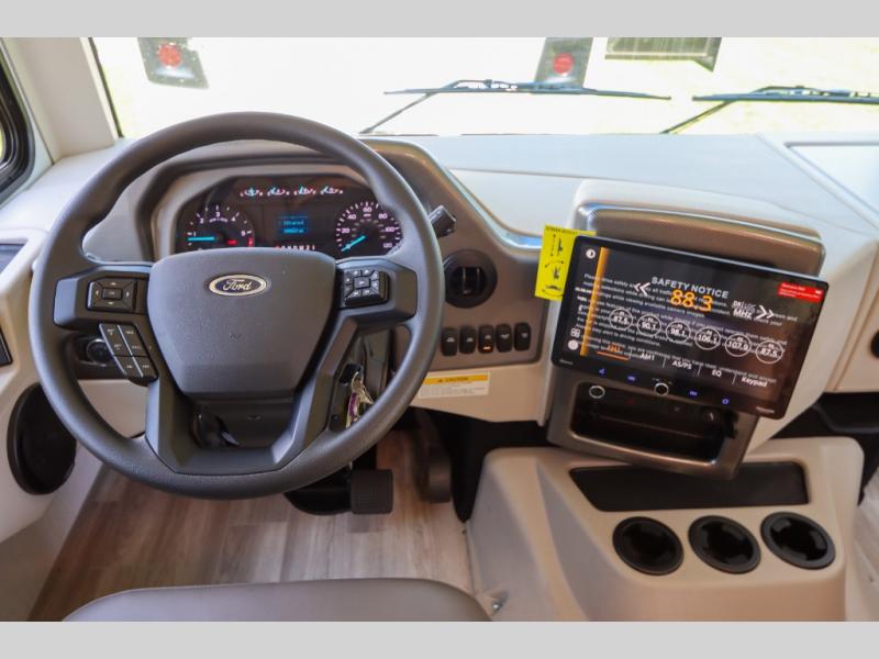 There are all sorts of adventures to be had with the Thor Motor Coach Windsport Class A gas motorhome! Built on a Ford F-53 chassis, the Windsport will gather lots of attention with its HD-MAX® exterior with graphics package. It also offers you a basement pass-through storage and a Pet-Link™ multi-purpose tie-down. There are also reclining/swivel leatherette captain's chairs to relax in while you travel. The Winegard® ConnecT™ Wi-Fi extender +4G will allow you to post on your social media or send an email from the cockpit's dash work station, and the Rapid Camp+® multiplex wiring control system with Bluetooth and 7" touchscreen will allow you to control and monitor the various electrical systems on your coach. This coach will also make you feel right at home with residential vinyl flooring, decorative glass and tile backsplash, a designer headboard, bedspread, and pillow shams, and many more comforts!