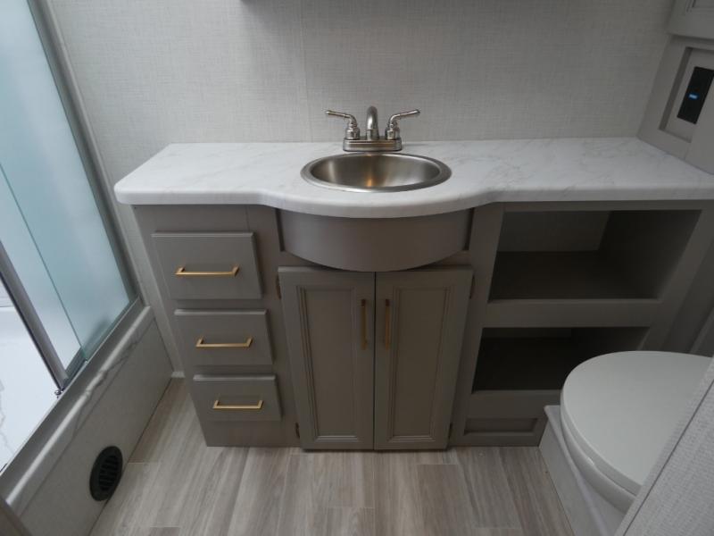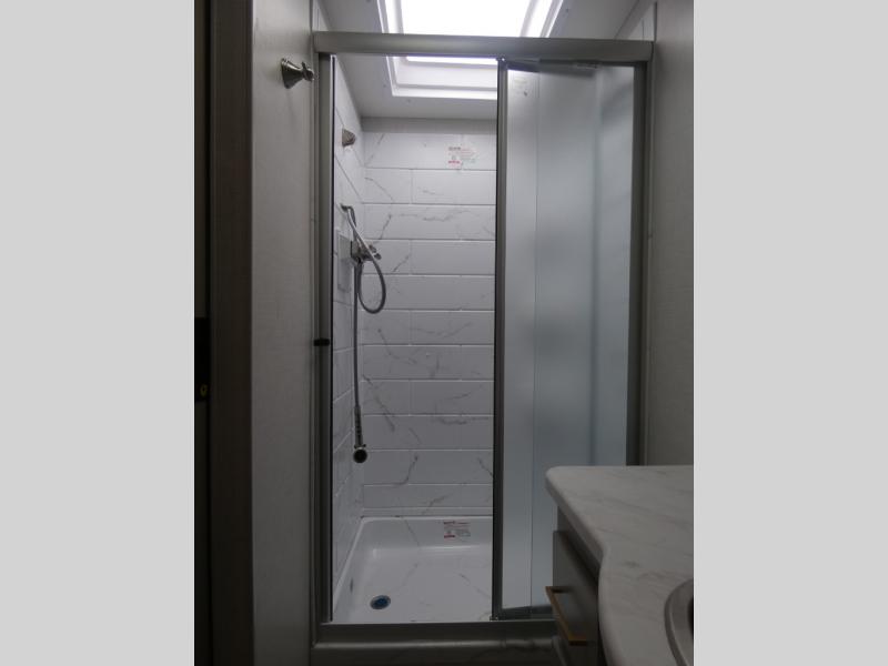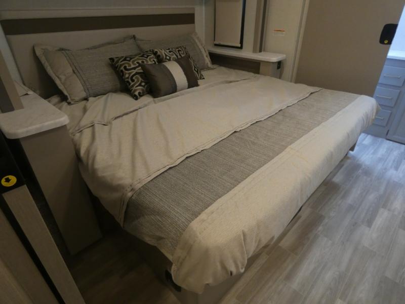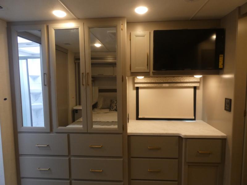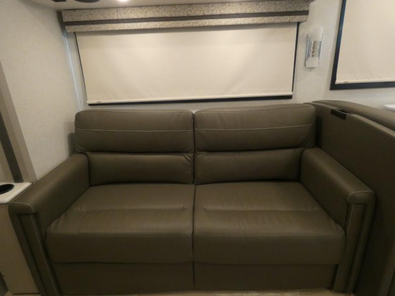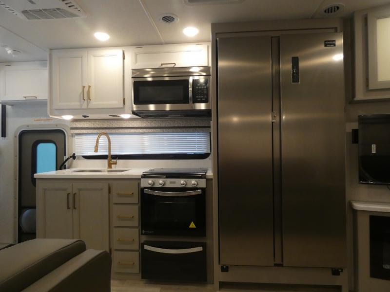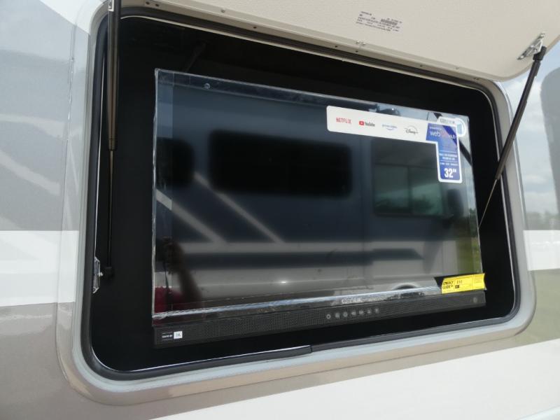 Get ready to take your travels to new heights with our incredible Class A motorhome! The full rear bathroom is spacious and convenient, complete with a generous 30” x 36” shower. The private bedroom is a haven of relaxation, featuring a king bed, closet, dresser, and 32” LED smart TV for relaxing. The living room/kitchen area is the center of the home, equipped with a closet, stackable washer, and dryer prep, half bathroom, linen closet, pantry, 68” sofa bed, dream dinette to share a meal with family, 40” LED smart TV to have an entertaining time with your family and friends, plus a fridge, microwave, and 3-burner cooktop, that will make your cooking experience enjoyable. But that's not all - this motorhome also features a drop-down overhead bunk sleeping area, perfect for kids or guests. This unit is also the best choice if you are seeking comfort time outside thanks to its massive 18’ awning ideal for enjoying the fresh air and a 32” TV for outdoor entertainment.