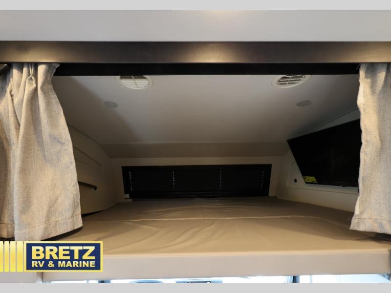 The rear bedroom features a spacious king bed for restful sleep, a wardrobe for storing clothing and essentials, a TV with a bank of drawers below for convenient storage, and an additional closet for extra storage or a washer and dryer prep. The full bathroom provides all the amenities you need for a comfortable trip. The luxurious kitchen is equipped with a residential refrigerator for keeping food and drinks fresh, overhead cabinets for storage, and a two-burner cooktop for culinary creativity. The theater seating with murphy bed provides a comfortable spot to relax or sleep, while the dinette bar is perfect for meals or having a nice drink. The mounted overhead TV is great for entertainment, while you rest in the comfortable overhead bunk perfect for kids or guests.