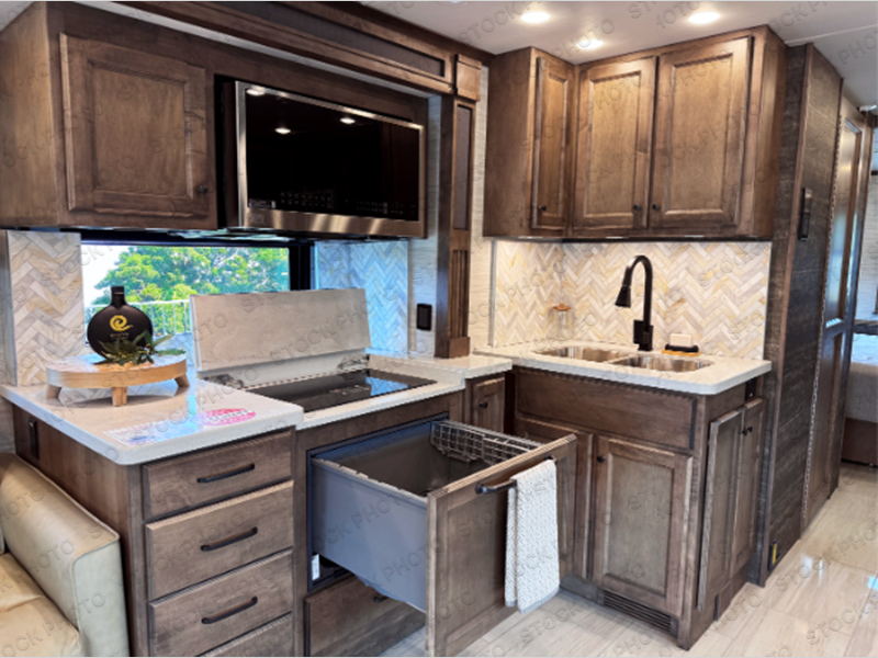 Head across the country in this luxury coach for nine! The dual opposing slides in the main living area will provide you with tons of space to stretch out once you park, and you'll find seating space on the two sofa beds and the booth dinette. The chef can whip up a hearty meal on the three burner cooktop with a convection microwave with an air fryer, and the Expand-An-Island will come in handy when they need extra counter space. The private toilet and sink are right across from the shower so two people can freshen up at once, and you'll love having the rear bedroom all to yourselves. Here, you'll find a king bed slide out that can be optioned out for a queen, a large wardrobe with a bank of drawers, plus an optional washer and dryer if you choose to add. The interior is inviting, but you will also love spending time outdoors under the power awning with LED lights as well and an optional exterior TV.