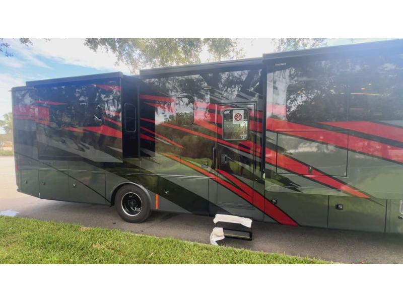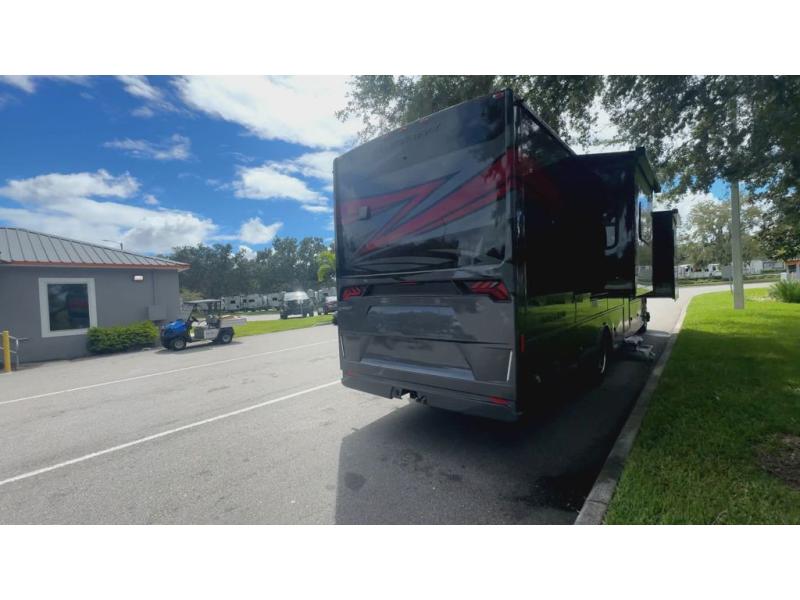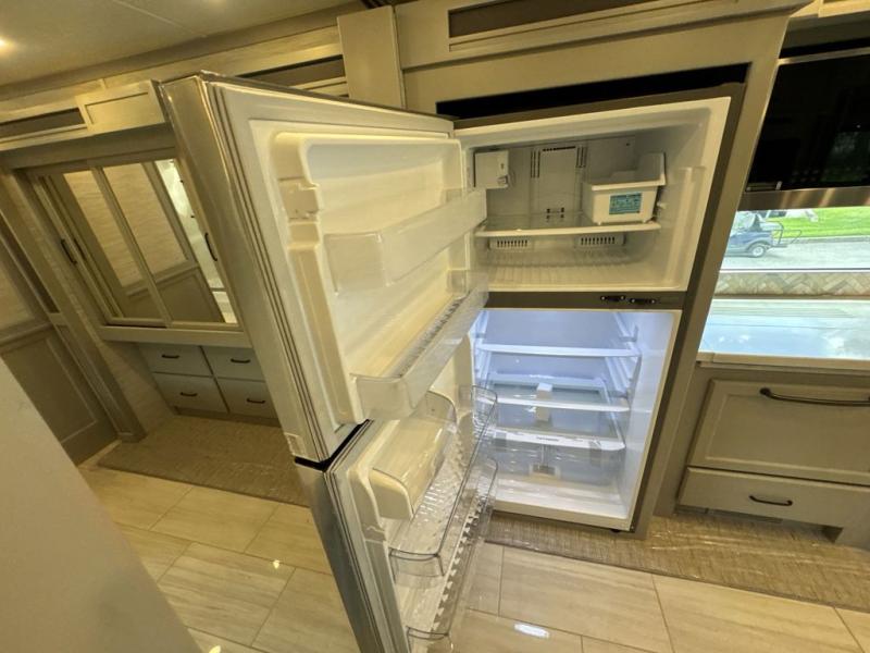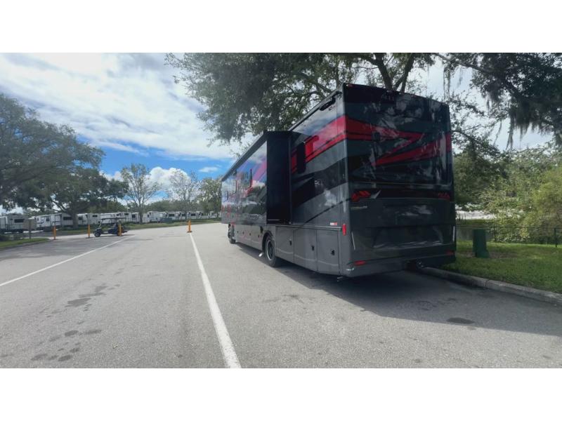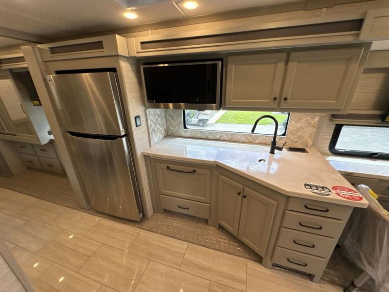 Head across the country in this luxury coach for nine! The dual opposing slides in the main living area will provide you with tons of space to stretch out once you park, and you'll find seating space on the two sofa beds and the booth dinette. The chef can whip up a hearty meal on the three burner cooktop with a convection microwave with an air fryer, and the Expand-An-Island will come in handy when they need extra counter space. The private toilet and sink are right across from the shower so two people can freshen up at once, and you'll love having the rear bedroom all to yourselves. Here, you'll find a king bed slide out that can be optioned out for a queen, a large wardrobe with a bank of drawers, plus an optional washer and dryer if you choose to add. The interior is inviting, but you will also love spending time outdoors under the power awning with LED lights as well and an optional exterior TV.