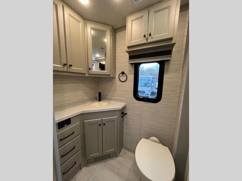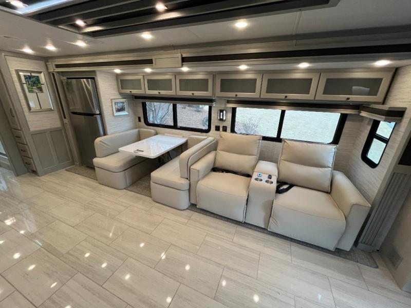 Head across the country in this luxury coach for nine! The dual opposing slides in the main living area will provide you with tons of space to stretch out once you park, and you'll find seating space on the two sofa beds and the booth dinette. The chef can whip up a hearty meal on the three burner cooktop with a convection microwave with an air fryer, and the Expand-An-Island will come in handy when they need extra counter space. The private toilet and sink are right across from the shower so two people can freshen up at once, and you'll love having the rear bedroom all to yourselves. Here, you'll find a king bed slide out that can be optioned out for a queen, a large wardrobe with a bank of drawers, plus an optional washer and dryer if you choose to add. The interior is inviting, but you will also love spending time outdoors under the power awning with LED lights as well and an optional exterior TV.