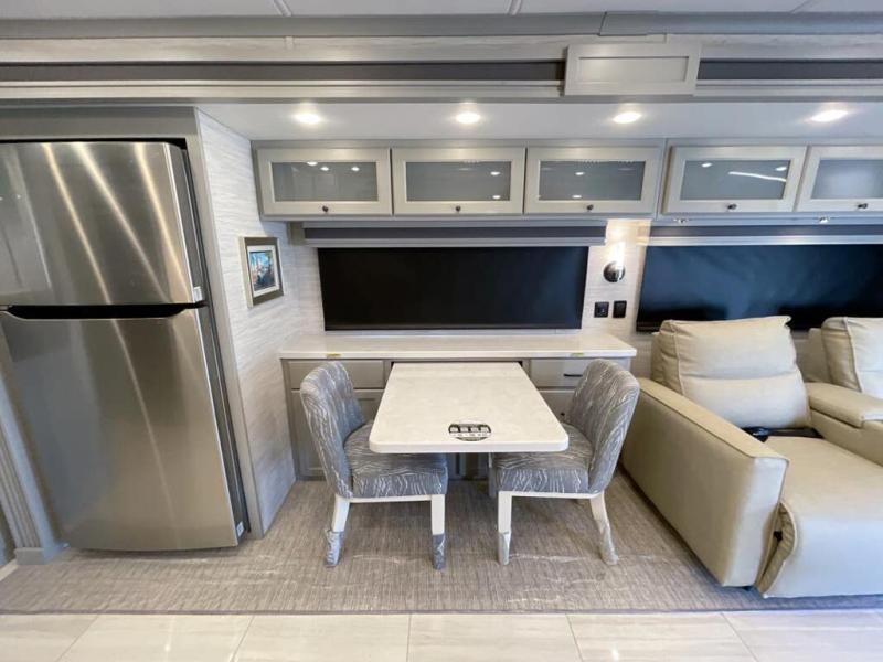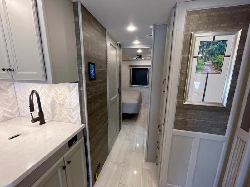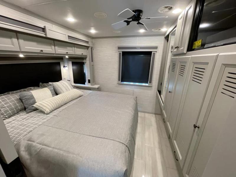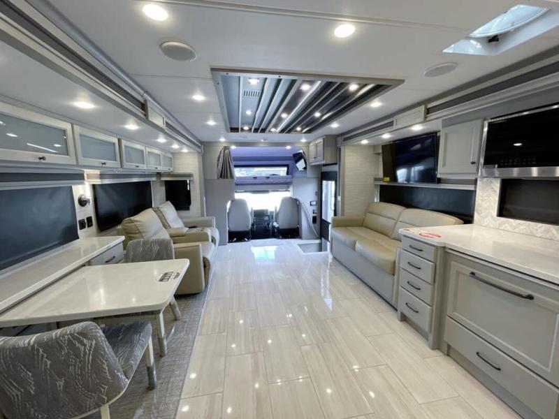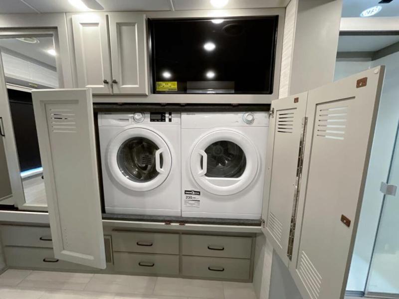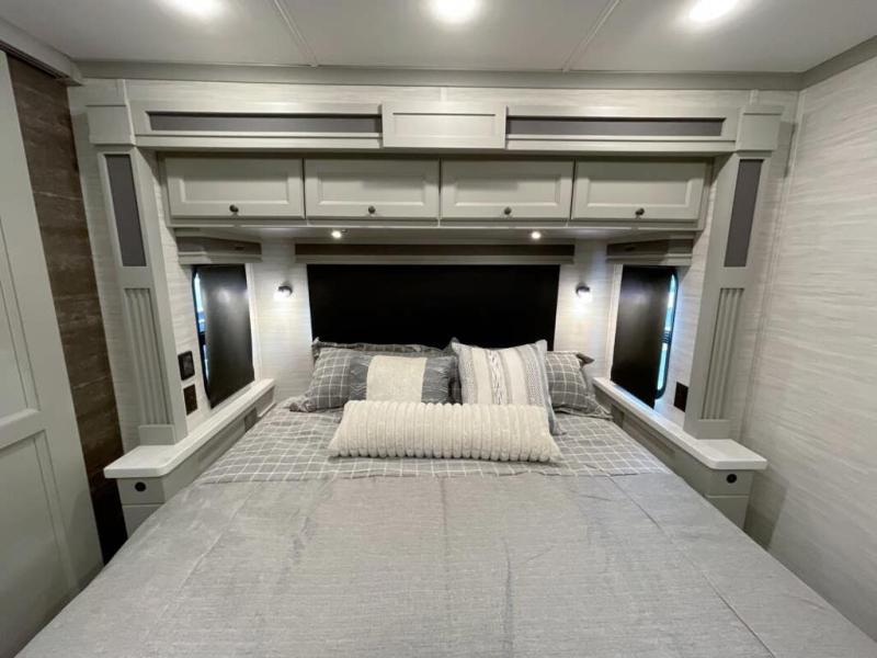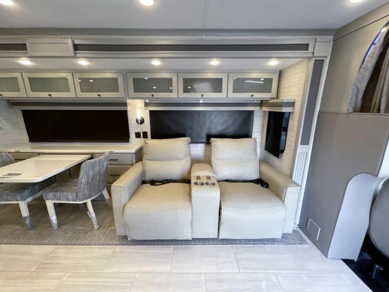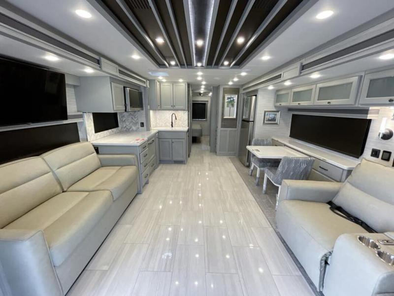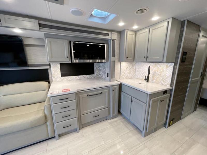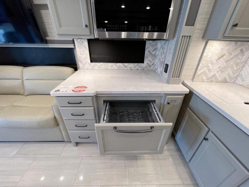 Head across the country in this luxury coach for nine! The dual opposing slides in the main living area will provide you with tons of space to stretch out once you park, and you'll find seating space on the two sofa beds and the booth dinette. The chef can whip up a hearty meal on the three burner cooktop with a convection microwave with an air fryer, and the Expand-An-Island will come in handy when they need extra counter space. The private toilet and sink are right across from the shower so two people can freshen up at once, and you'll love having the rear bedroom all to yourselves. Here, you'll find a king bed slide out that can be optioned out for a queen, a large wardrobe with a bank of drawers, plus an optional washer and dryer if you choose to add. The interior is inviting, but you will also love spending time outdoors under the power awning with LED lights as well and an optional exterior TV.