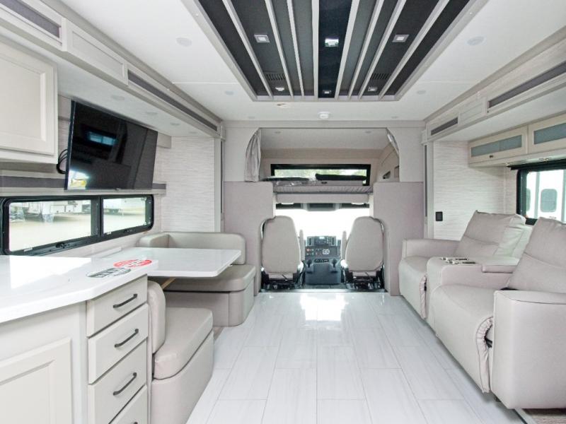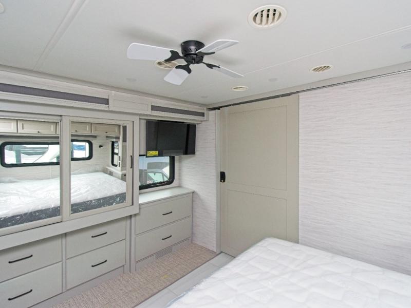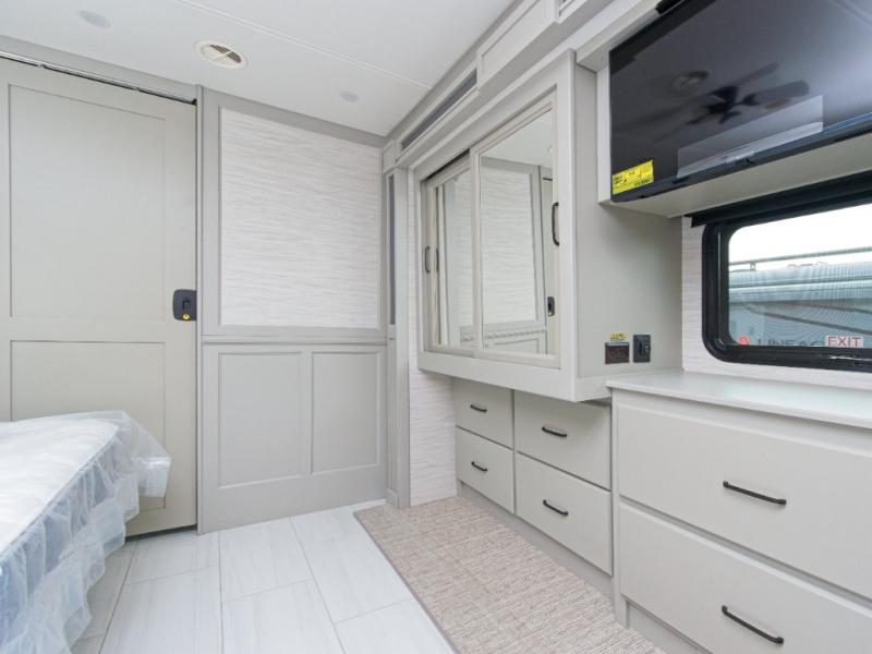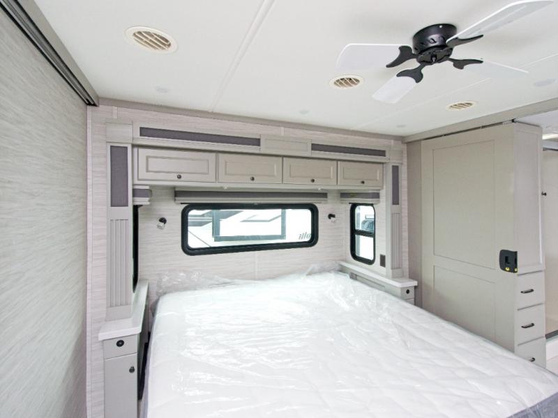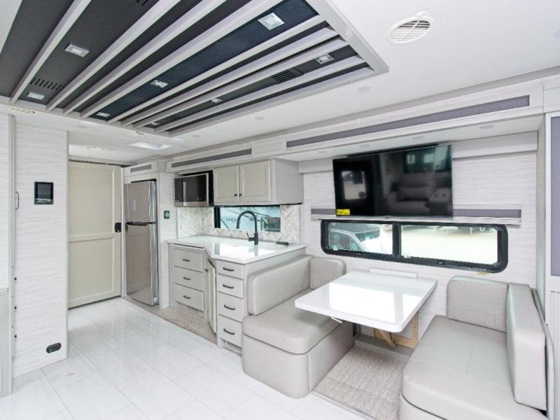 The master suite features a plush king bed, ample wardrobe storage with built-in drawers, and a mounted TV for relaxing evenings. The living area includes a booth dinette, an air coil sofa bed, and optional theater seating or dinette bar for added flexibility. The fully equipped kitchen boasts a three-burner cooktop, convection microwave with air fryer, countertop extension, and a residential stainless steel refrigerator.