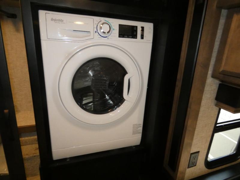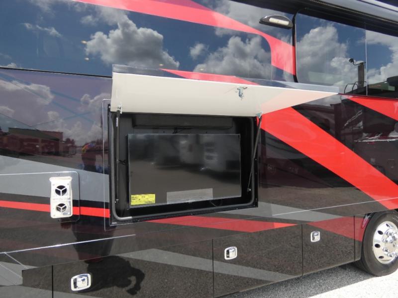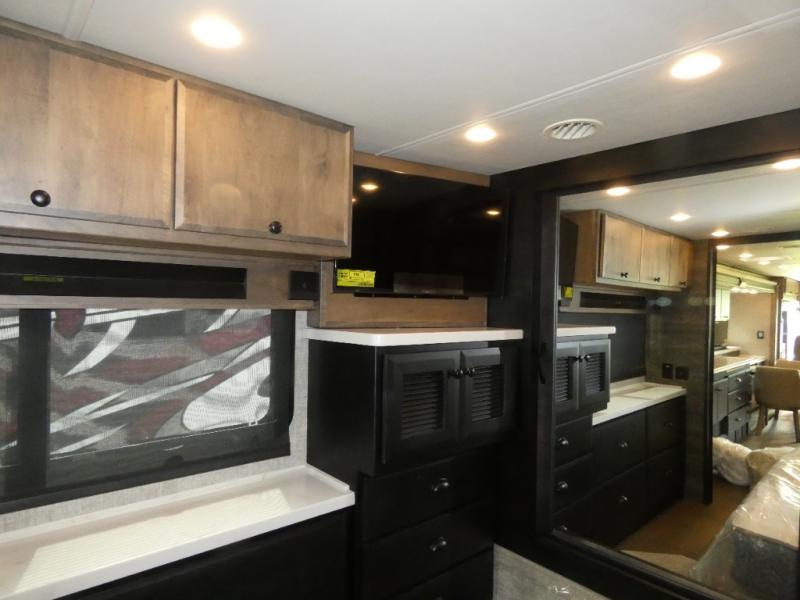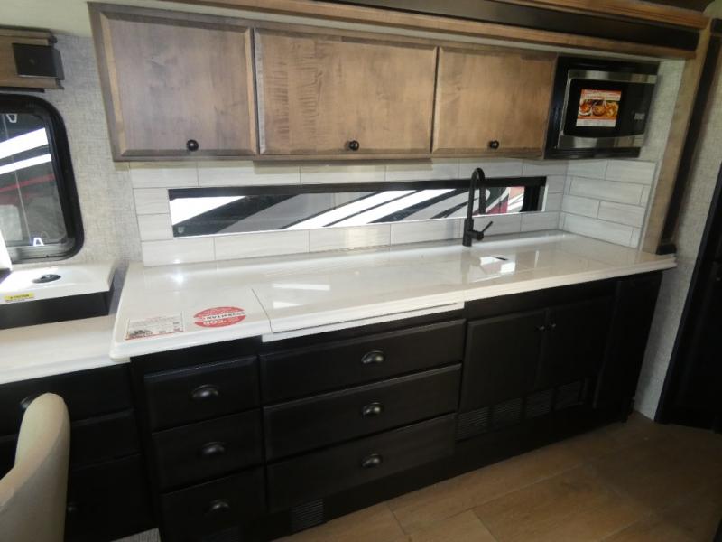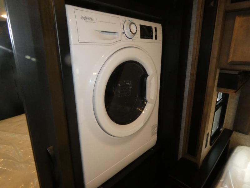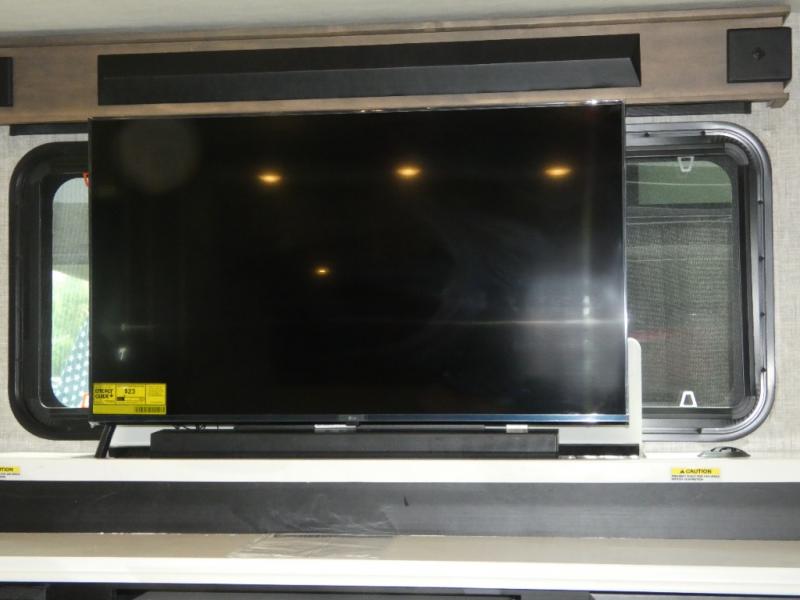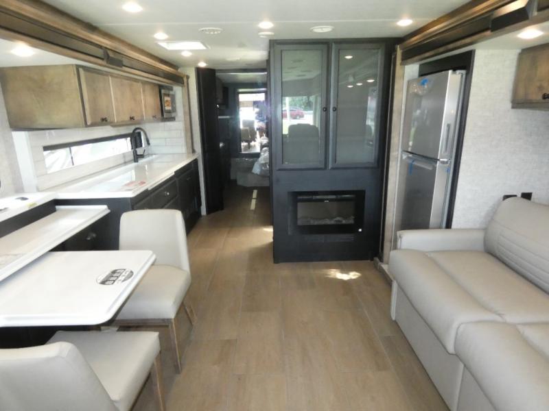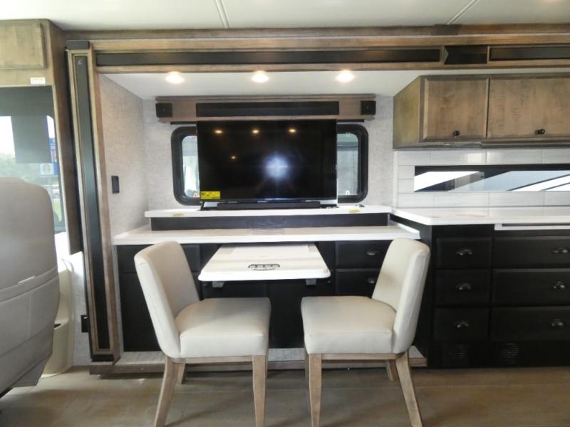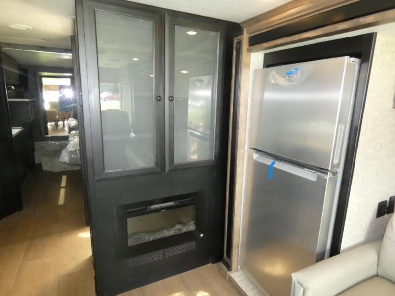 Pack your bags and load up into this motorhome for a luxurious adventure! The rear private bedroom has a king bed slide, a bank of drawers next to a TV, a large closet, and a wardrobe with washer and dryer so you can have clean clothes throughout your entire trip. The full bathroom has a shower skylight, gravity flush toilet, solid surface countertop, and a handheld shower head with a slide bar for added convenience. When you're ready to eat, just whip up a meal on the three burner propane cooktop or use the convection microwave. You can dine at the dinette computer workstation with a lift TV! You can spend your evenings with a movie since there is a living area TV with a fireplace, or you can head outdoor to enjoy the exterior TV and Girard power awning with LED lights!