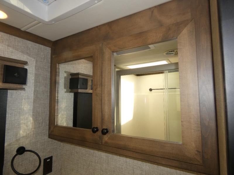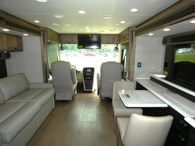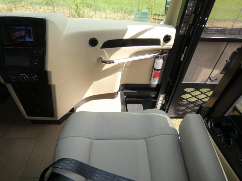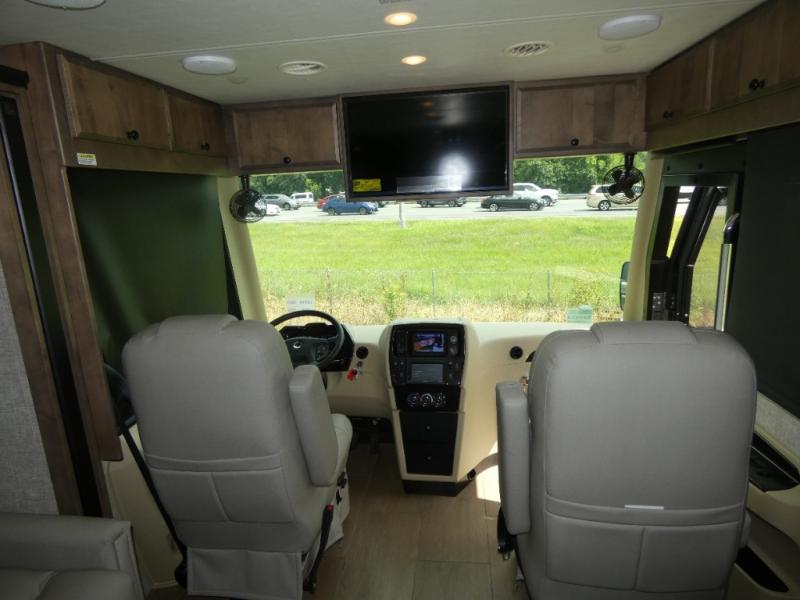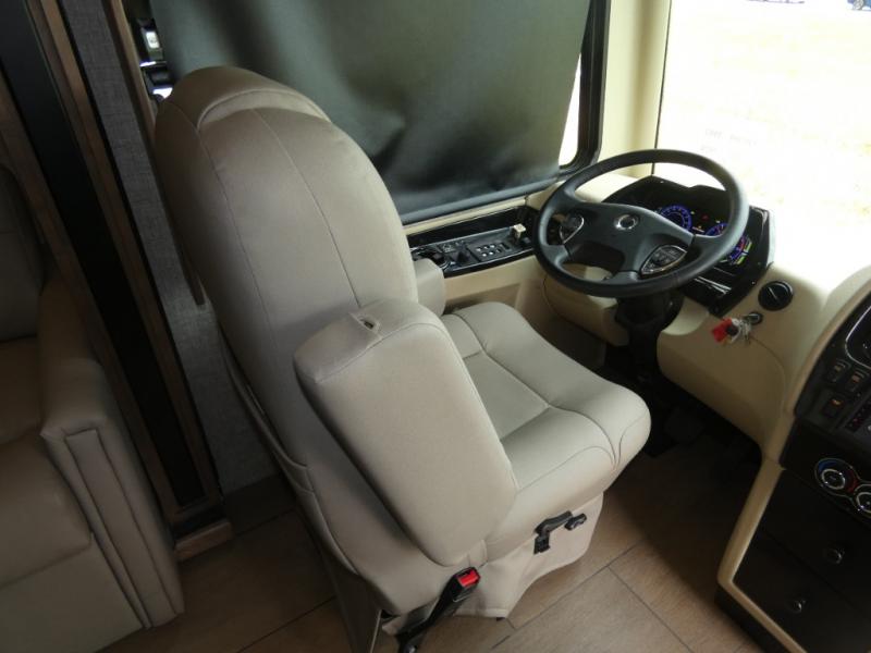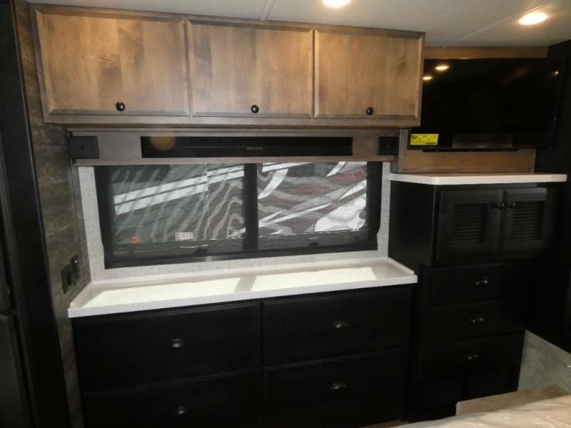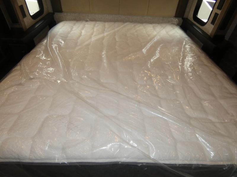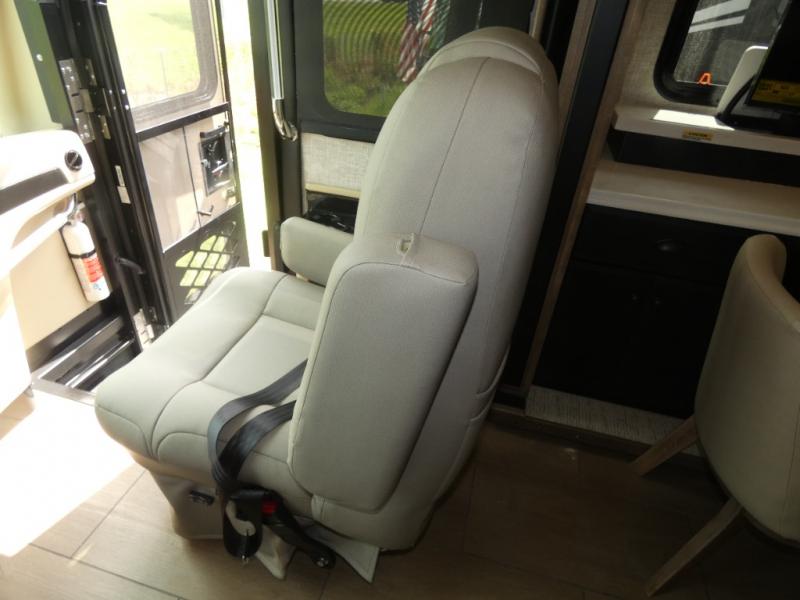 Pack your bags and load up into this motorhome for a luxurious adventure! The rear private bedroom has a king bed slide, a bank of drawers next to a TV, a large closet, and a wardrobe with washer and dryer so you can have clean clothes throughout your entire trip. The full bathroom has a shower skylight, gravity flush toilet, solid surface countertop, and a handheld shower head with a slide bar for added convenience. When you're ready to eat, just whip up a meal on the three burner propane cooktop or use the convection microwave. You can dine at the dinette computer workstation with a lift TV! You can spend your evenings with a movie since there is a living area TV with a fireplace, or you can head outdoor to enjoy the exterior TV and Girard power awning with LED lights!