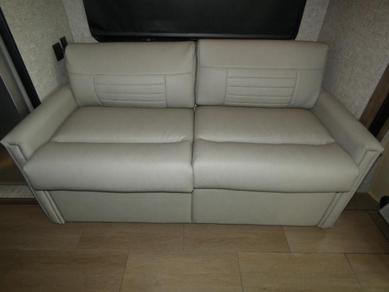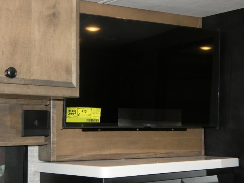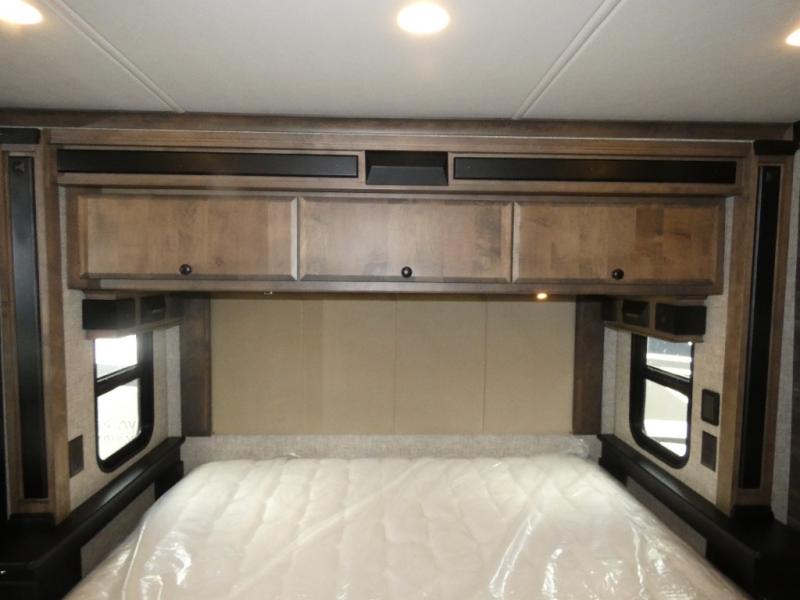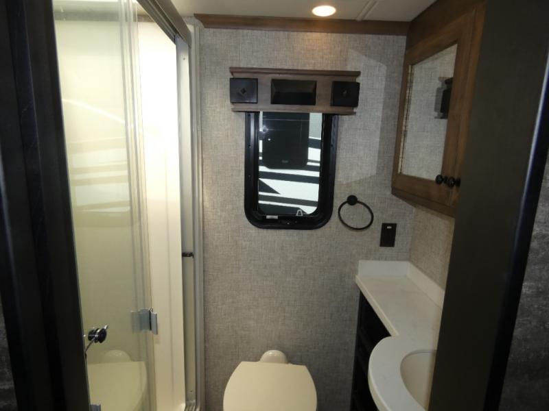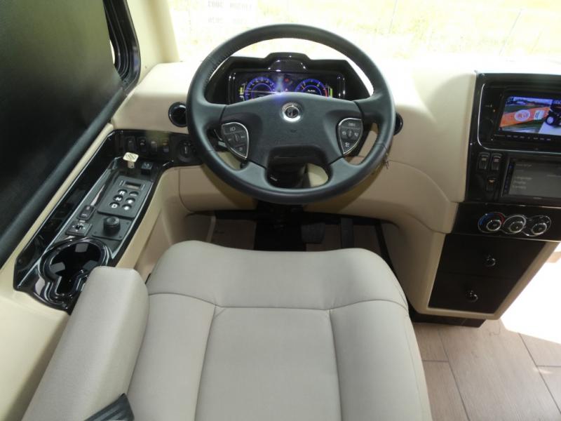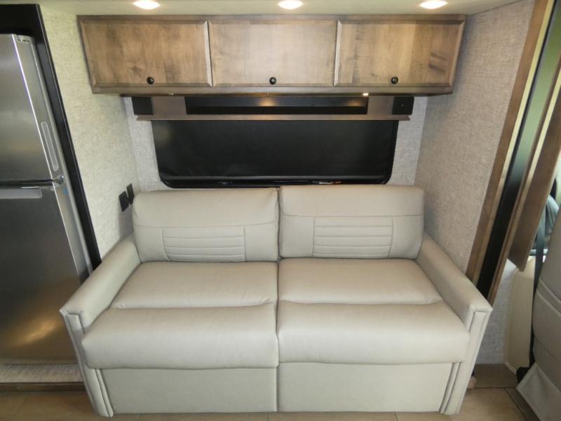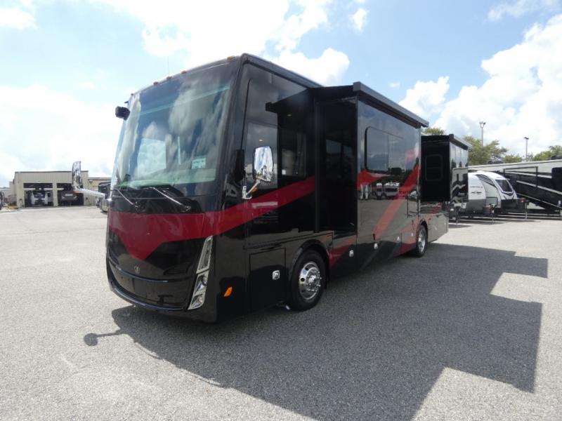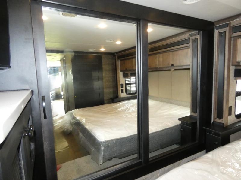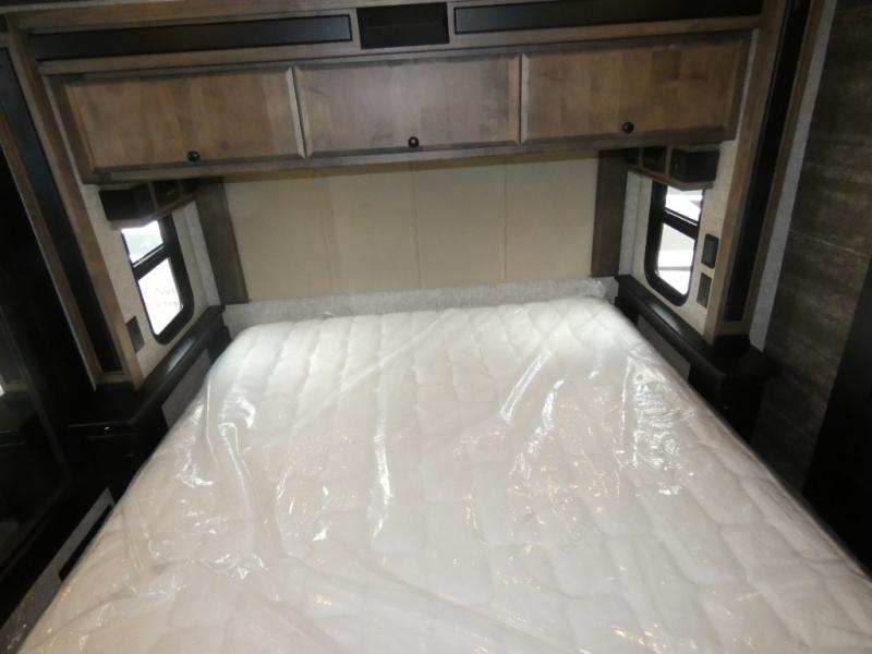 Pack your bags and load up into this motorhome for a luxurious adventure! The rear private bedroom has a king bed slide, a bank of drawers next to a TV, a large closet, and a wardrobe with washer and dryer so you can have clean clothes throughout your entire trip. The full bathroom has a shower skylight, gravity flush toilet, solid surface countertop, and a handheld shower head with a slide bar for added convenience. When you're ready to eat, just whip up a meal on the three burner propane cooktop or use the convection microwave. You can dine at the dinette computer workstation with a lift TV! You can spend your evenings with a movie since there is a living area TV with a fireplace, or you can head outdoor to enjoy the exterior TV and Girard power awning with LED lights!