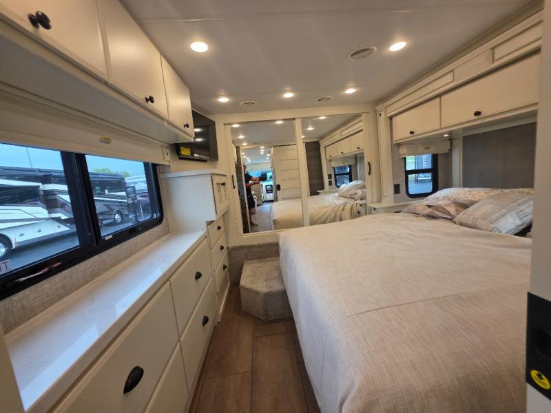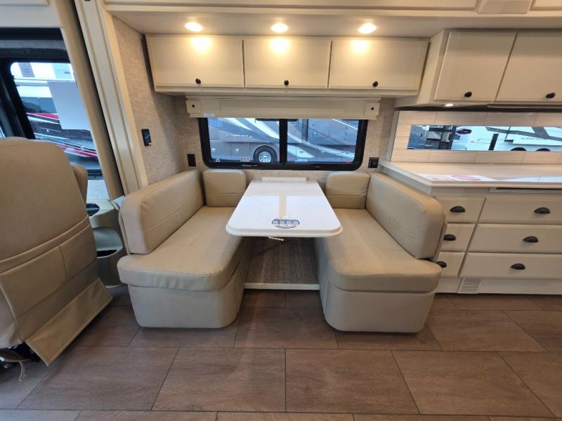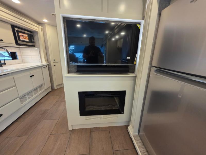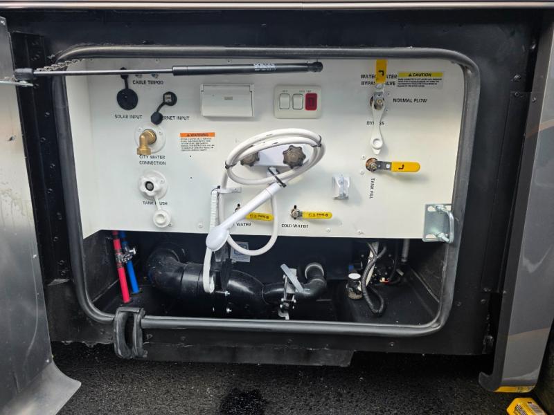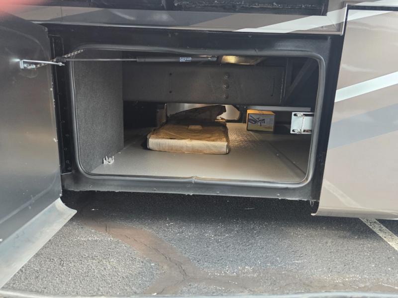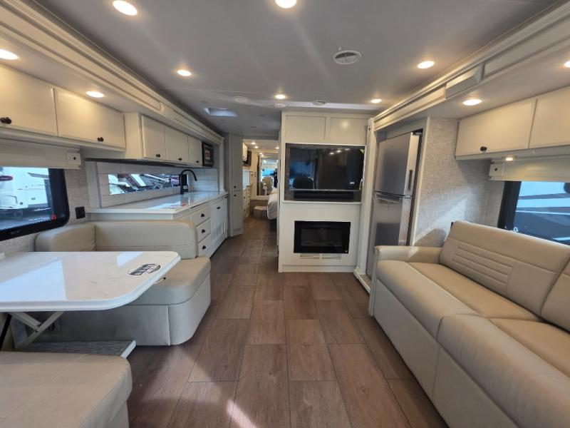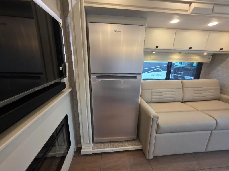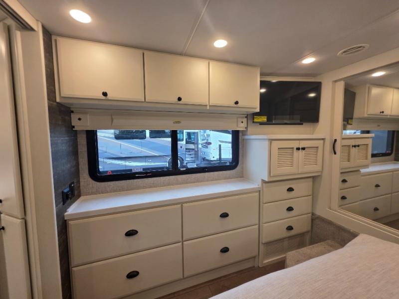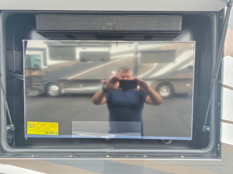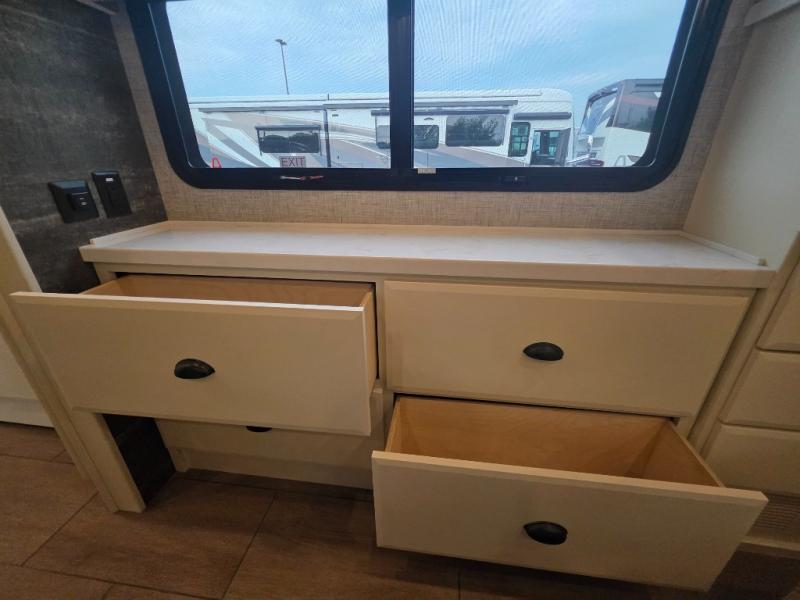 Pack your bags and load up into this motorhome for a luxurious adventure! The rear private bedroom has a king bed slide that can be switched for an optional queen bed, a bank of drawers next to a TV, a large closet, and a wardrobe that is prepped to add an optional washer and dryer so you can have clean clothes throughout your entire trip. The full bathroom has a shower skylight, gravity flush toilet, solid surface countertop, and a handheld shower head with a slide bar for added convenience. When you're ready to eat, just whip up a meal on the three burner propane cooktop or use the convection microwave. You can dine at the booth dinette, or maybe switch out the dinette for an optional dinette computer workstation with a lift TV! You can spend your evenings with a movie since there is a living area TV with an optional fireplace, or you can head outdoor to enjoy the exterior TV and Girard power awning with LED lights!
