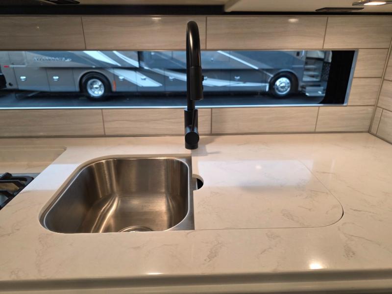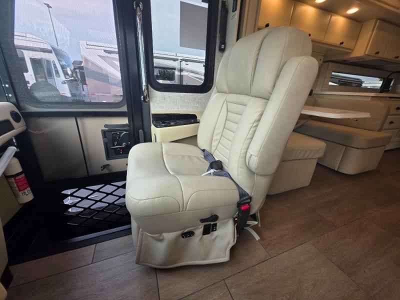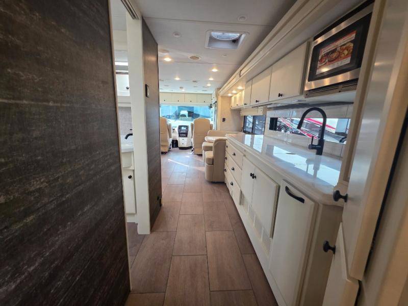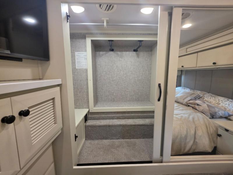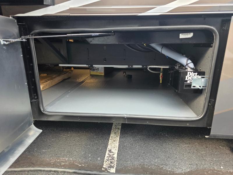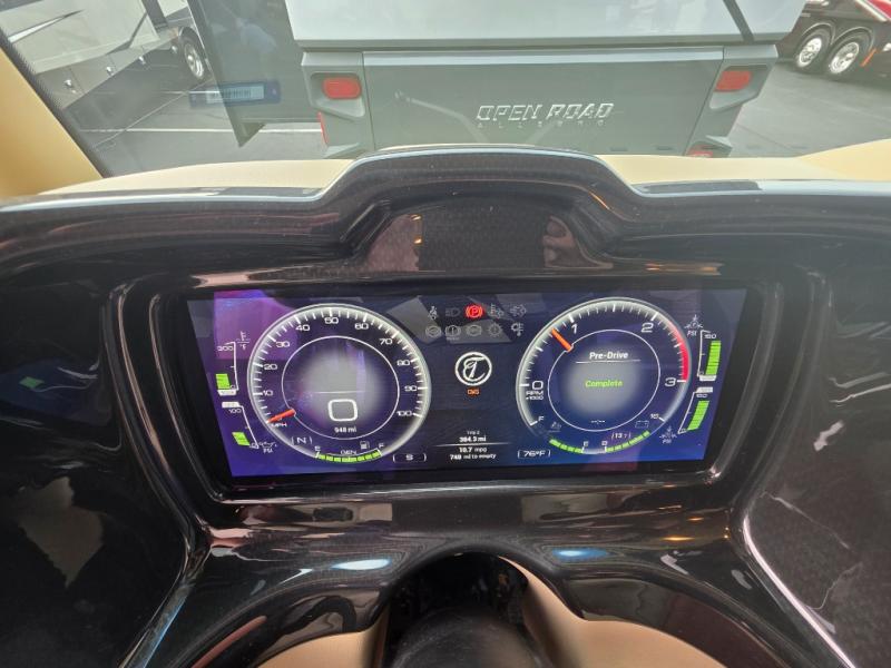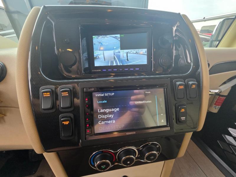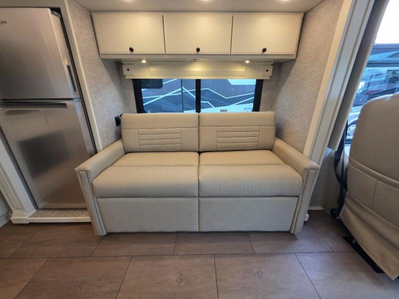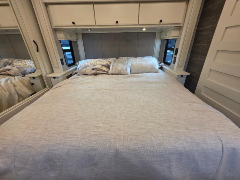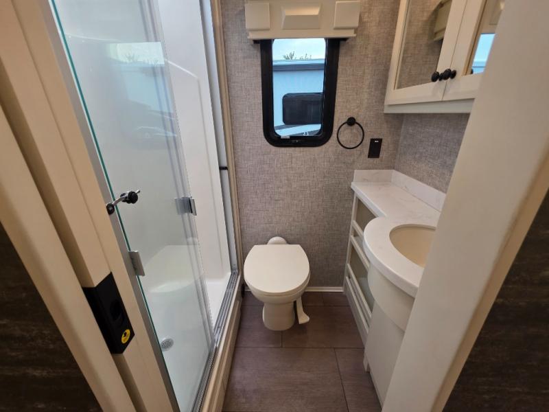 Pack your bags and load up into this motorhome for a luxurious adventure! The rear private bedroom has a king bed slide that can be switched for an optional queen bed, a bank of drawers next to a TV, a large closet, and a wardrobe that is prepped to add an optional washer and dryer so you can have clean clothes throughout your entire trip. The full bathroom has a shower skylight, gravity flush toilet, solid surface countertop, and a handheld shower head with a slide bar for added convenience. When you're ready to eat, just whip up a meal on the three burner propane cooktop or use the convection microwave. You can dine at the booth dinette, or maybe switch out the dinette for an optional dinette computer workstation with a lift TV! You can spend your evenings with a movie since there is a living area TV with an optional fireplace, or you can head outdoor to enjoy the exterior TV and Girard power awning with LED lights!