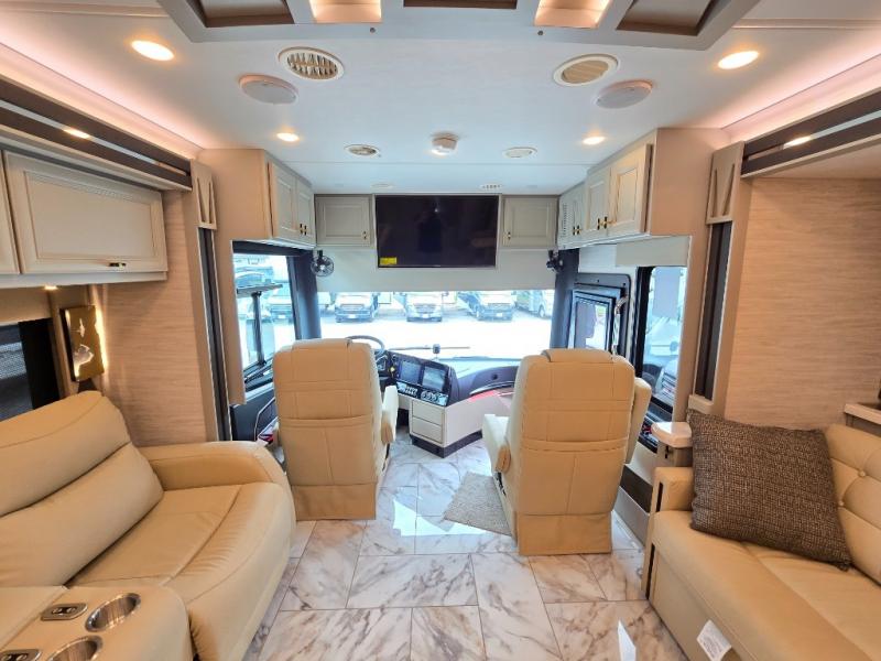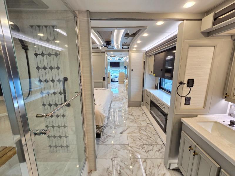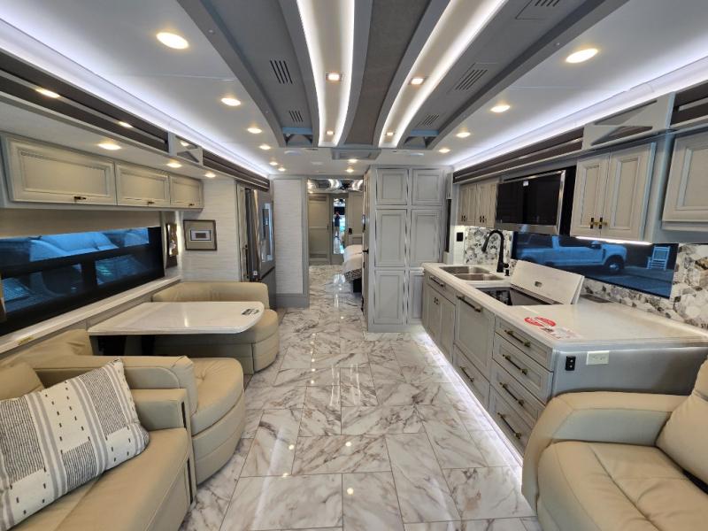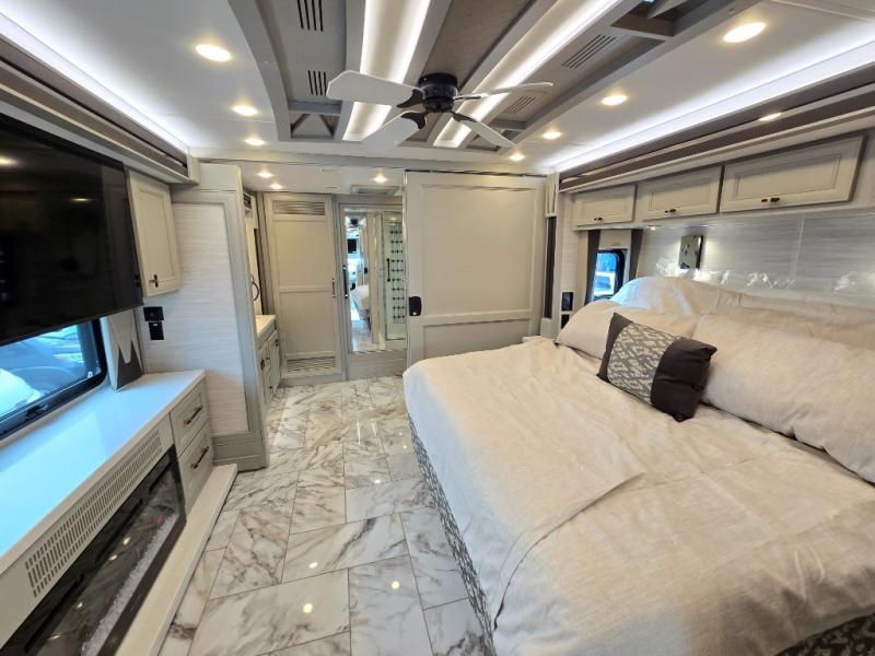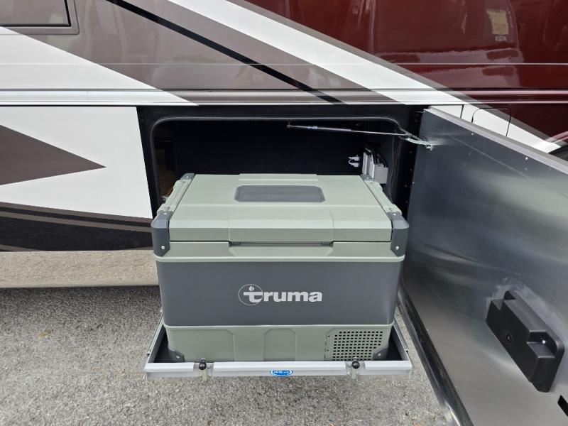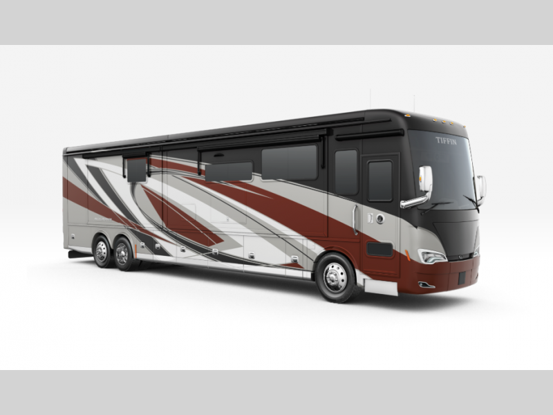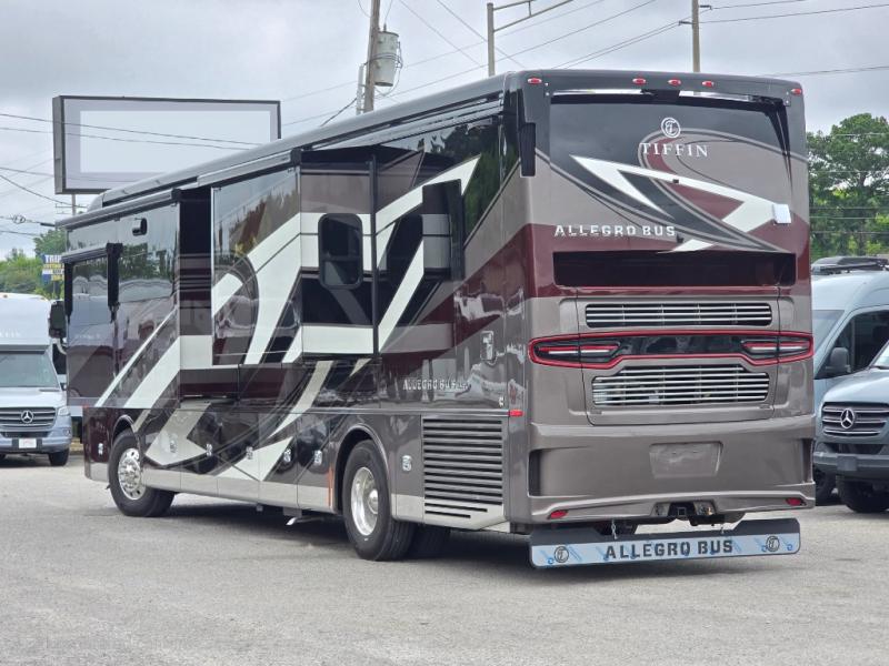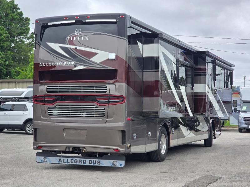 With any Allegro Bus Class A diesel coaches by Tiffin Motorhomes you will experience ultimate luxury, breakthrough technology, and unmatched power thanks to the 450 HP Cummins L9 engine. The captain's job is made easier than ever with the adaptive cruise control, the collision mitigation with forward warning and active braking, and the Valid instrument cluster display with integrated leveling controls. This hydronic heating and electronic appliance-equipped coach features two Girard roof awnings, an Onan 10.0 kW generator, and three 15,000 BTU A/C units to keep you comfortable all year long. New and exciting features include a drawer-style dishwasher on each model, Gold Heat dual zones heated tile floors, Starlink Pro with a subscription, and more!