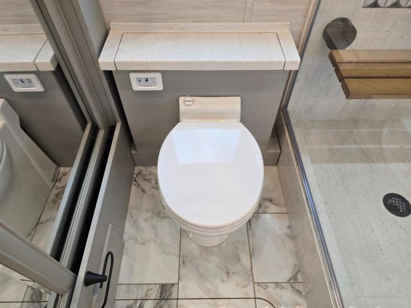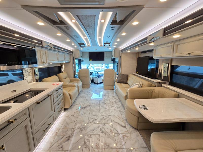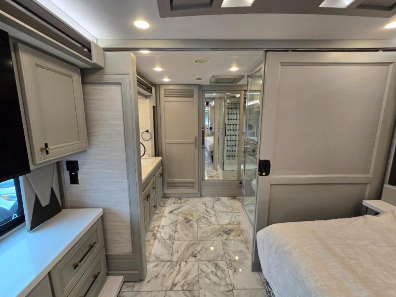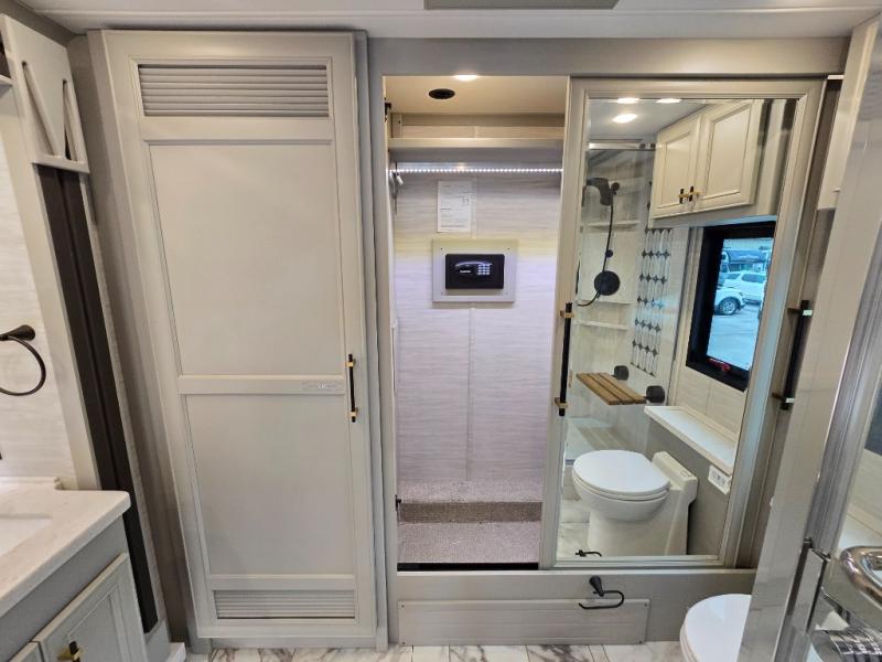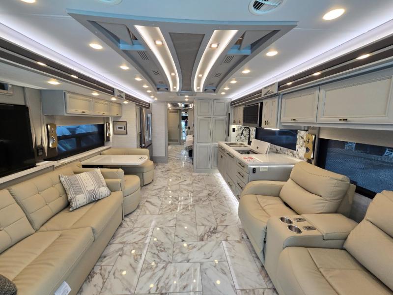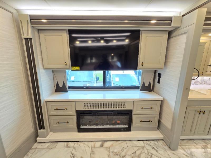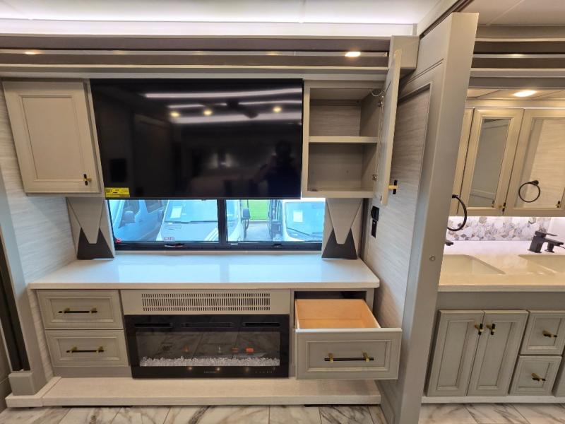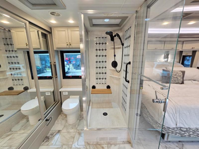 With any Allegro Bus Class A diesel coaches by Tiffin Motorhomes you will experience ultimate luxury, breakthrough technology, and unmatched power thanks to the 450 HP Cummins L9 engine. The captain's job is made easier than ever with the adaptive cruise control, the collision mitigation with forward warning and active braking, and the Valid instrument cluster display with integrated leveling controls. This hydronic heating and electronic appliance-equipped coach features two Girard roof awnings, an Onan 10.0 kW generator, and three 15,000 BTU A/C units to keep you comfortable all year long. New and exciting features include a drawer-style dishwasher on each model, Gold Heat dual zones heated tile floors, Starlink Pro with a subscription, and more!