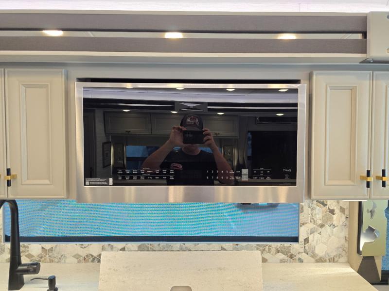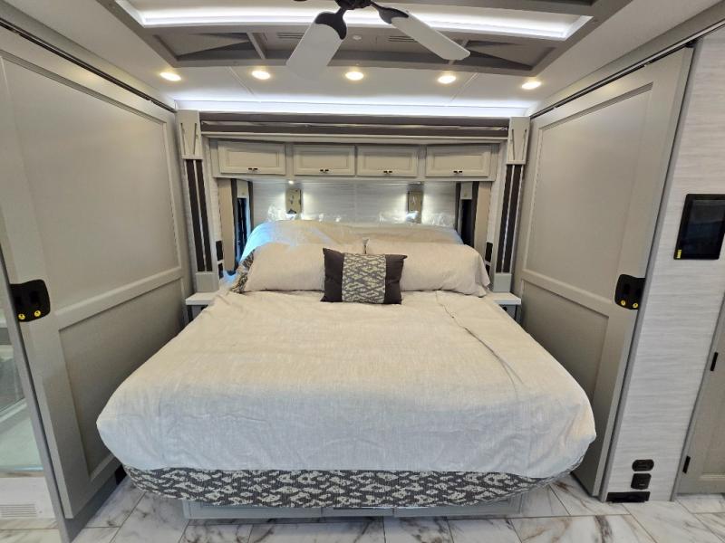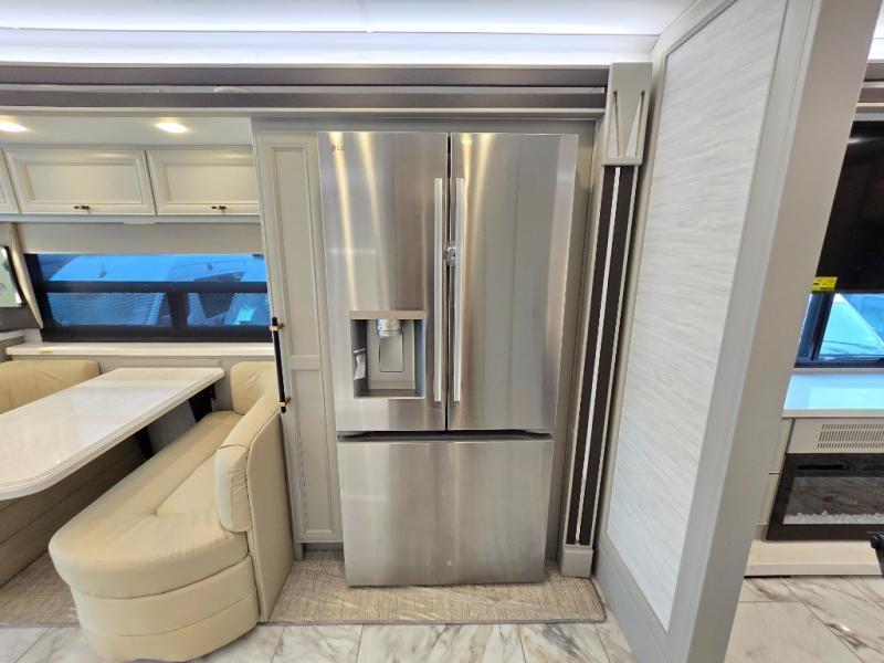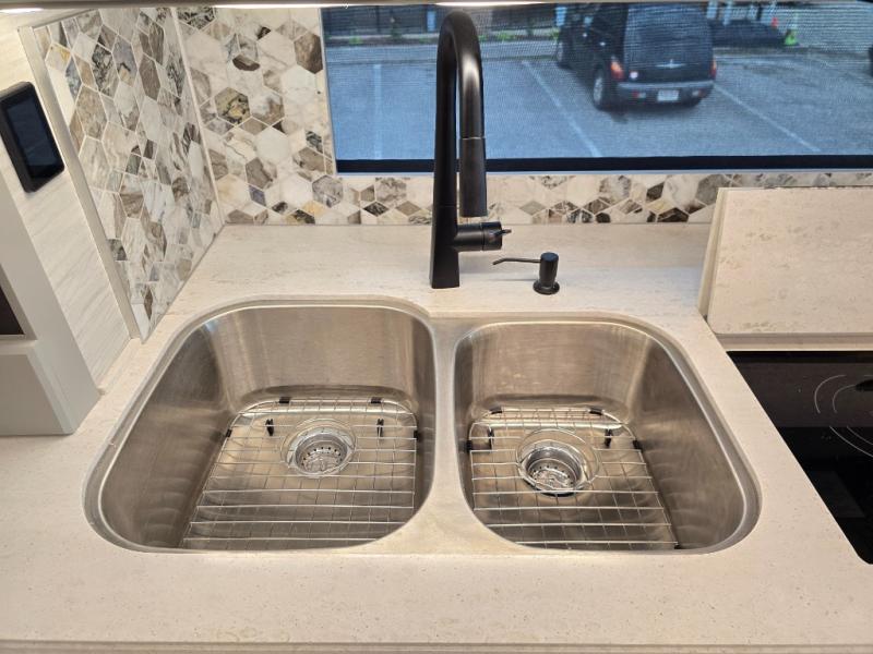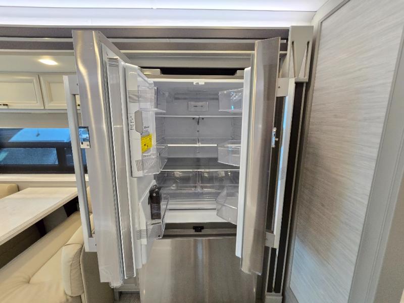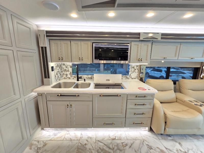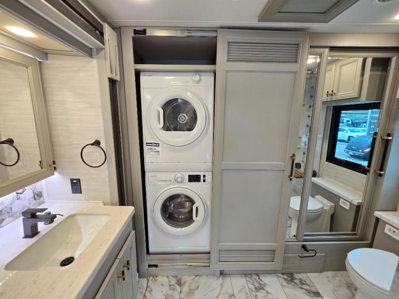 Now you can travel with more friends and family in this coach that includes a bath and a half, and additional sleeping space thanks to the two sofa beds. The master bedroom includes a king bed, 50" TV, plus dual nightstands for your belongings. Dual bath sinks in the full rear bath allow two people to freshen up at once, and a stacked washer and dryer to make wash day a breeze. And check out the kitchen with its residential refrigerator, pantry, stainless steel convection microwave, and drawer-type dishwasher! You will also appreciate the countertop extension for more prep space when it's time for dinner. The dinette with chairs provides a place to dine or get some work done, and one of the sofas includes an ottoman so you can kick your feet up.