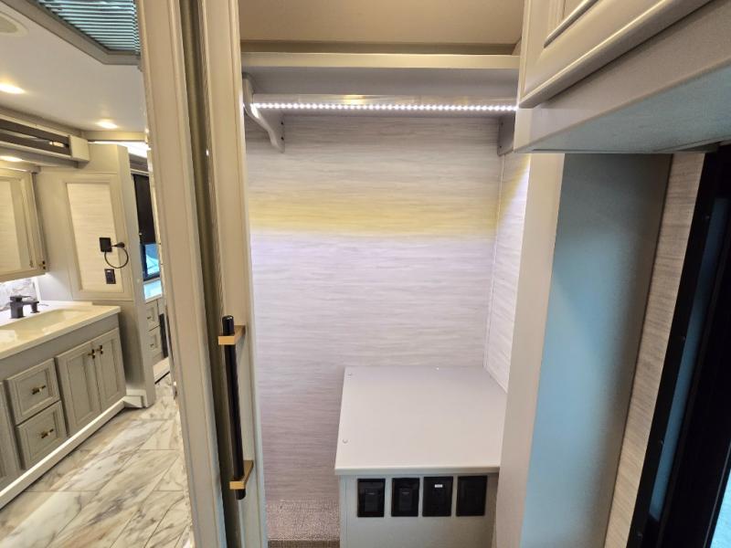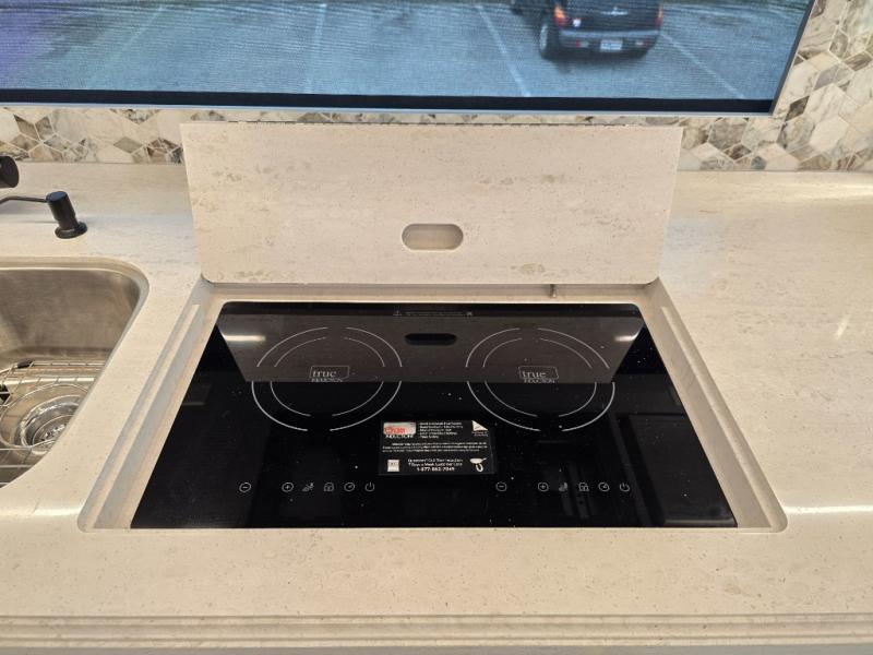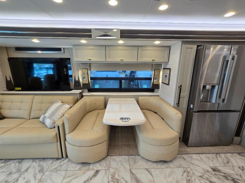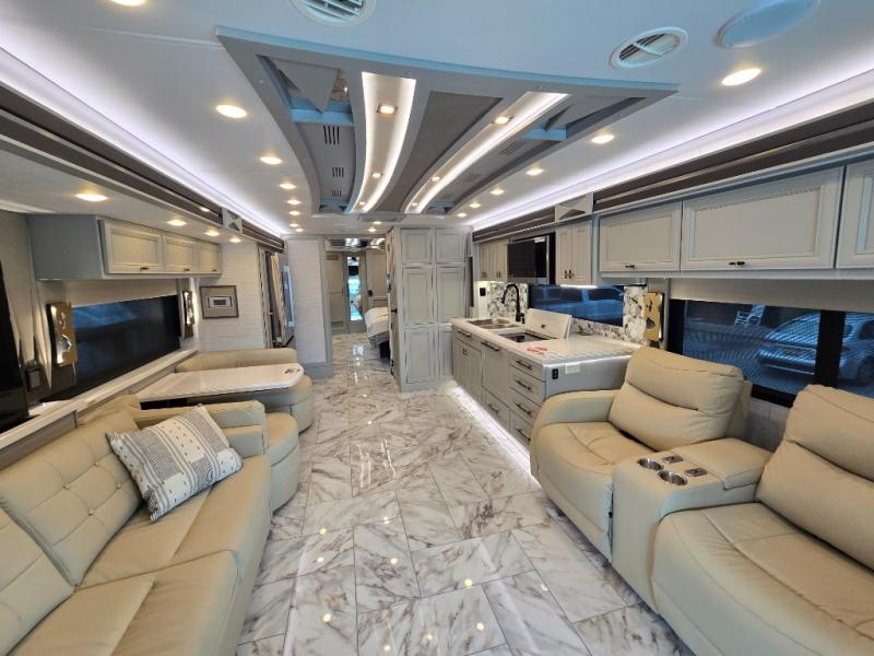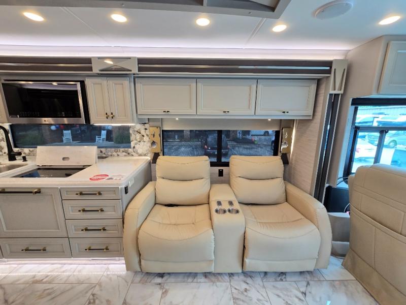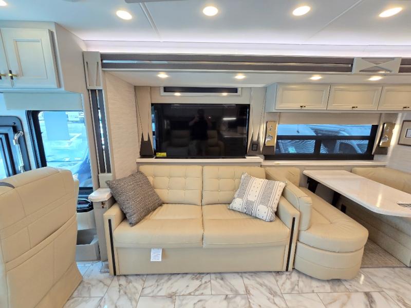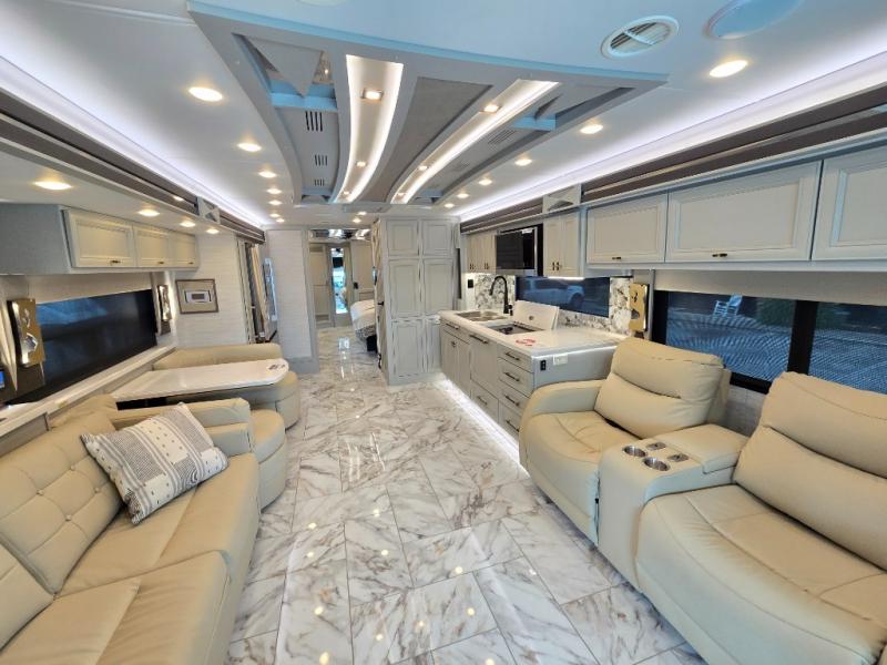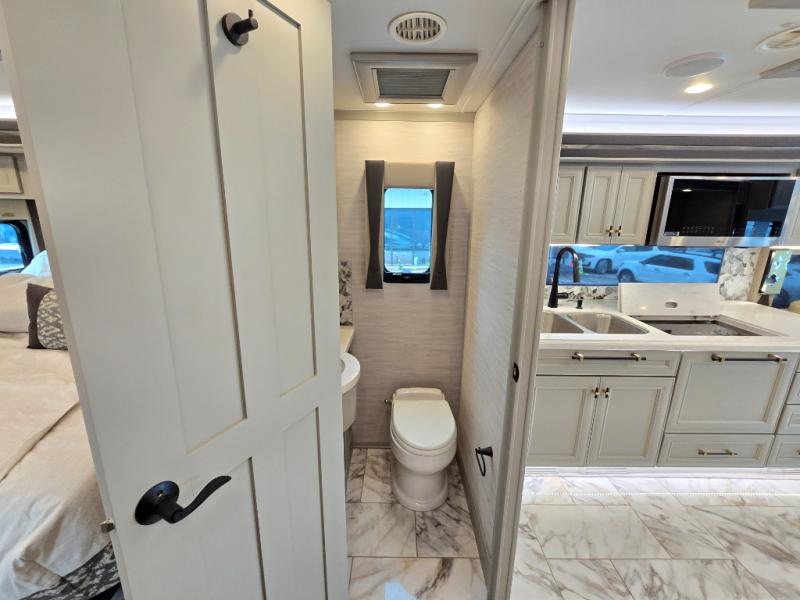 Now you can travel with more friends and family in this coach that includes a bath and a half, and additional sleeping space thanks to the two sofa beds. The master bedroom includes a king bed, 50" TV, plus dual nightstands for your belongings. Dual bath sinks in the full rear bath allow two people to freshen up at once, and a stacked washer and dryer to make wash day a breeze. And check out the kitchen with its residential refrigerator, pantry, stainless steel convection microwave, and drawer-type dishwasher! You will also appreciate the countertop extension for more prep space when it's time for dinner. The dinette with chairs provides a place to dine or get some work done, and one of the sofas includes an ottoman so you can kick your feet up.