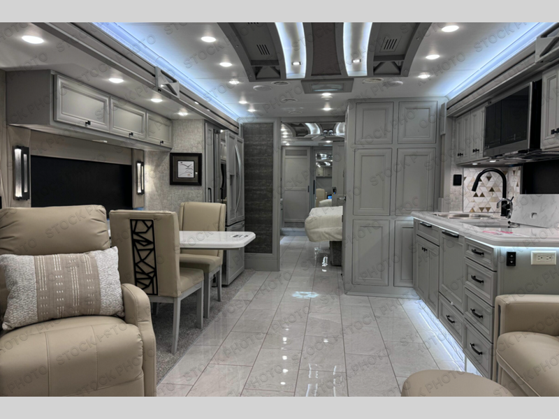 Now you can travel with more friends and family in this coach that includes a bath and a half, and additional sleeping space thanks to the two sofa beds. The master bedroom includes a king bed, 50" TV, plus dual nightstands for your belongings. Dual bath sinks in the full rear bath allow two people to freshen up at once, and a stacked washer and dryer to make wash day a breeze. And check out the kitchen with its residential refrigerator, pantry, stainless steel convection microwave, and drawer-type dishwasher! You will also appreciate the countertop extension for more prep space when it's time for dinner. The dinette with chairs provides a place to dine or get some work done, and one of the sofas includes an ottoman so you can kick your feet up.