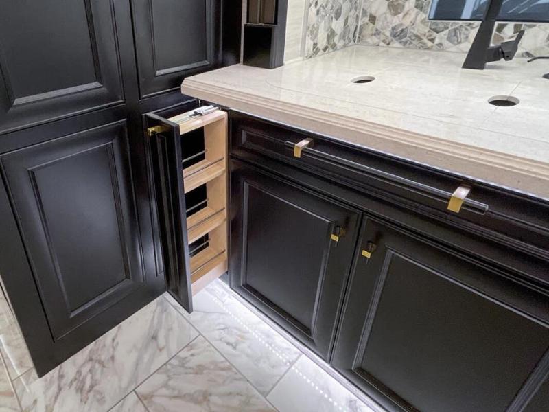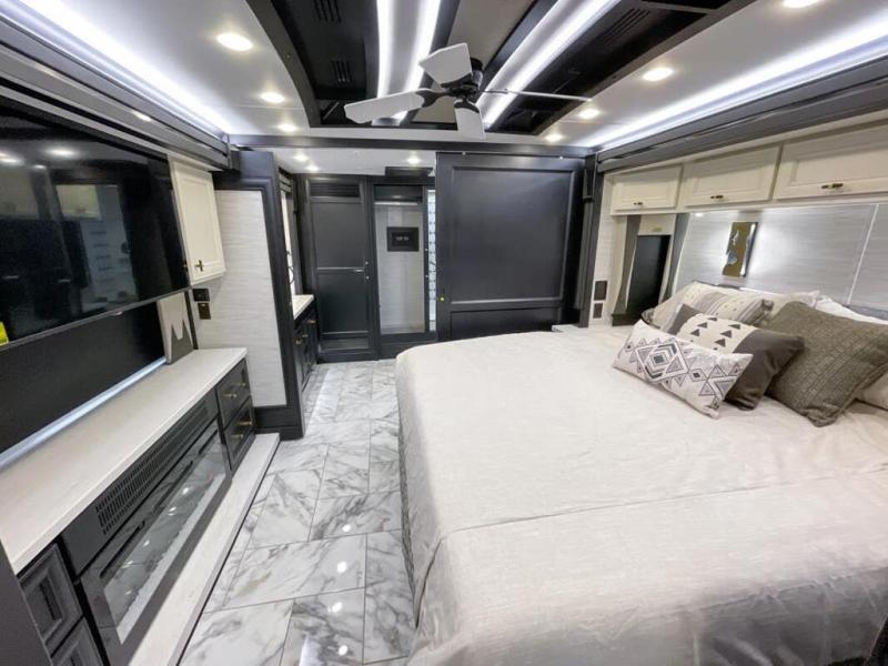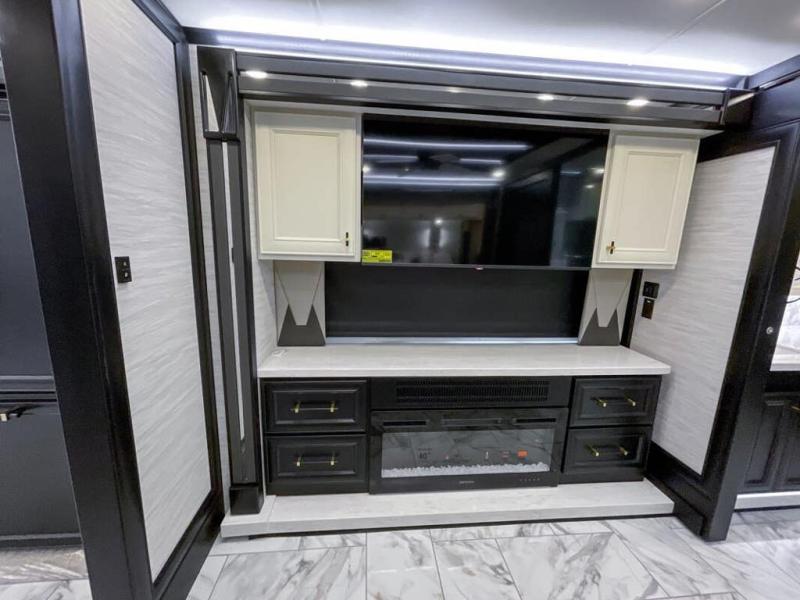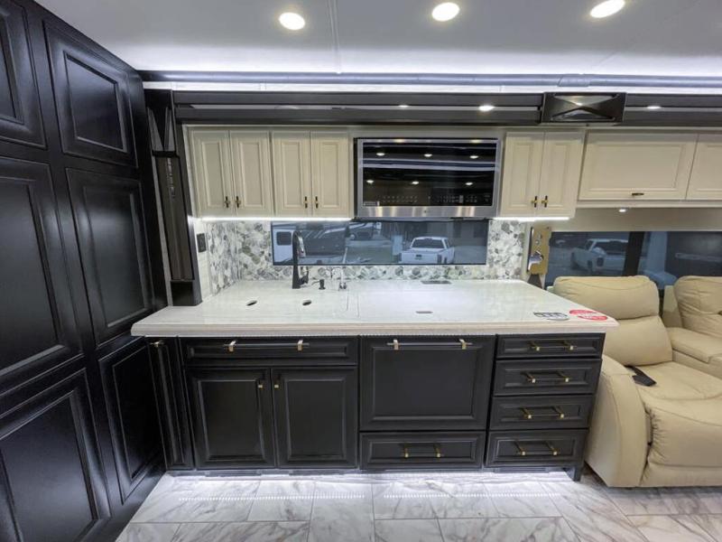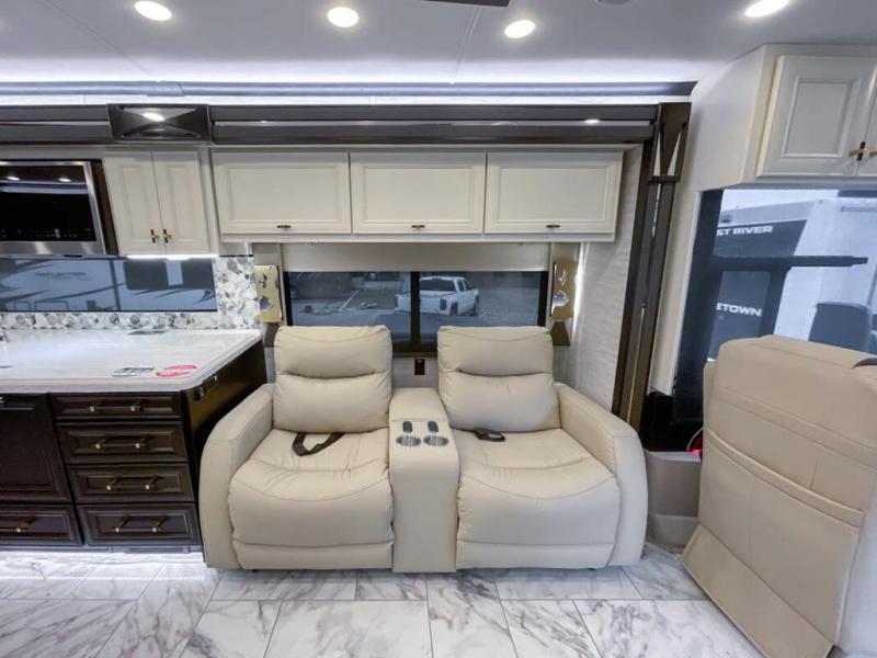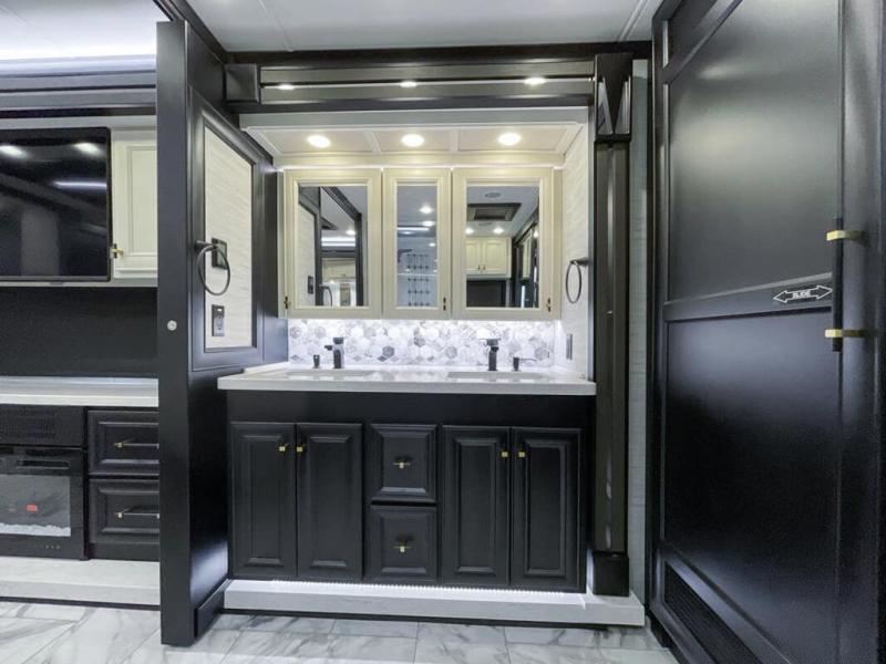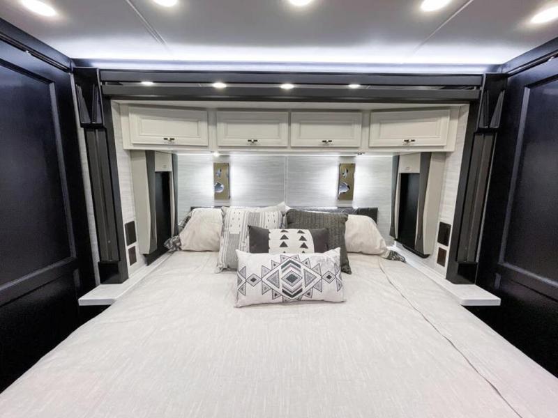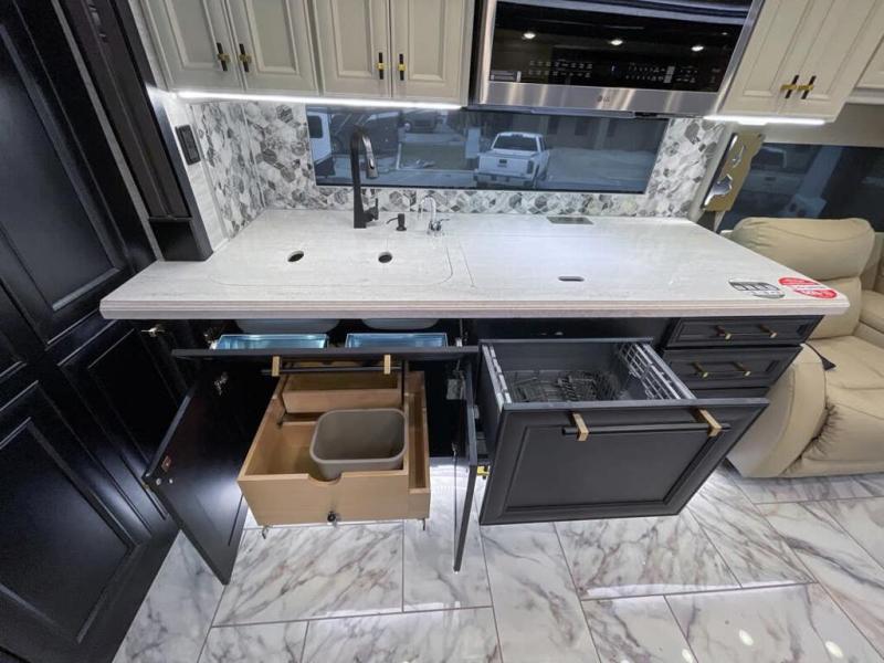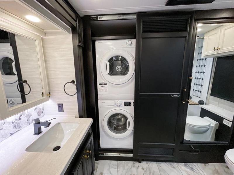 Now you can travel with more friends and family in this coach that includes a bath and a half, and additional sleeping space thanks to the two sofa beds. The master bedroom includes a king bed, 50" TV, plus dual nightstands for your belongings. Dual bath sinks in the full rear bath allow two people to freshen up at once, and a stacked washer and dryer to make wash day a breeze. And check out the kitchen with its residential refrigerator, pantry, stainless steel convection microwave, and drawer-type dishwasher! You will also appreciate the countertop extension for more prep space when it's time for dinner. The dinette with chairs provides a place to dine or get some work done, and one of the sofas includes an ottoman so you can kick your feet up.