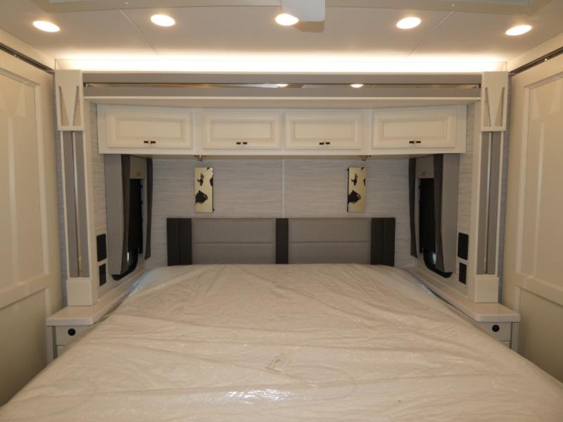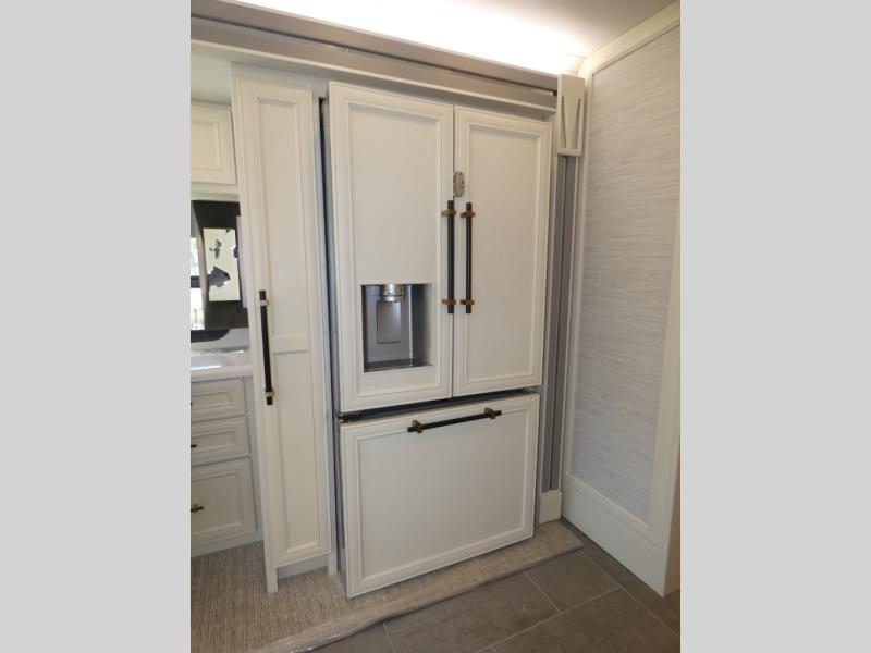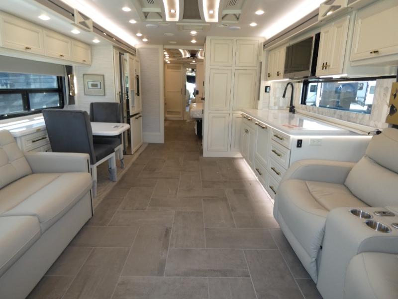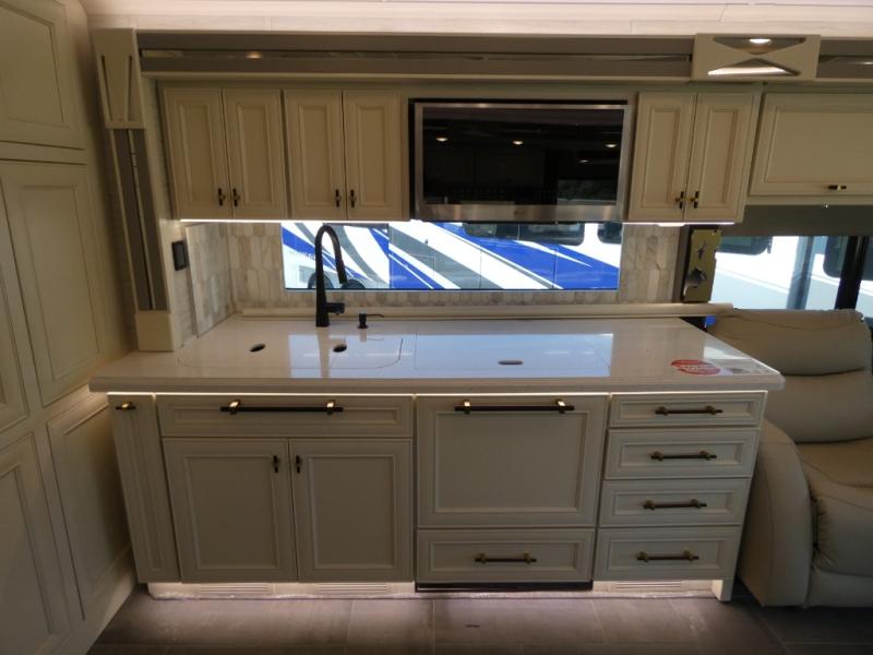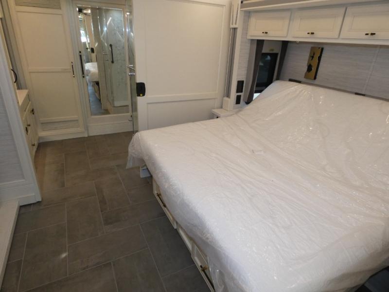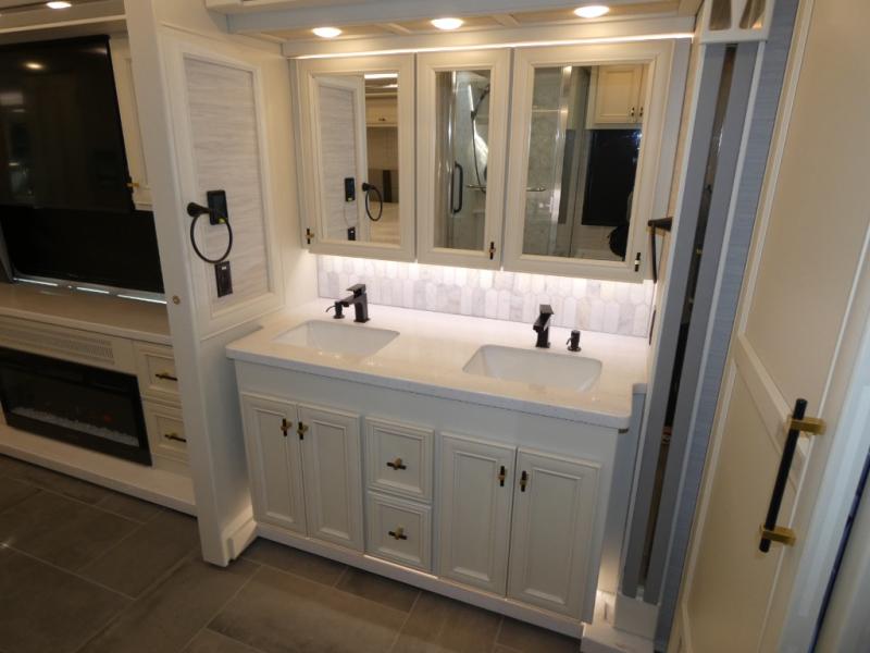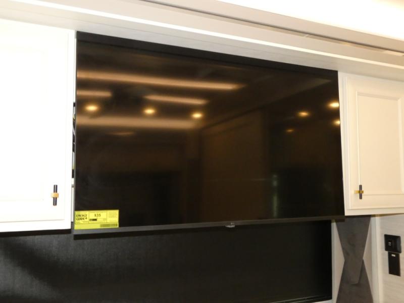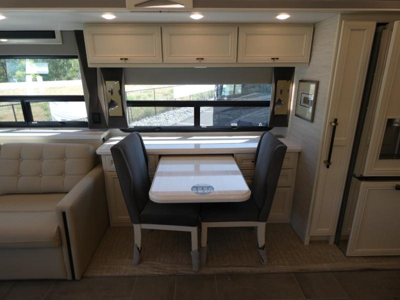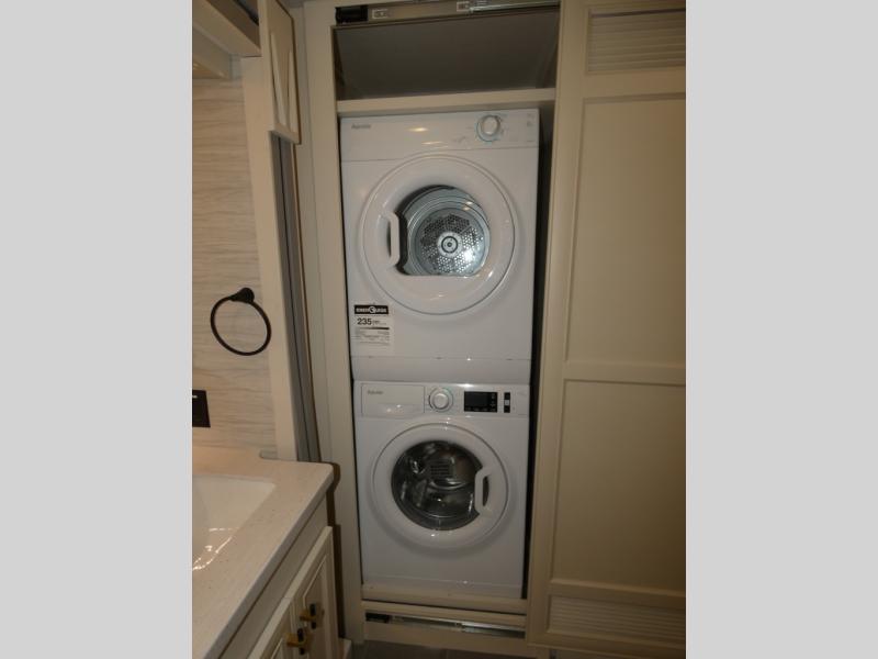 Now you can travel with more friends and family in this coach that includes a bath and a half. The master bedroom includes a king bed, 50" TV, plus dual nightstands for your belongings. Dual bath sinks in the full rear bath allow two people to freshen up at once, and a stacked washer and dryer to make wash day a breeze. And check out the kitchen with its residential refrigerator, pantry, stainless steel convection microwave, and drawer-type dishwasher! You will also appreciate the countertop extension for more prep space when it's time for dinner. The dinette with chairs provides a place to dine or get some work done.