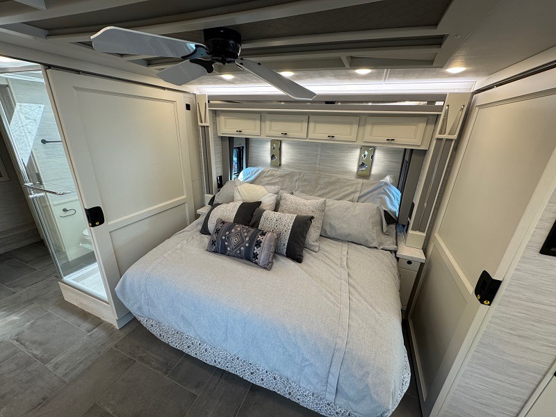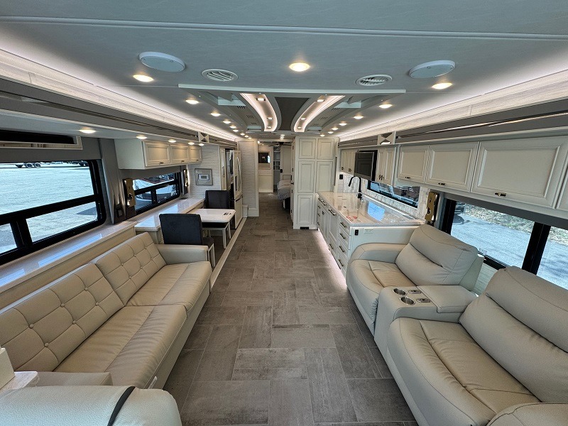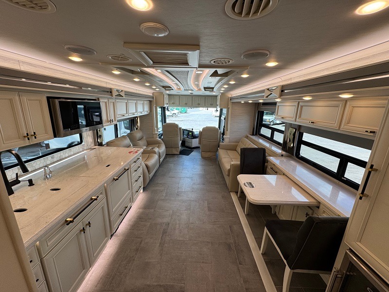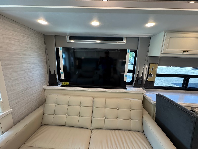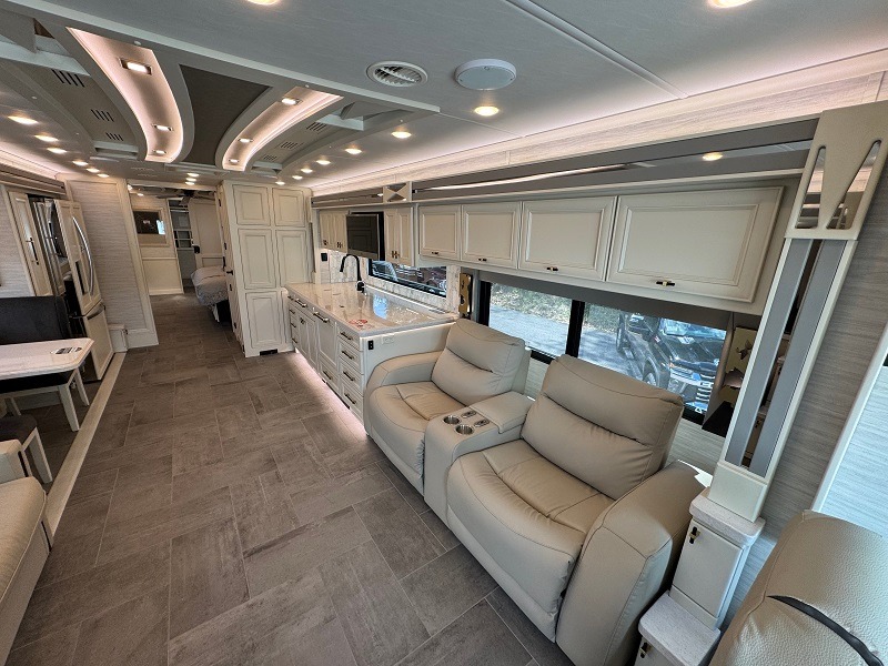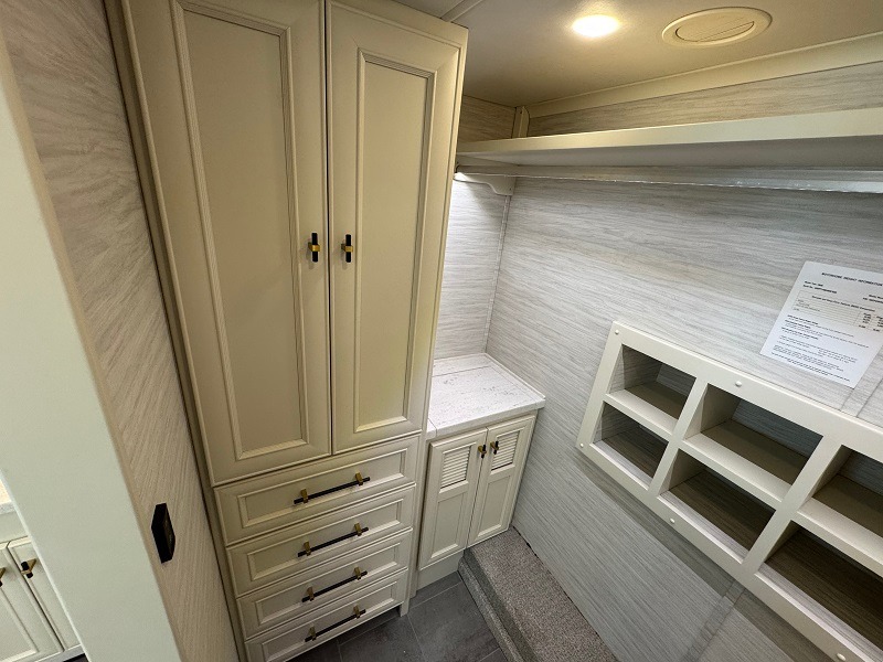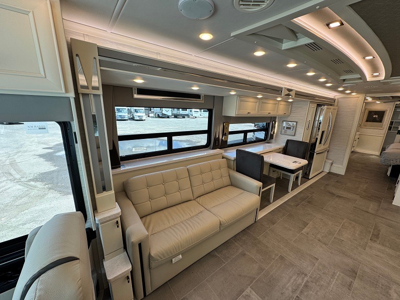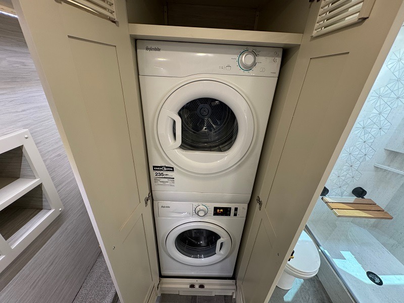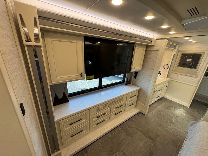 Fours slides, a bath and a half, plus sleeping space for six make this coach family friendly. There are two sofa beds in the main living area, plus a lift TV for your favorite shows. The chef of your group can cook meals on the two burner induction cooktop or in the stainless steel convection microwave with an air fryer, and there is a drawer-type dishwasher that will make clean up easier than ever. This model also includes a residential refrigerator plus pull-out storage and a stack of drawers for snacks galore. Enjoy a great night's rest on the king bed after traveling all day, and the full rear bath will allow you to clean up in luxury. There is even a floor-to-ceiling closet for maximum storage and a stacked washer and dryer; how convenient!