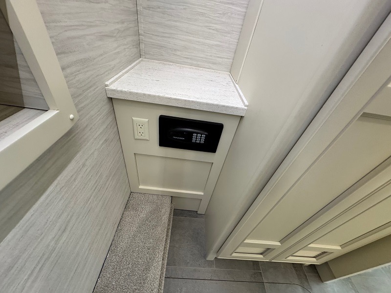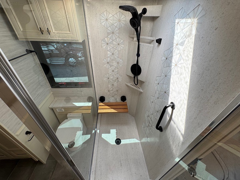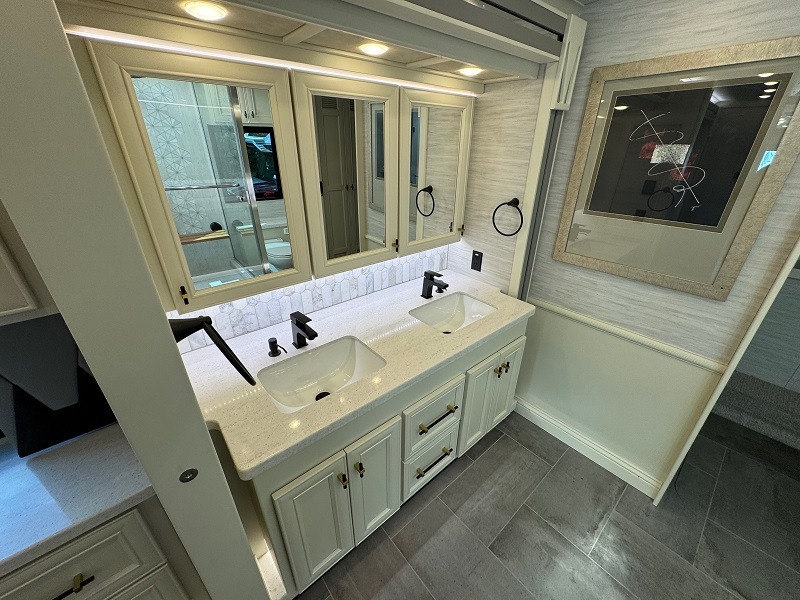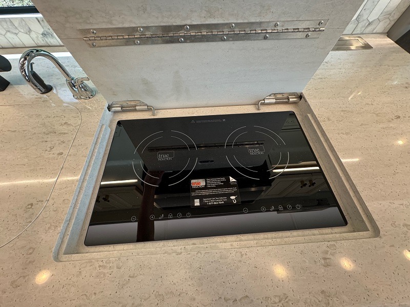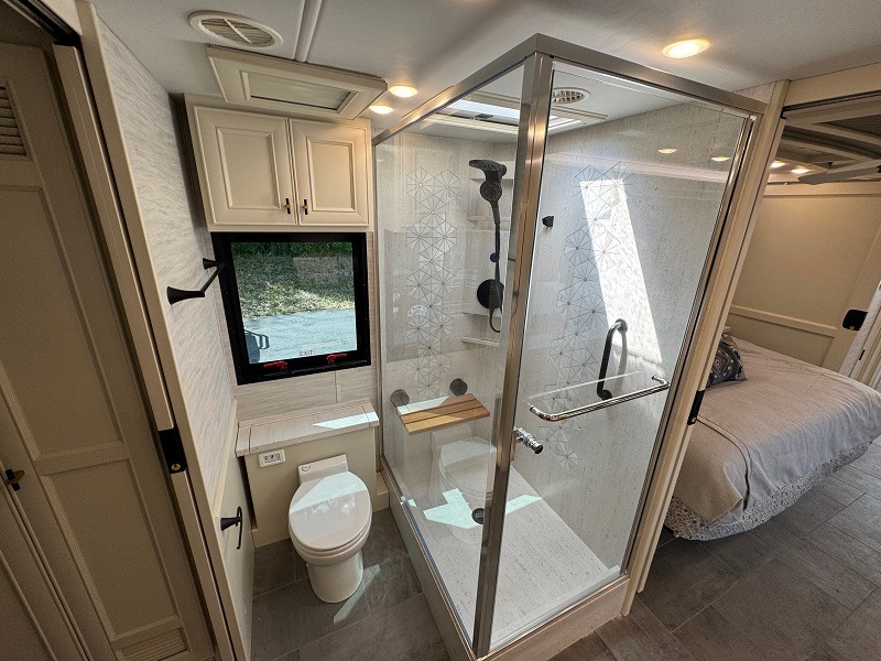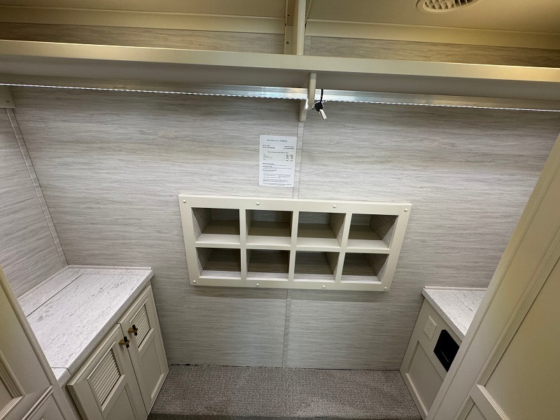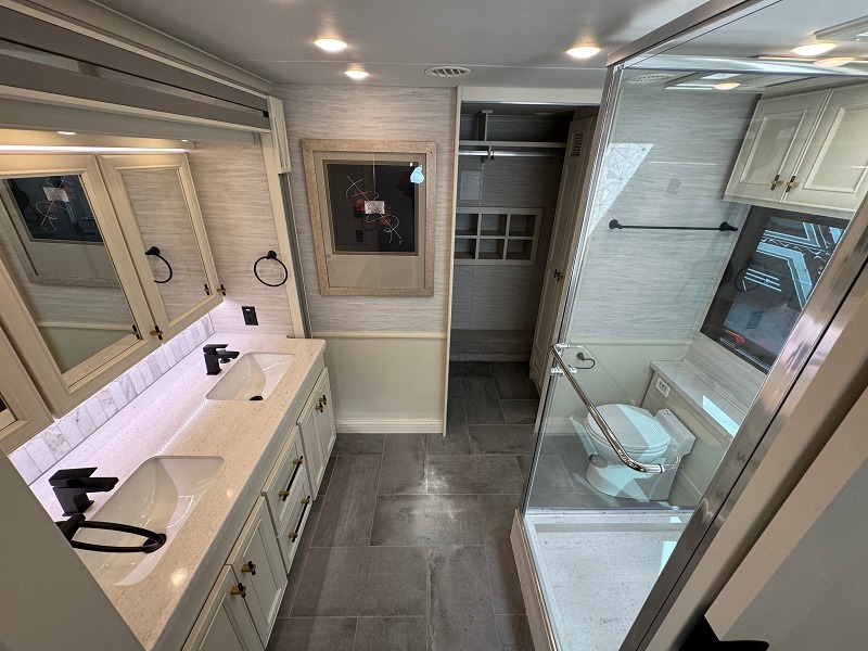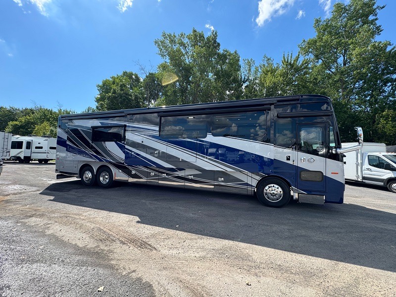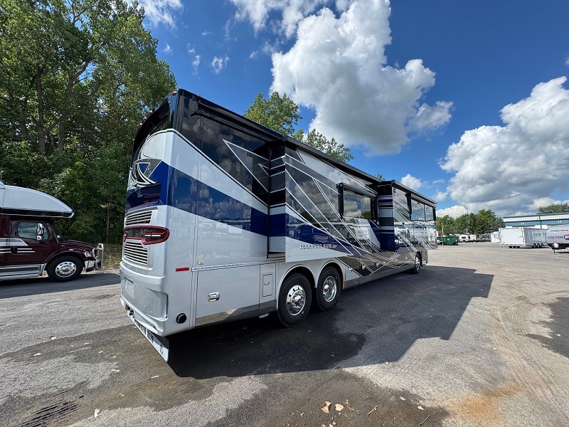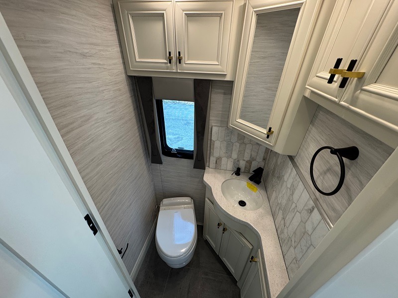 Fours slides, a bath and a half, plus sleeping space for six make this coach family friendly. There are two sofa beds in the main living area, plus a lift TV for your favorite shows. The chef of your group can cook meals on the two burner induction cooktop or in the stainless steel convection microwave with an air fryer, and there is a drawer-type dishwasher that will make clean up easier than ever. This model also includes a residential refrigerator plus pull-out storage and a stack of drawers for snacks galore. Enjoy a great night's rest on the king bed after traveling all day, and the full rear bath will allow you to clean up in luxury. There is even a floor-to-ceiling closet for maximum storage and a stacked washer and dryer; how convenient!