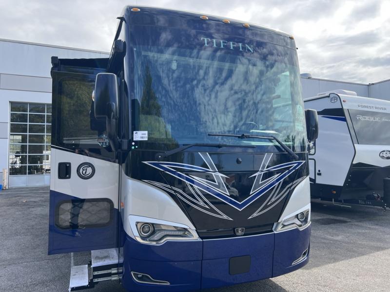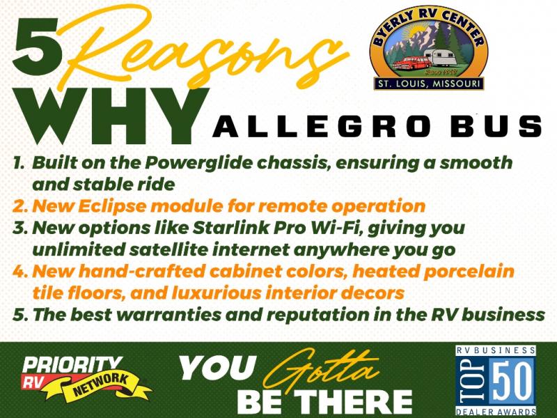 With any Allegro Bus Class A diesel coaches by Tiffin Motorhomes you will experience ultimate luxury, breakthrough technology, and unmatched power thanks to the 450 HP Cummins L9 engine. The captain's job is made easier than ever with the adaptive cruise control, the collision mitigation with forward warning and active braking, and the Valid instrument cluster display with integrated leveling controls. This hydronic heating and electronic appliance-equipped coach features two Girard roof awnings, an Onan 10.0 kW generator, and three 15,000 BTU A/C units to keep you comfortable all year long. You will also enjoy the handcrafted cabinetry, solid surface galley countertops, and Gold Heat dual zones heated tile floor to name a few luxuries! New and exciting features a Mobileye lane departure warning system, new Generation 15 exterior paint options, new interior decor options, and more!