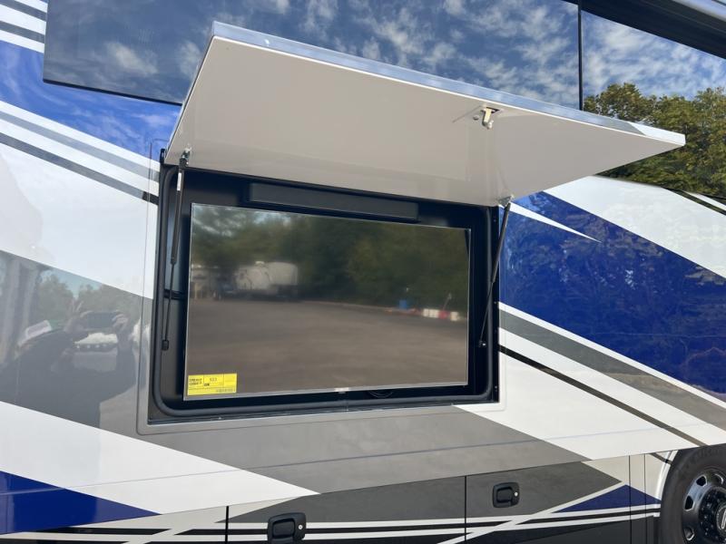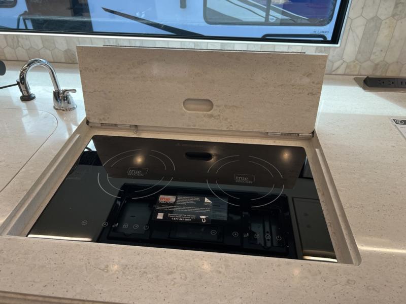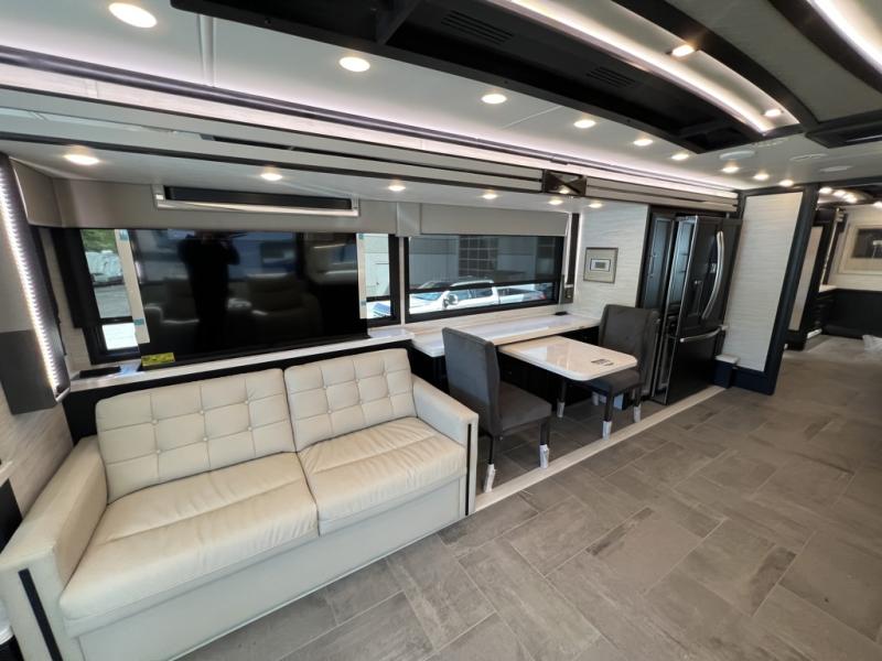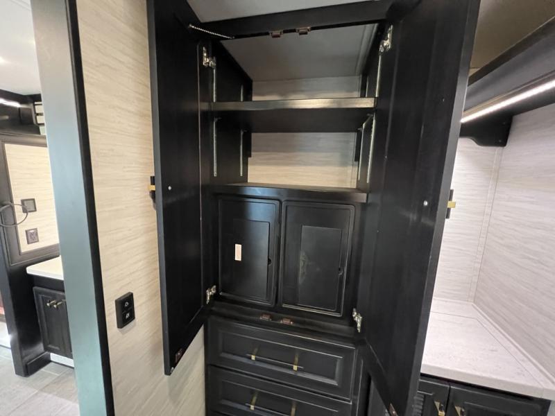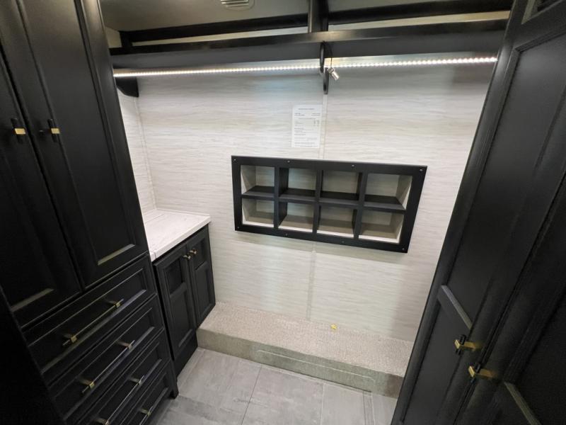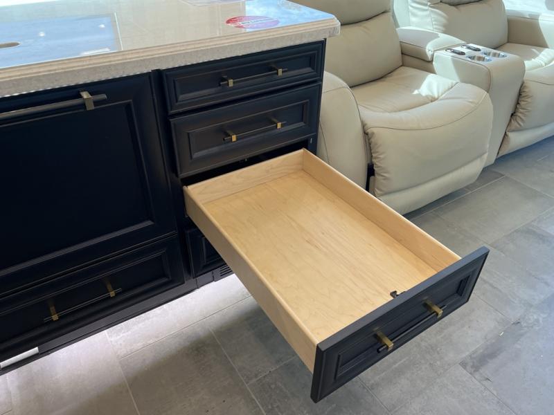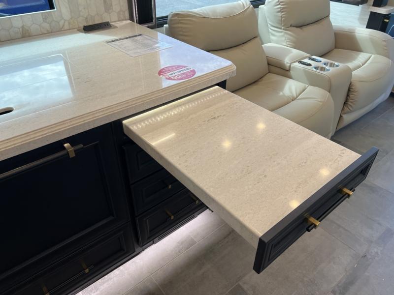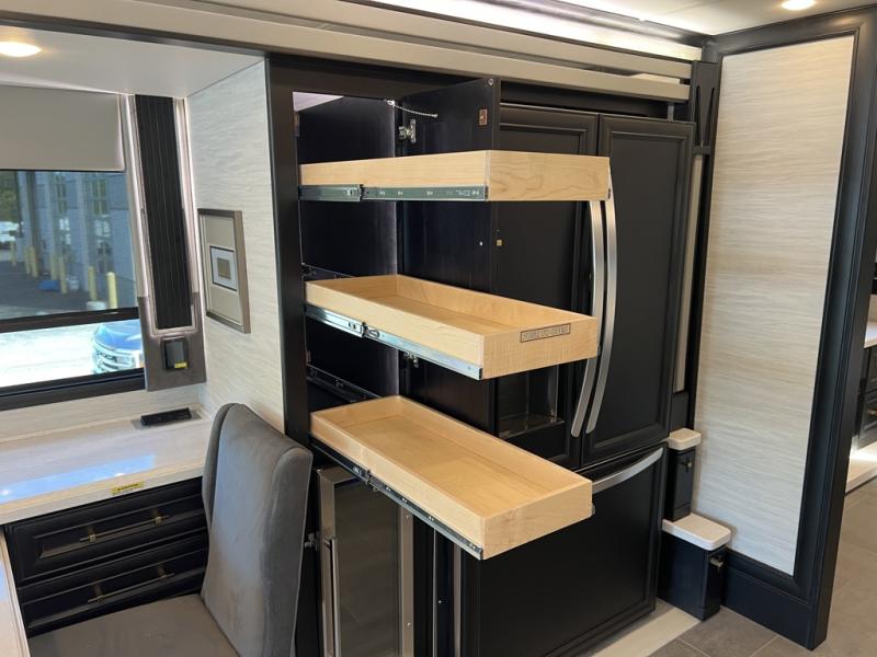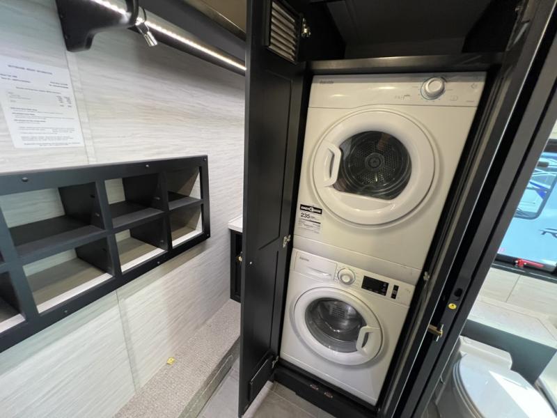 Fours slides, a bath and a half, plus sleeping space for six make this coach family friendly. There are two sofa beds in the main living area, plus a lift TV for your favorite shows. The chef of your group can cook meals on the two burner induction cooktop or in the stainless steel convection microwave with an air fryer, and there is a drawer-type dishwasher that will make clean up easier than ever. This model also includes a residential refrigerator plus pull-out storage and a stack of drawers for snacks galore. Enjoy a great night's rest on the king bed after traveling all day, and the full rear bath will allow you to clean up in luxury. There is even a floor-to-ceiling closet for maximum storage and a stacked washer and dryer; how convenient!