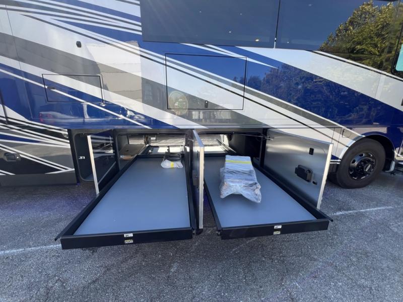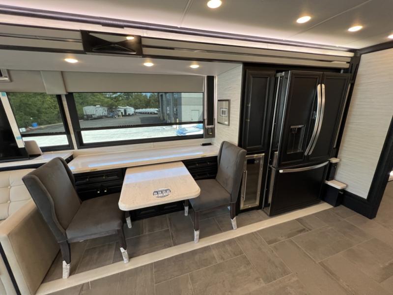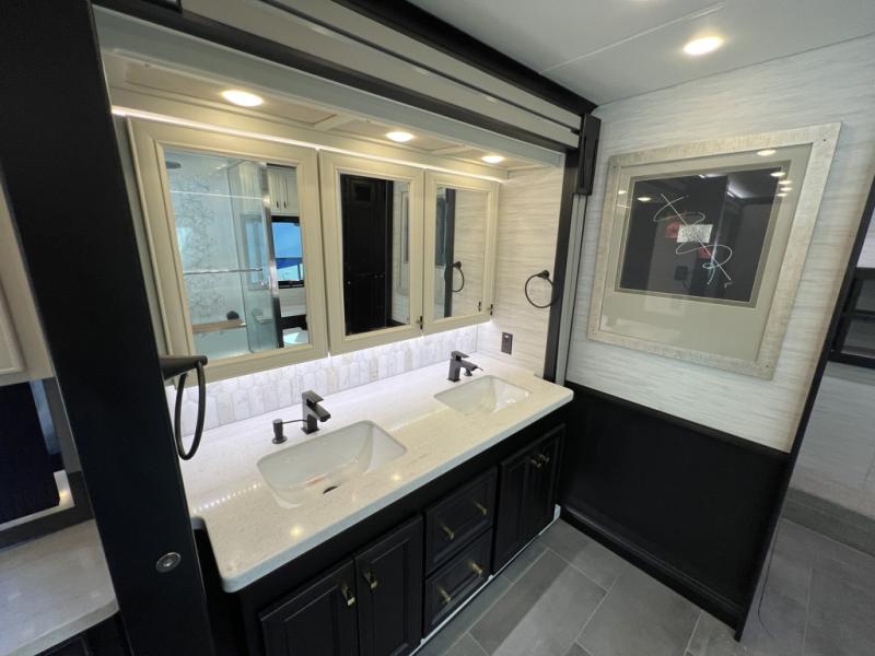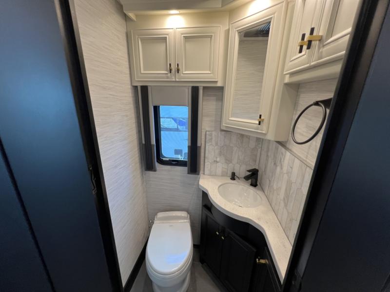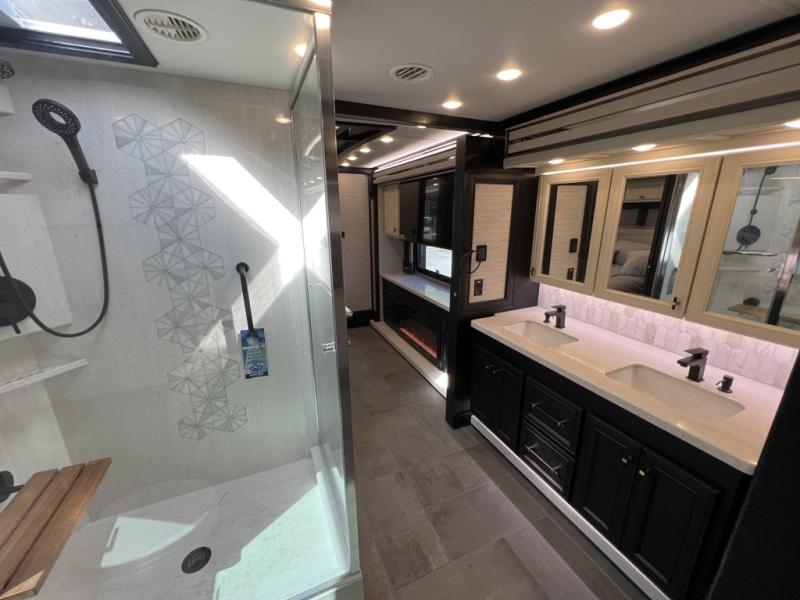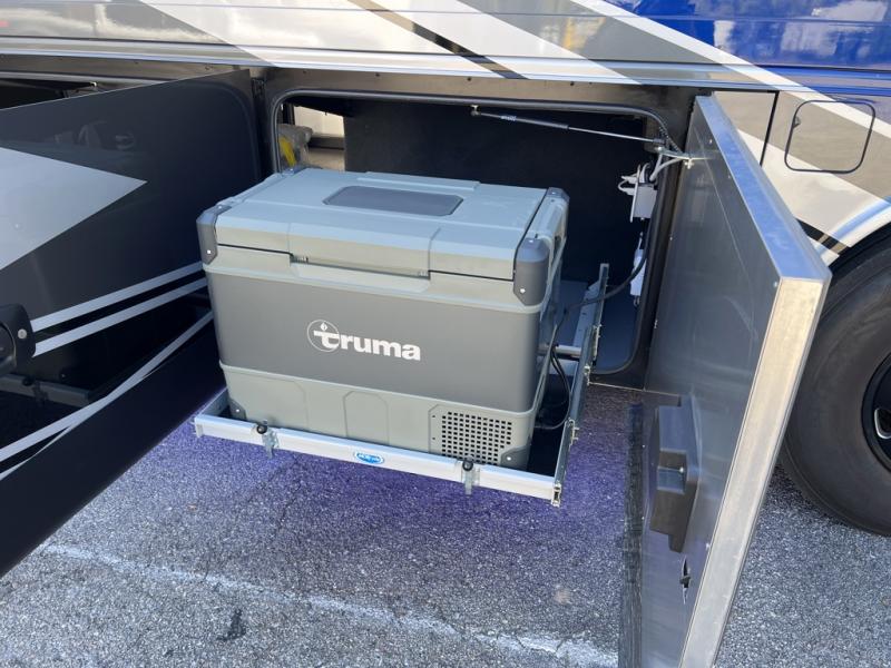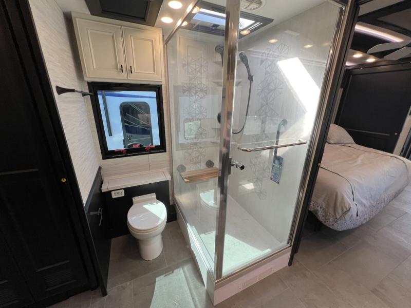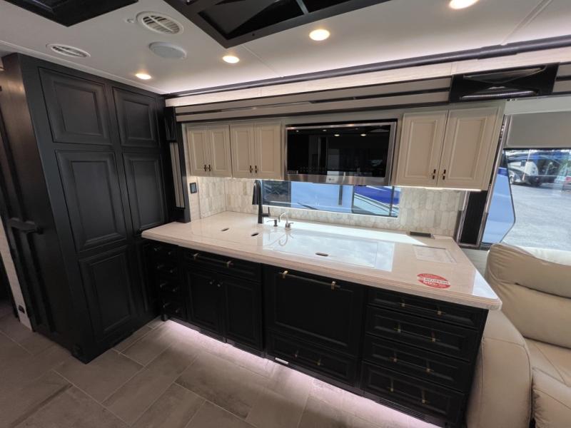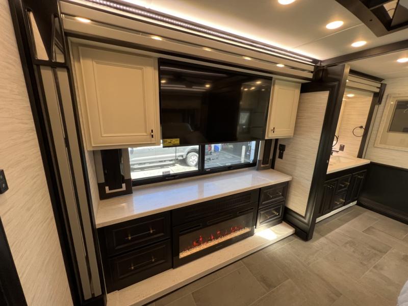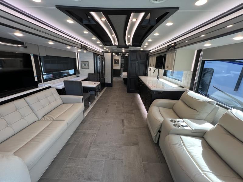 Fours slides, a bath and a half, plus sleeping space for six make this coach family friendly. There are two sofa beds in the main living area, plus a lift TV for your favorite shows. The chef of your group can cook meals on the two burner induction cooktop or in the stainless steel convection microwave with an air fryer, and there is a drawer-type dishwasher that will make clean up easier than ever. This model also includes a residential refrigerator plus pull-out storage and a stack of drawers for snacks galore. Enjoy a great night's rest on the king bed after traveling all day, and the full rear bath will allow you to clean up in luxury. There is even a floor-to-ceiling closet for maximum storage and a stacked washer and dryer; how convenient!